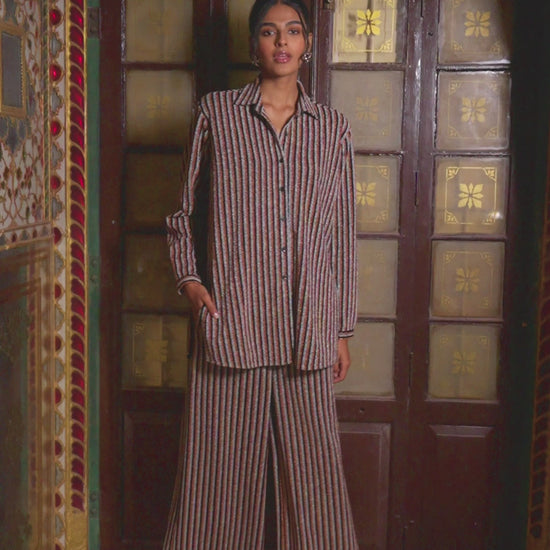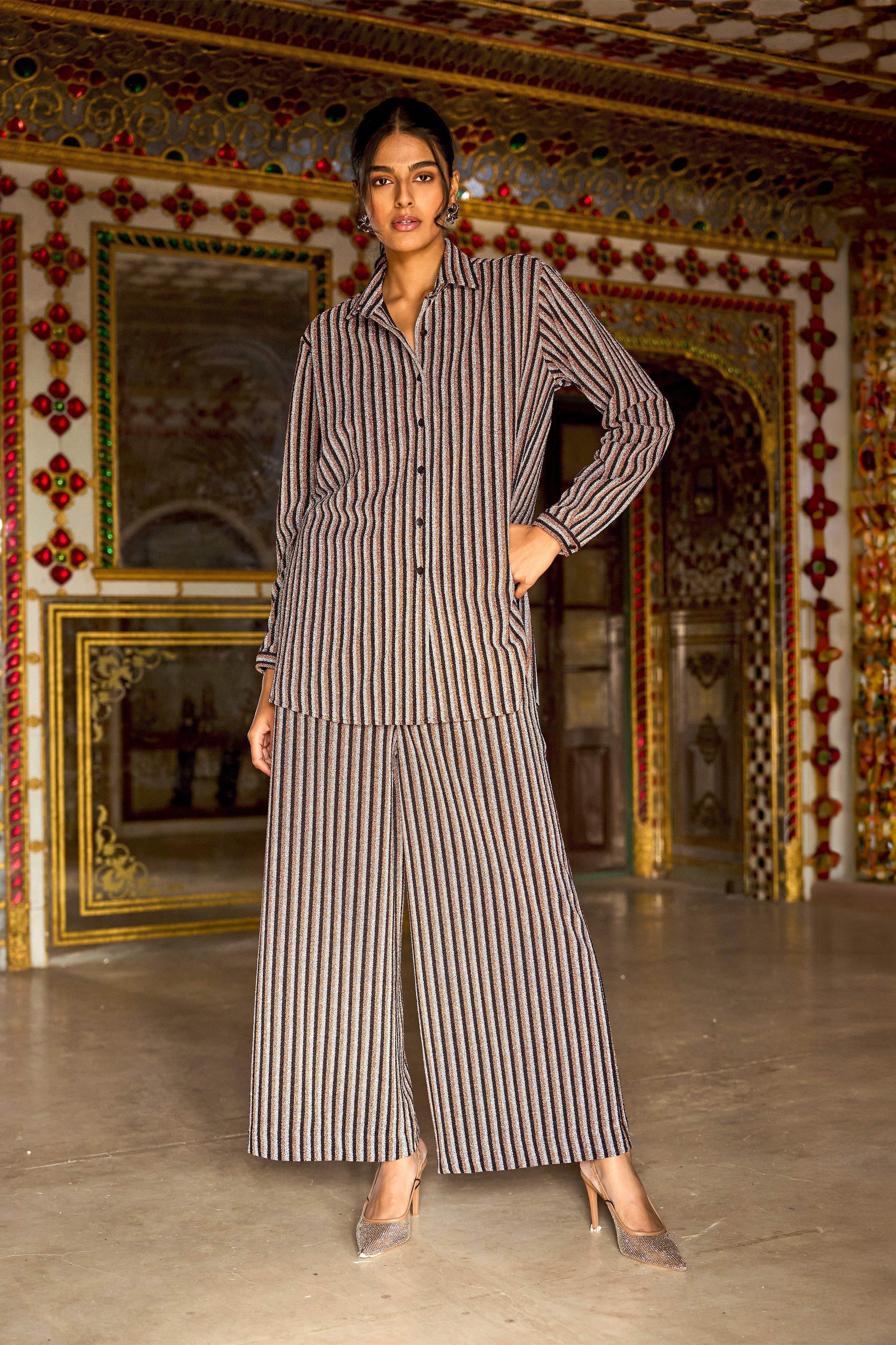 Stripe shimmer knit shirt in tones of black, silver and copper. Full sleeves. Button down front. Paired with matching flared pants. Semi-elasticated waist with front zip and hook-eye closure. Pockets in the side.