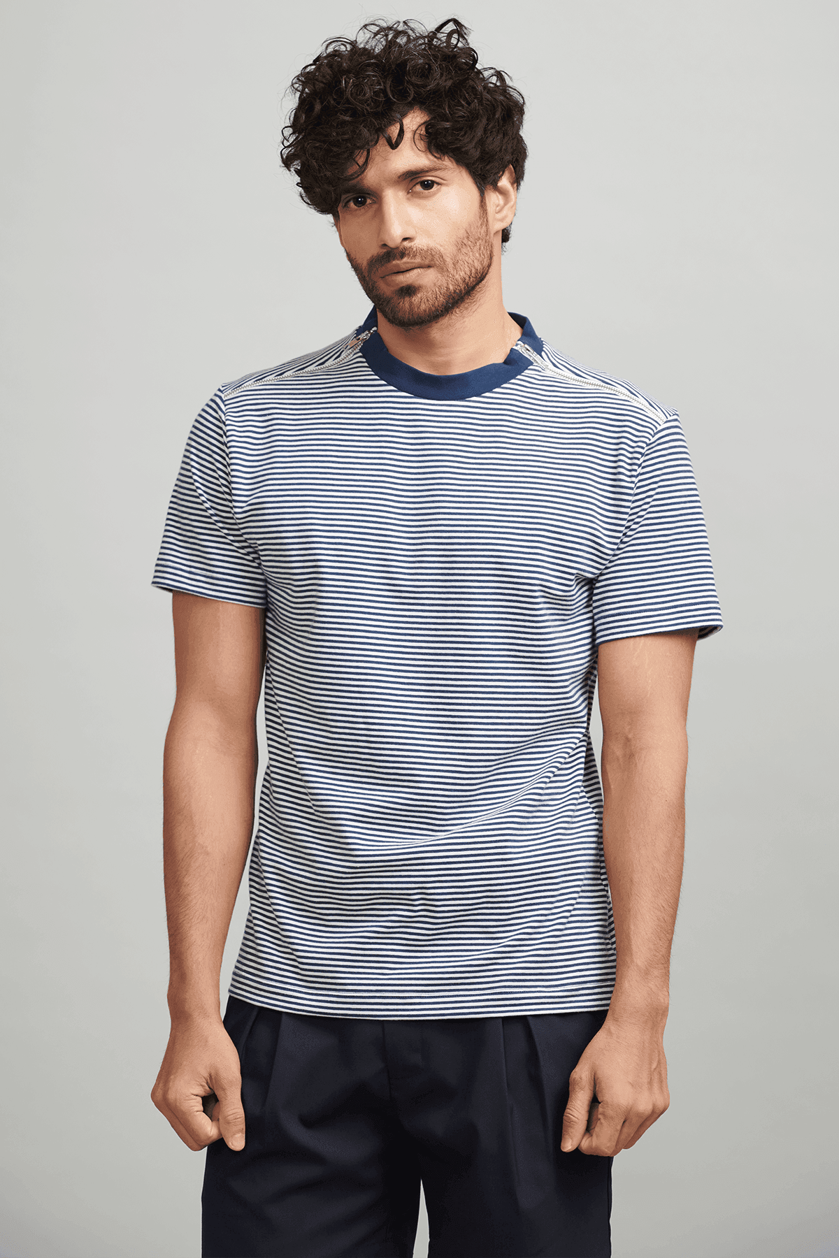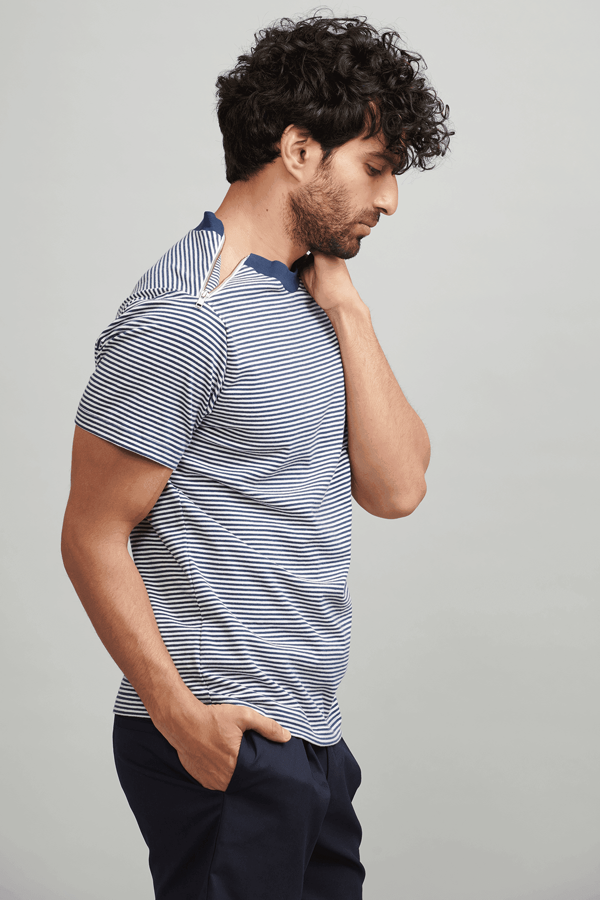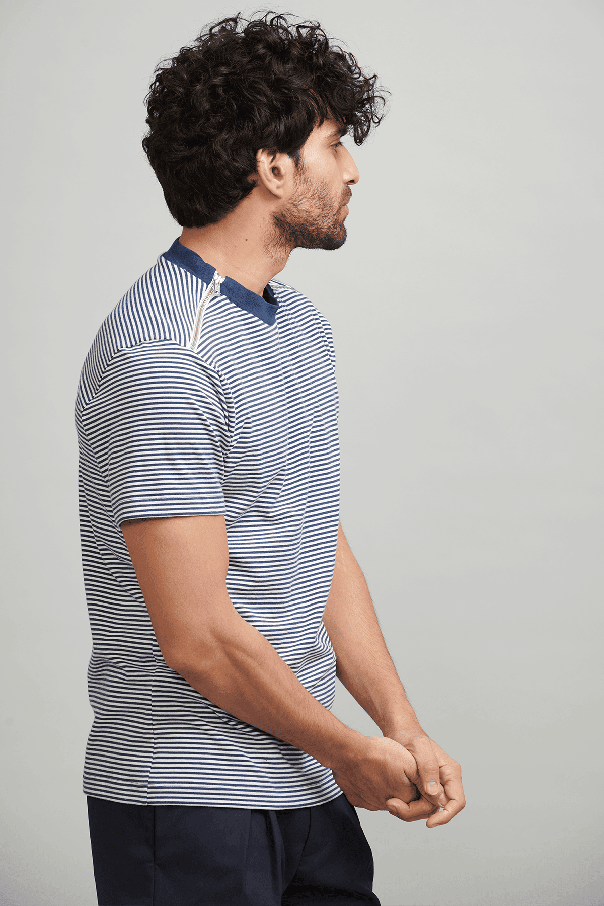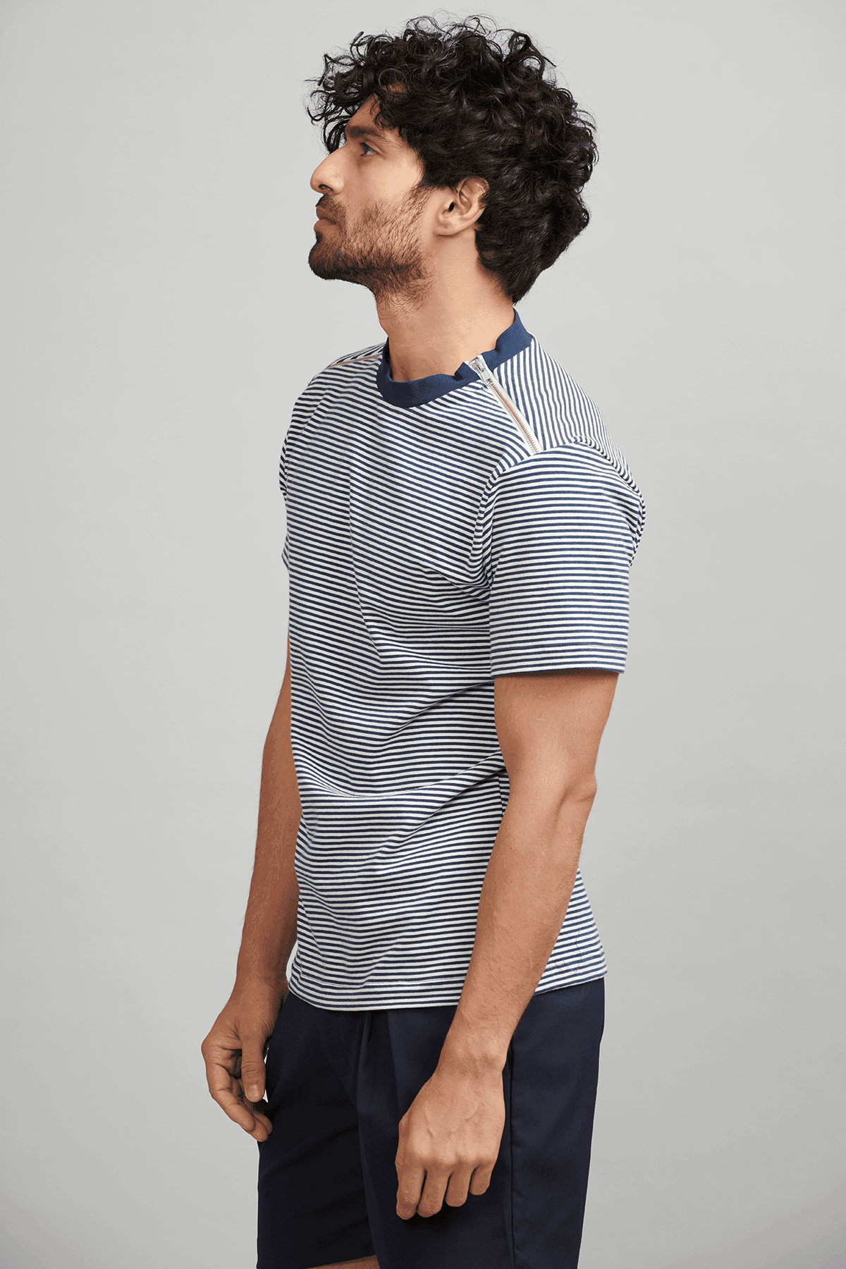 Round neck tee-shirt with rib at the neck. Contrast zip inserted from shoulder to neckline. Wear the zips as both open, one open, or both closed.