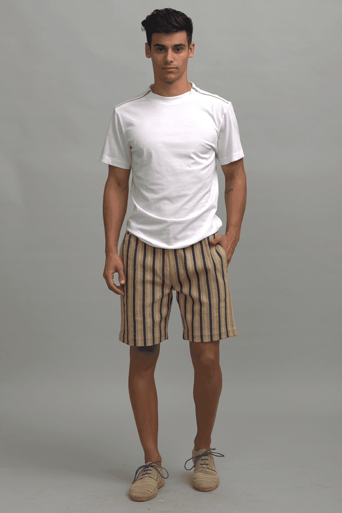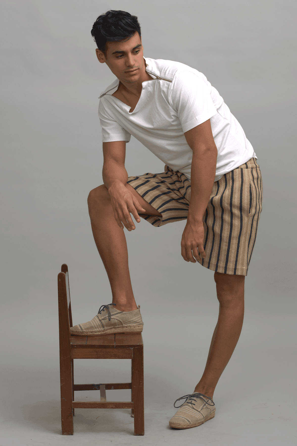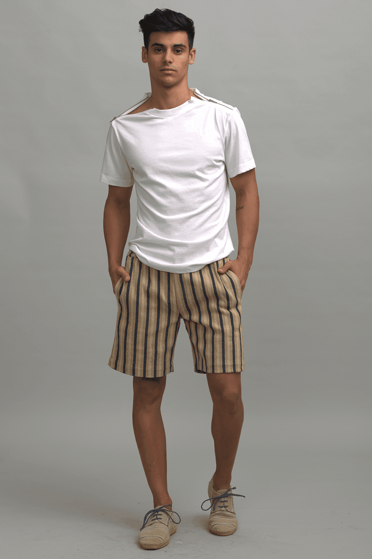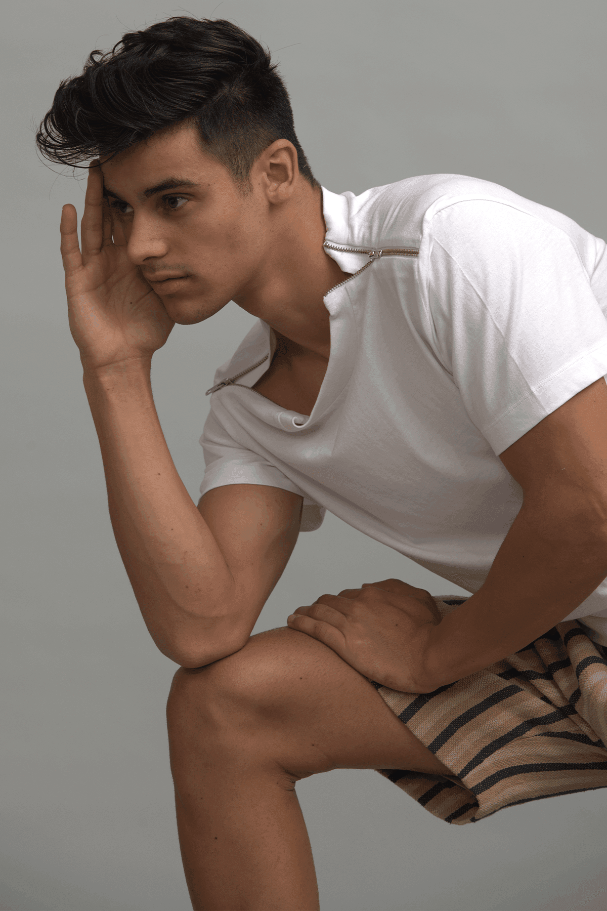 Round neck tee-shirt with rib at the neck. Contrast zip inserted from shoulder to neckline. Wear the zips as both open, one open, or both closed.