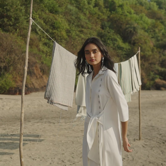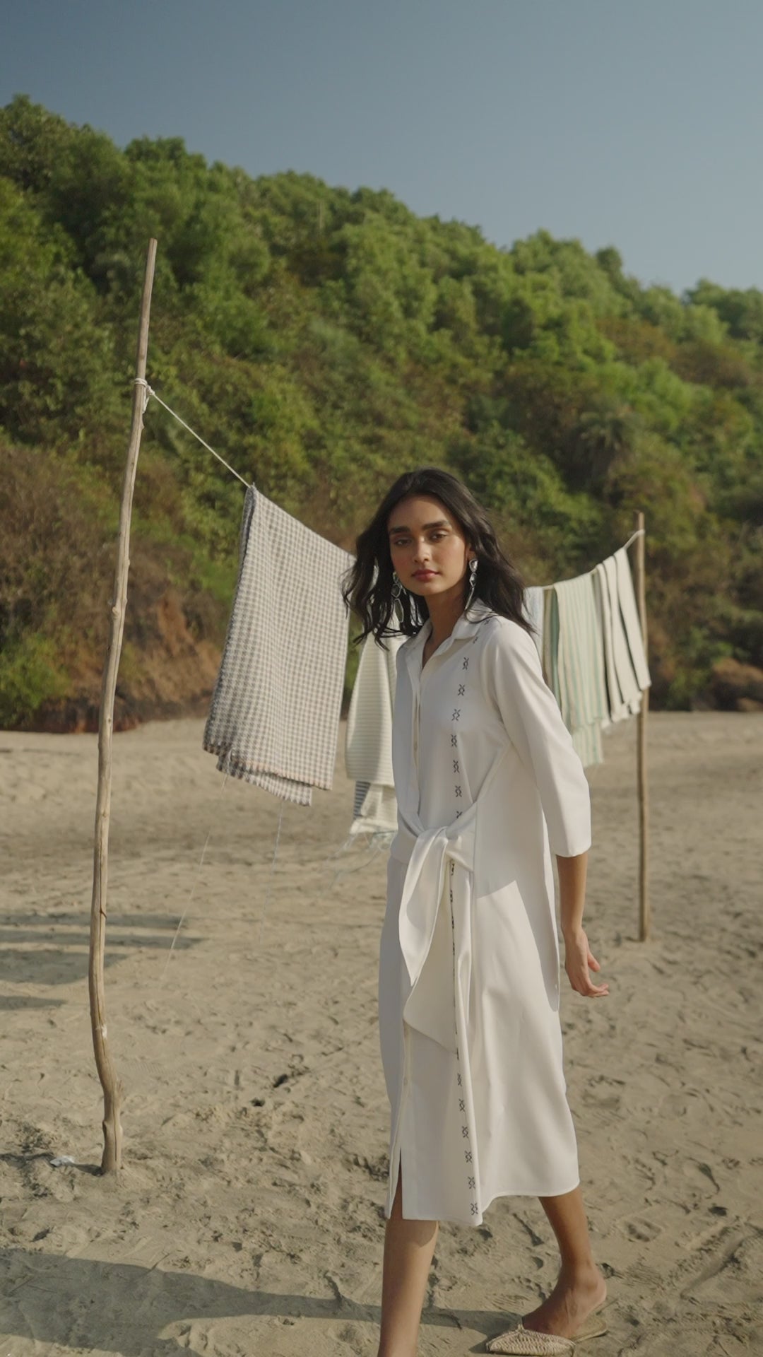 Ivory shirt dress in midi length with a side tie detailing off the centre front. Placed asymmetric hand applied cross stitch embroidery. Concealed button placket and slits on both sides. 3/4th sleeves.
