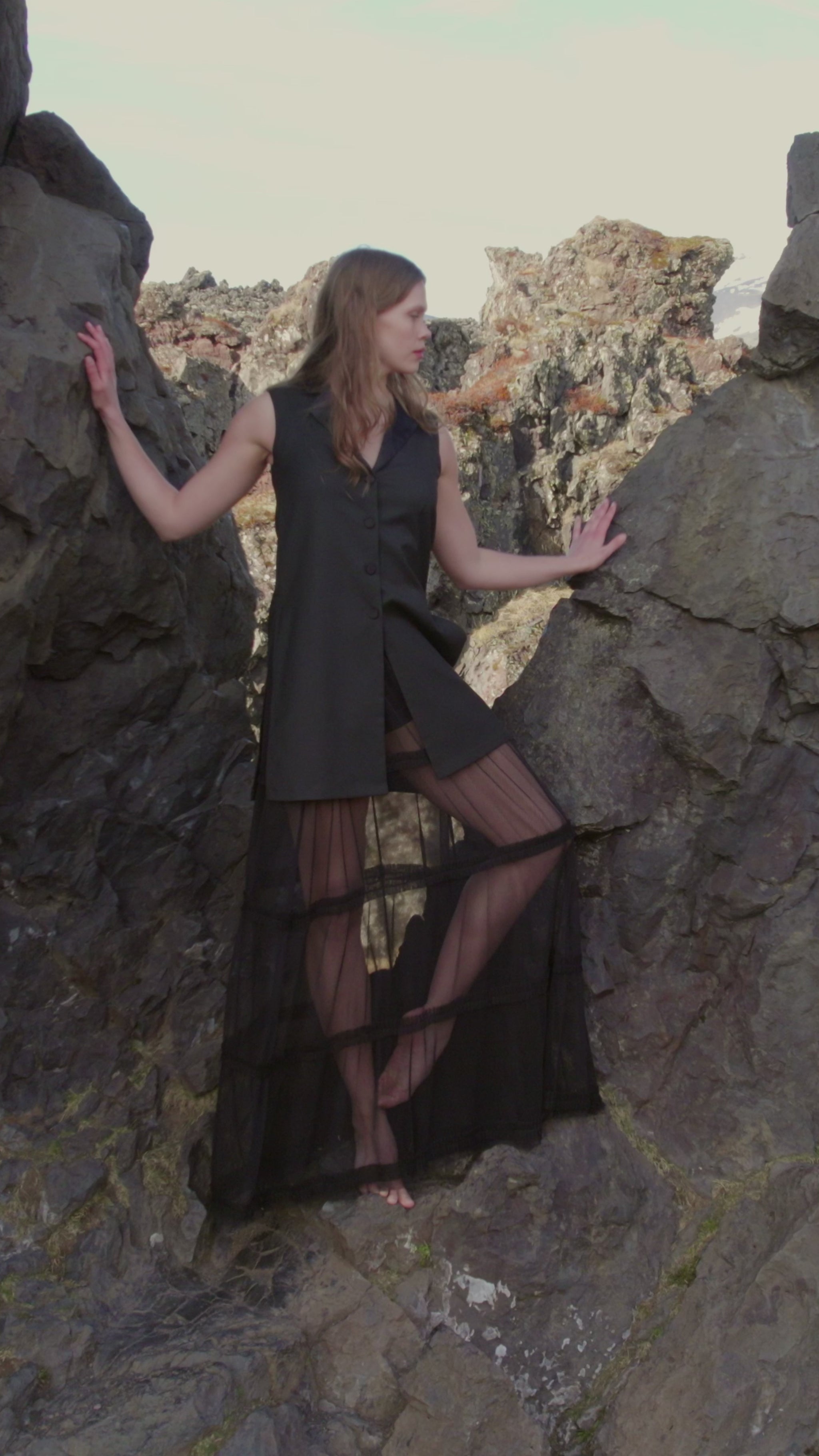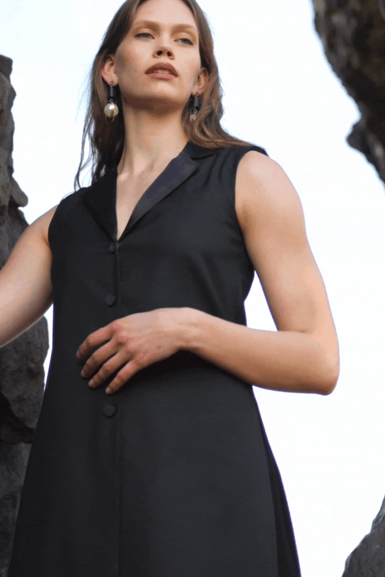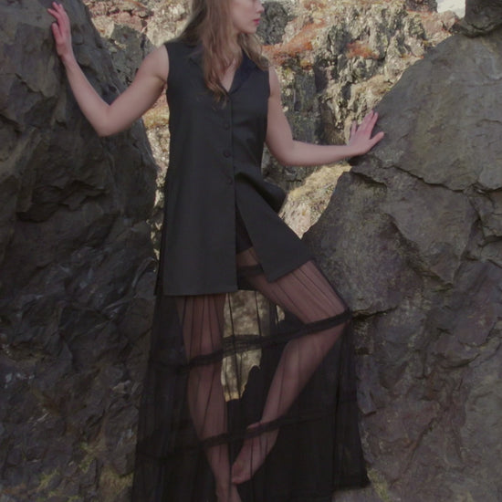 Longline sleeveless blazer in all weather suiting material. Satin notch collar and self fabric button closures in the front. Shoulder pads to enhance the structure and silhouette of the garment. Waist high slits on the sides.