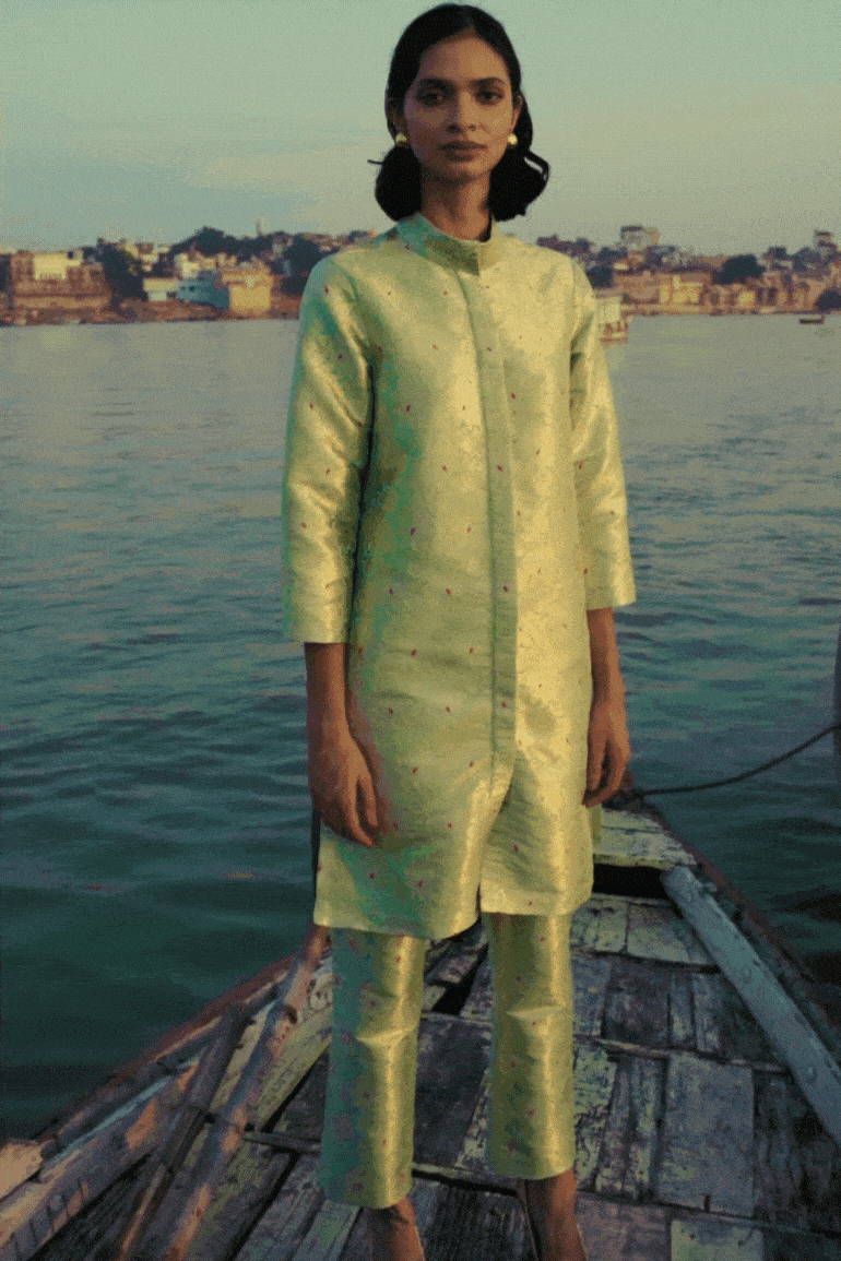 Longline straight fit top in mint green floral soft brocade fabric. Band collar. Concealed button placket. 3/4th sleeves. Slits on the sides. Paired with matching straight fit pants. Pockets on the side. Hook and zip closure at the front. Belt loops.