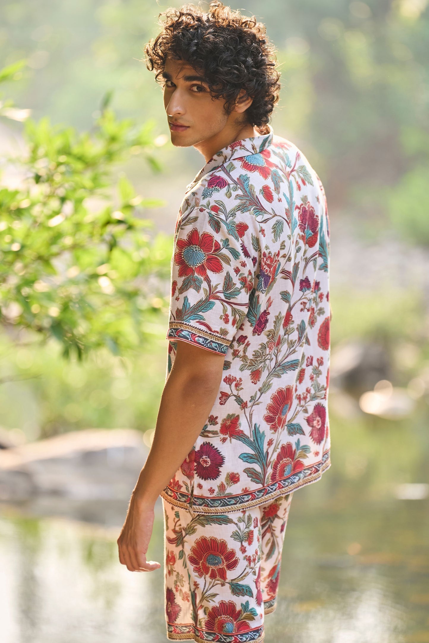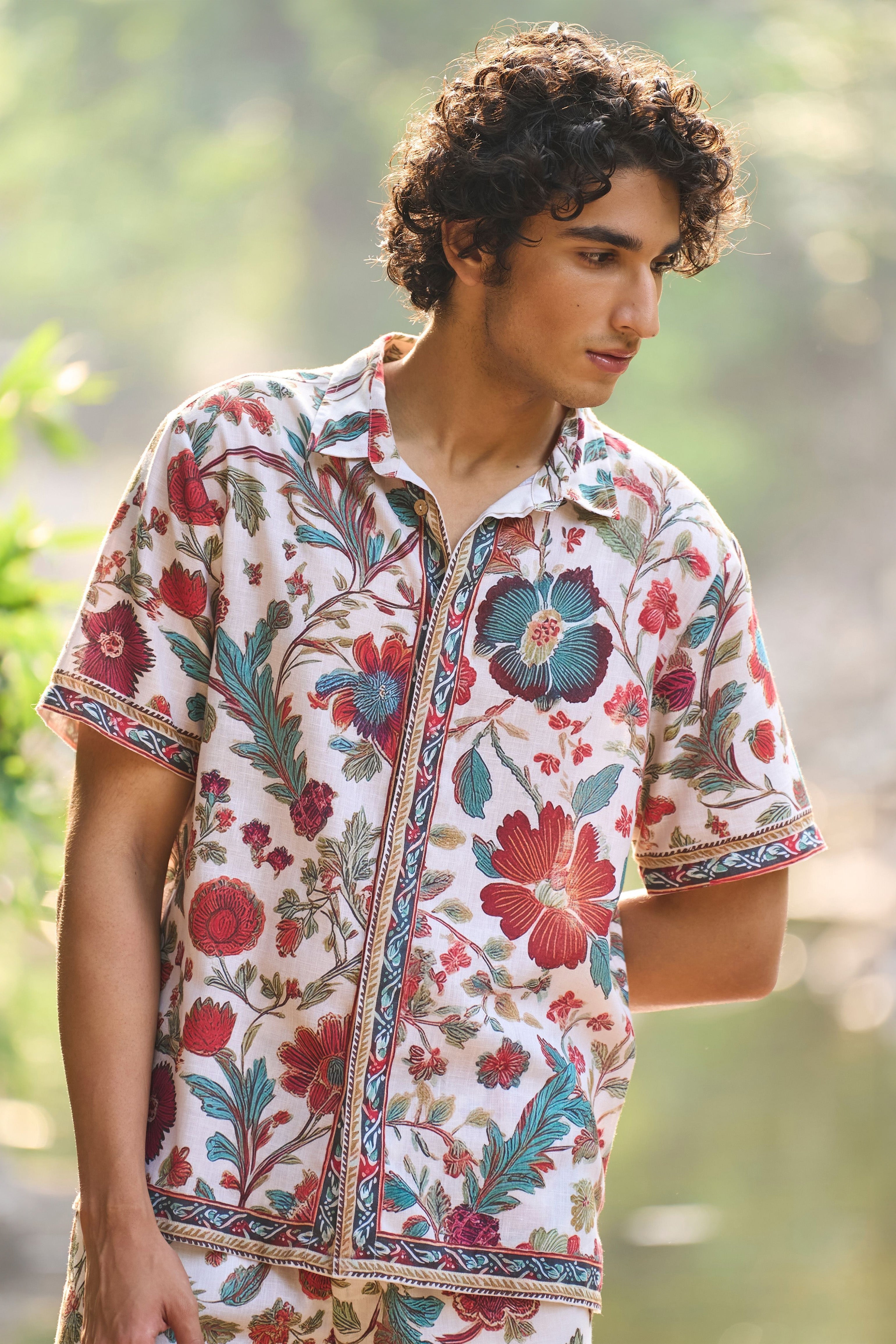 Block print inspired floral print with hand painted borders. Front button down shirt in a breathable linen blend. Concealed button placket.