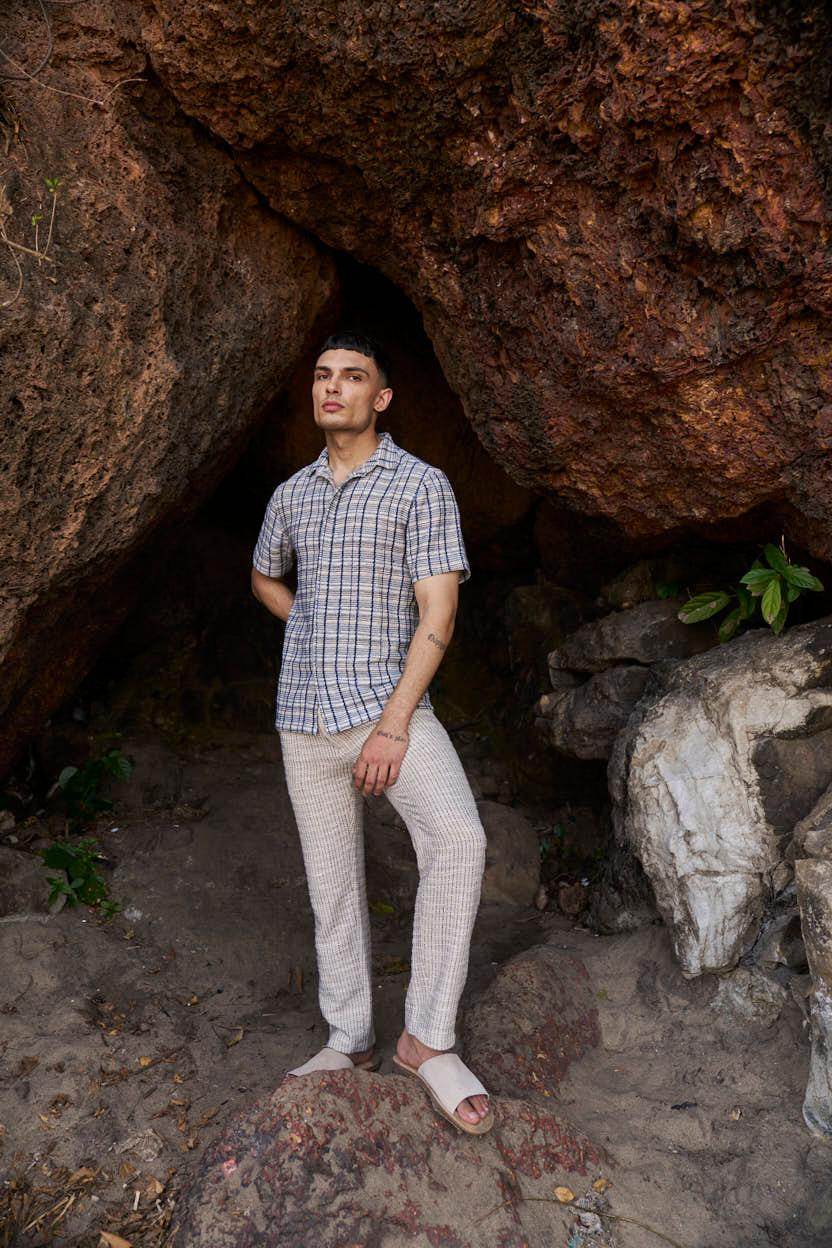 Half sleeve shirt in a 3D textured pattern. Twisted yarns in shades of blues and beige woven into an irregular check. Shirt collar, concealed button placket.