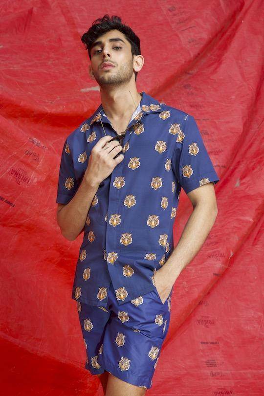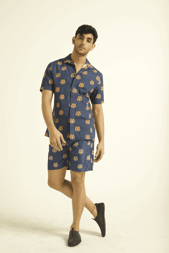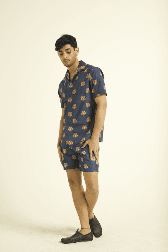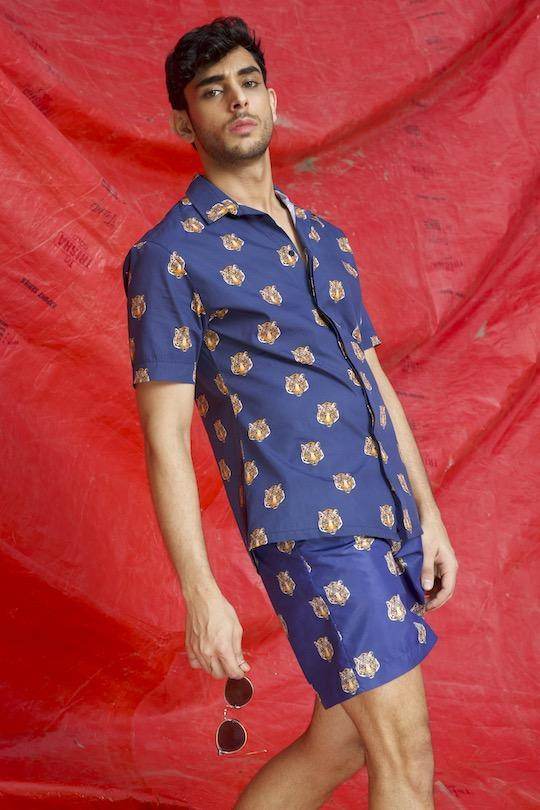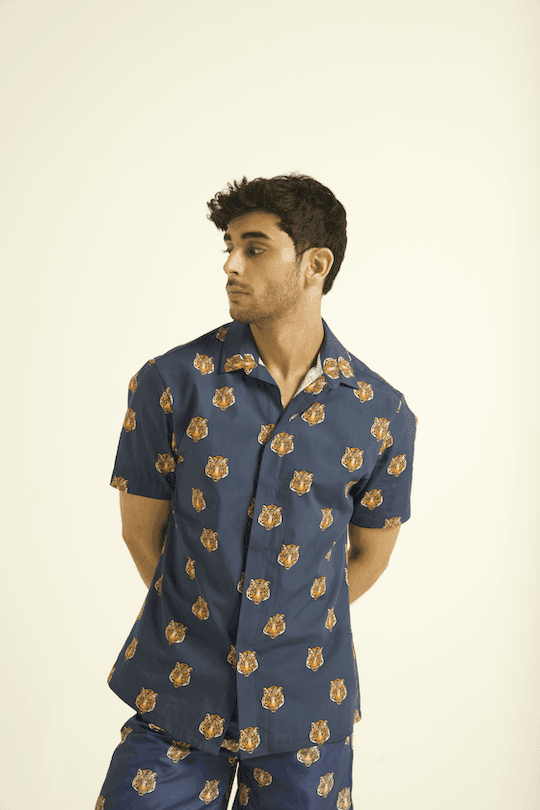 100% cotton poplin button-down shirt in tiger head print. Short sleeves. Regular fit.