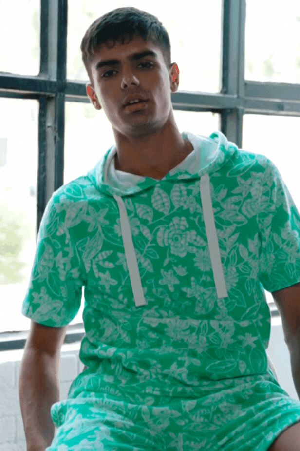 Half sleeve hoodie in patterned mint green and ivory towel terry. Drawstring detail at the collar. Kangaroo pockets in the front. Half sleeve, relaxed fit. Paired with matching shorts. Elasticated at the waist and drawstrings. Pockets on the sides and back. Relaxed fit.