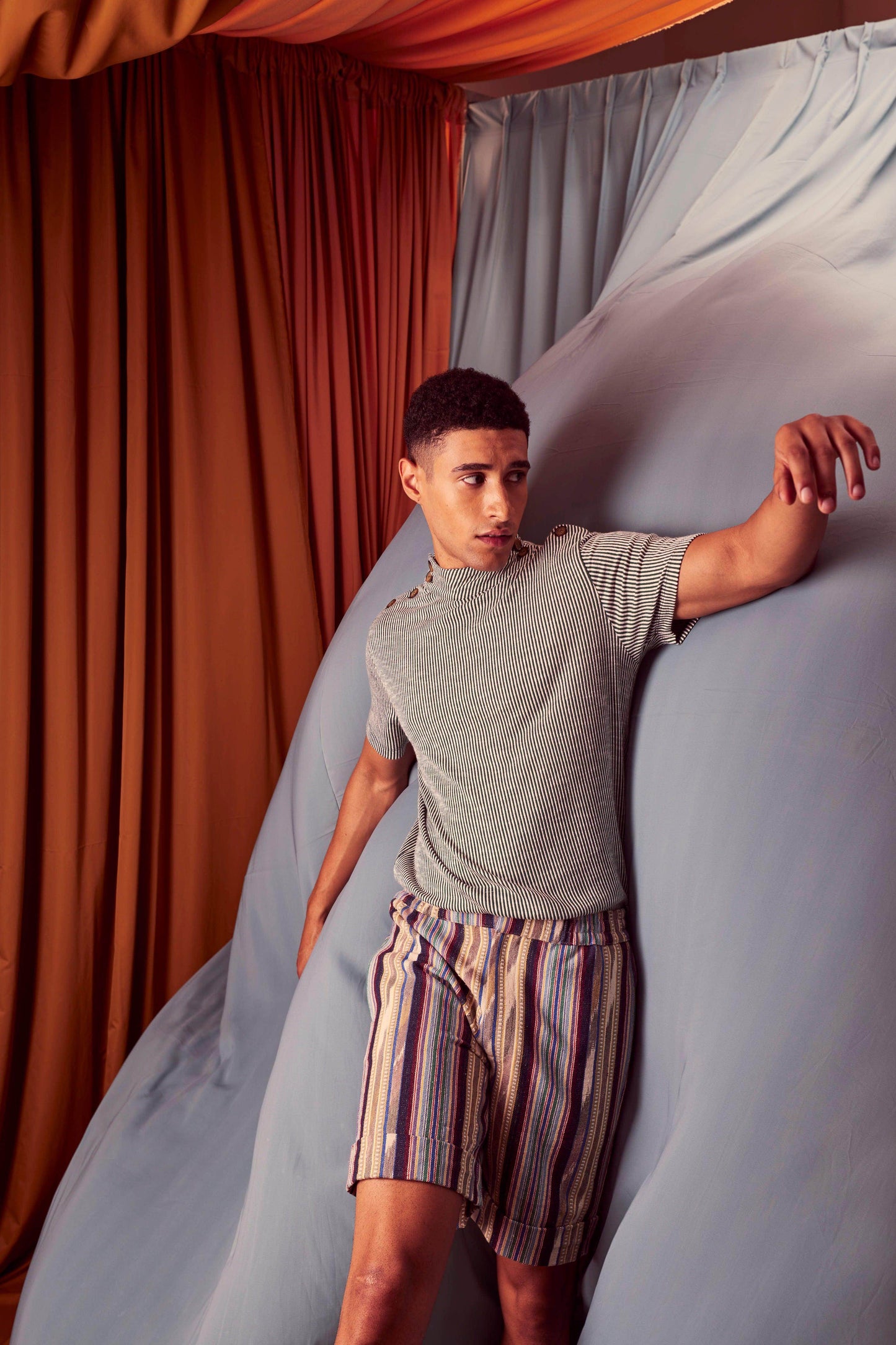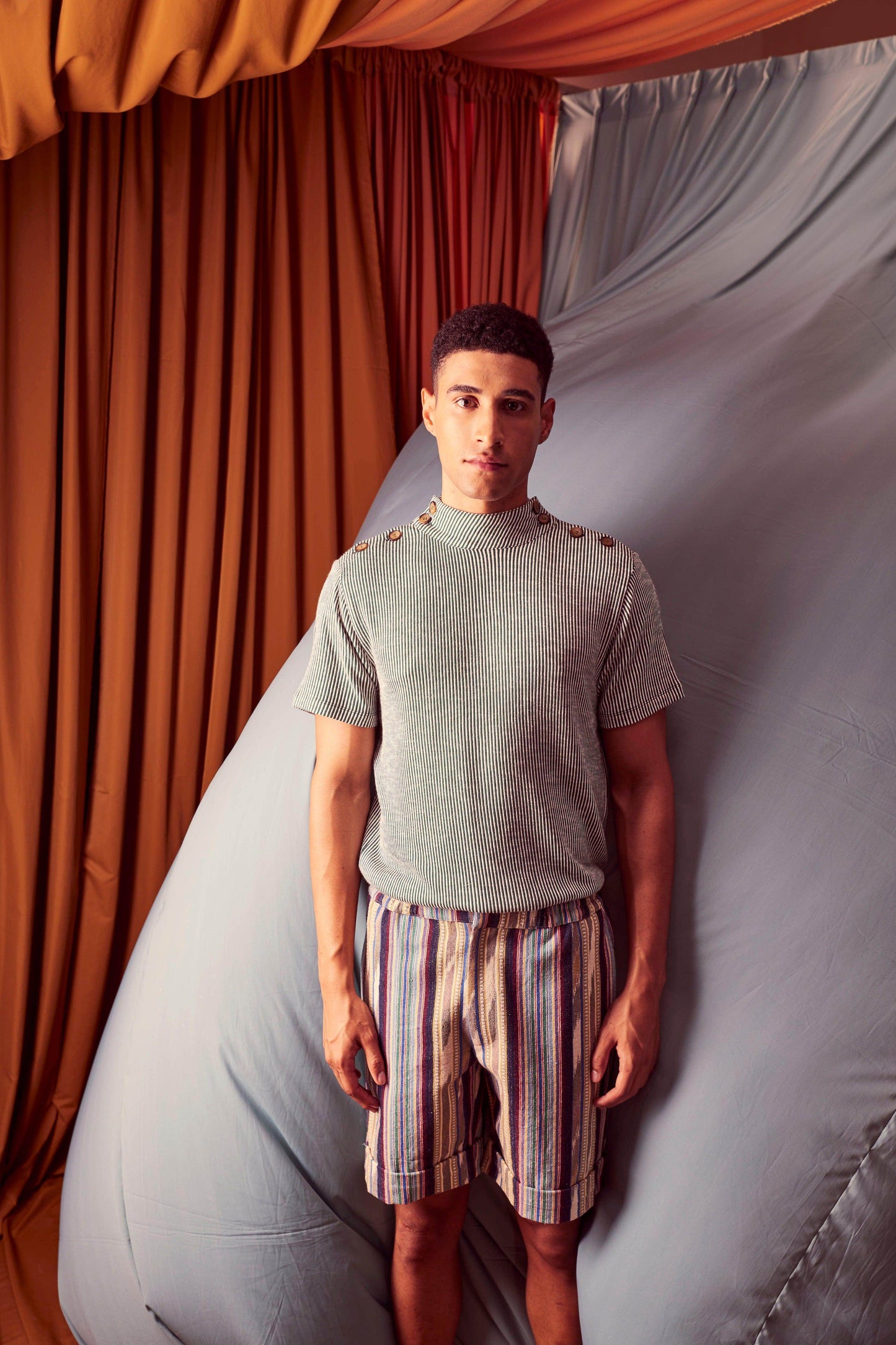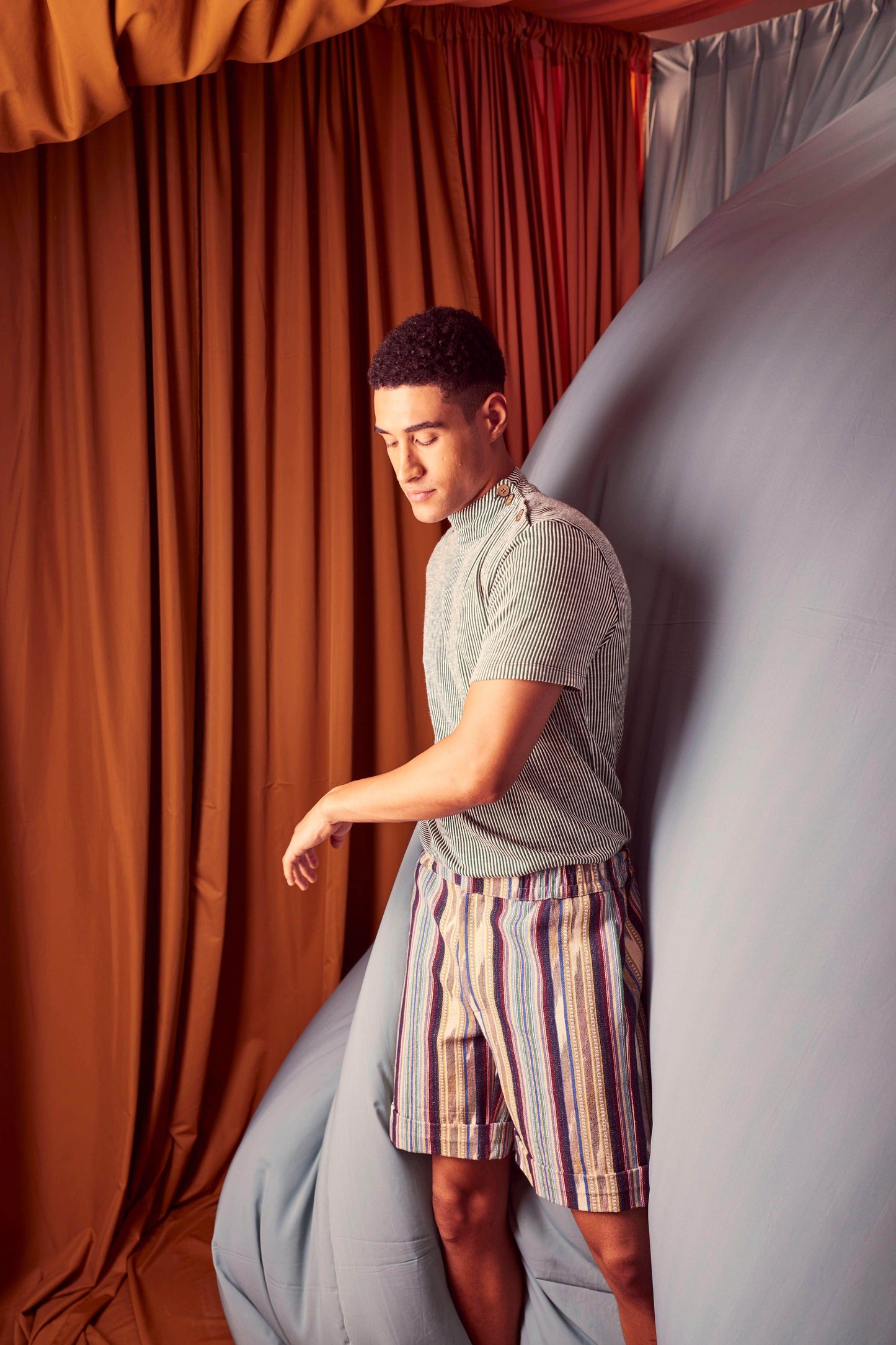 Tribal stripe patterned shorts. Hook closure at the front, pockets on the side and back, zip fly, semi elasticated at the waist. Turn up at the bottom hem.