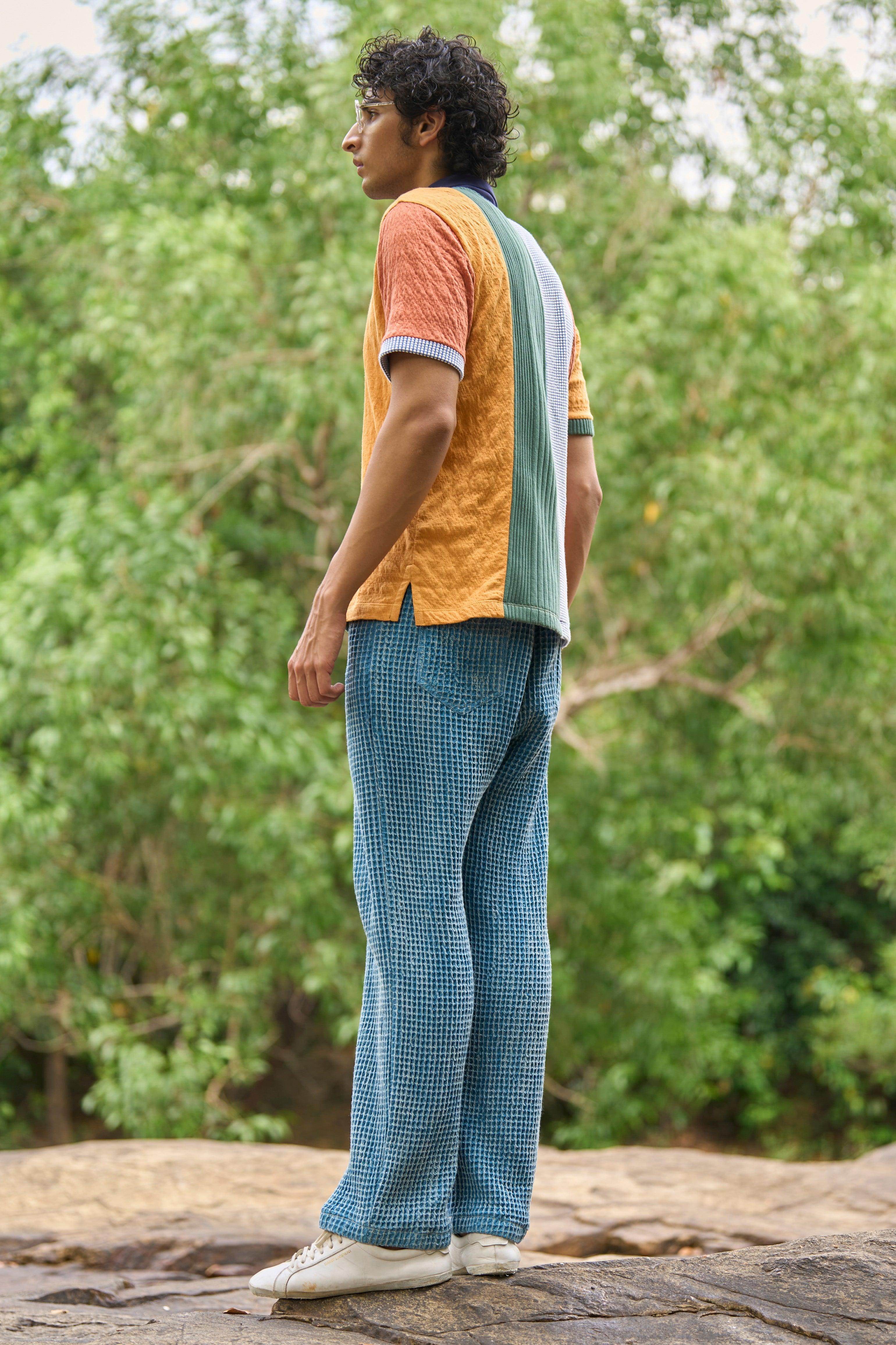 Straight cut blue pants in a washed textural organic cotton waffle. Cut similar to a 5 pocket jean (2 in the sides, 2 in the back + a coin pocket). Semi elasticated at the waist with belt loops. Zip and button closure in the front.