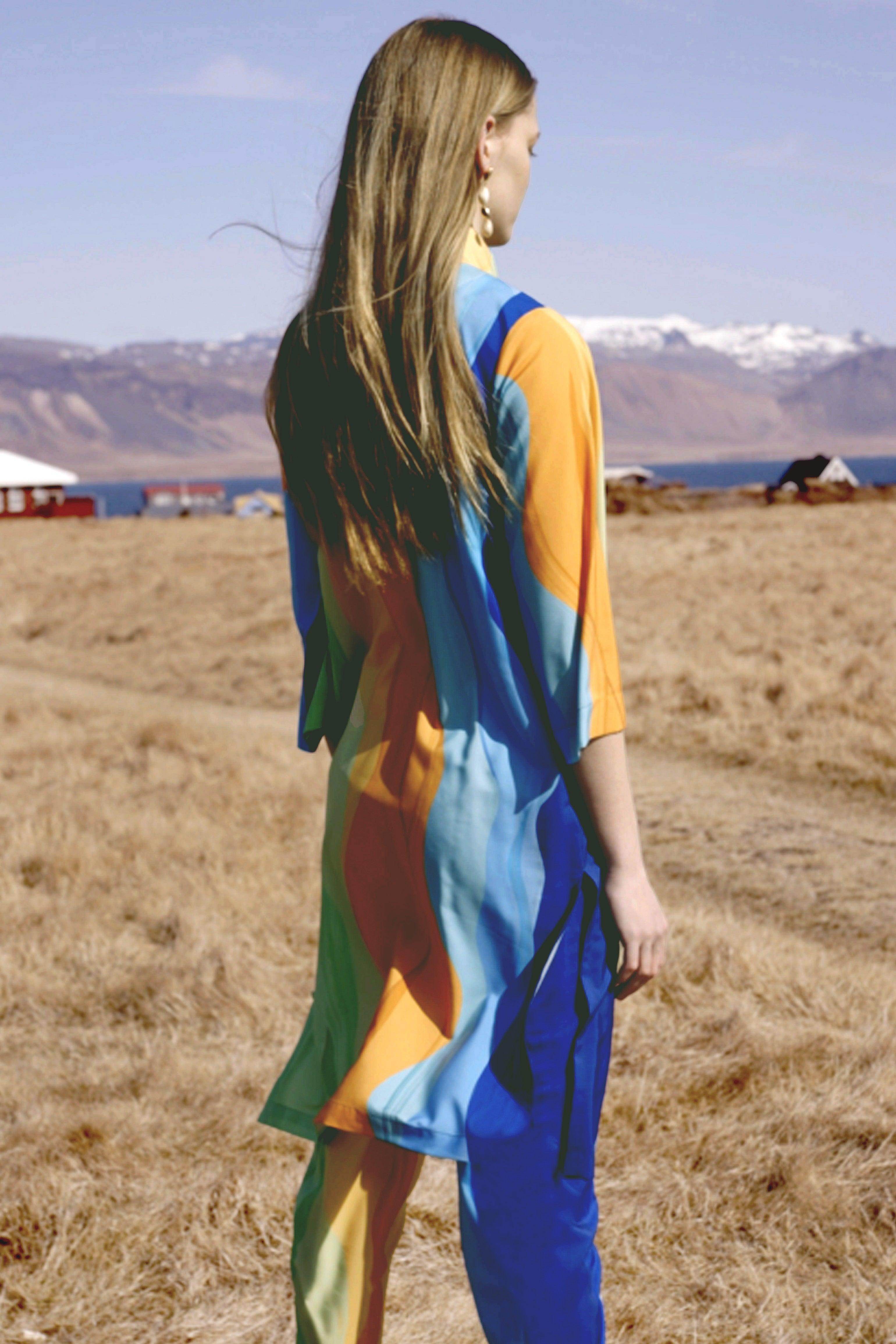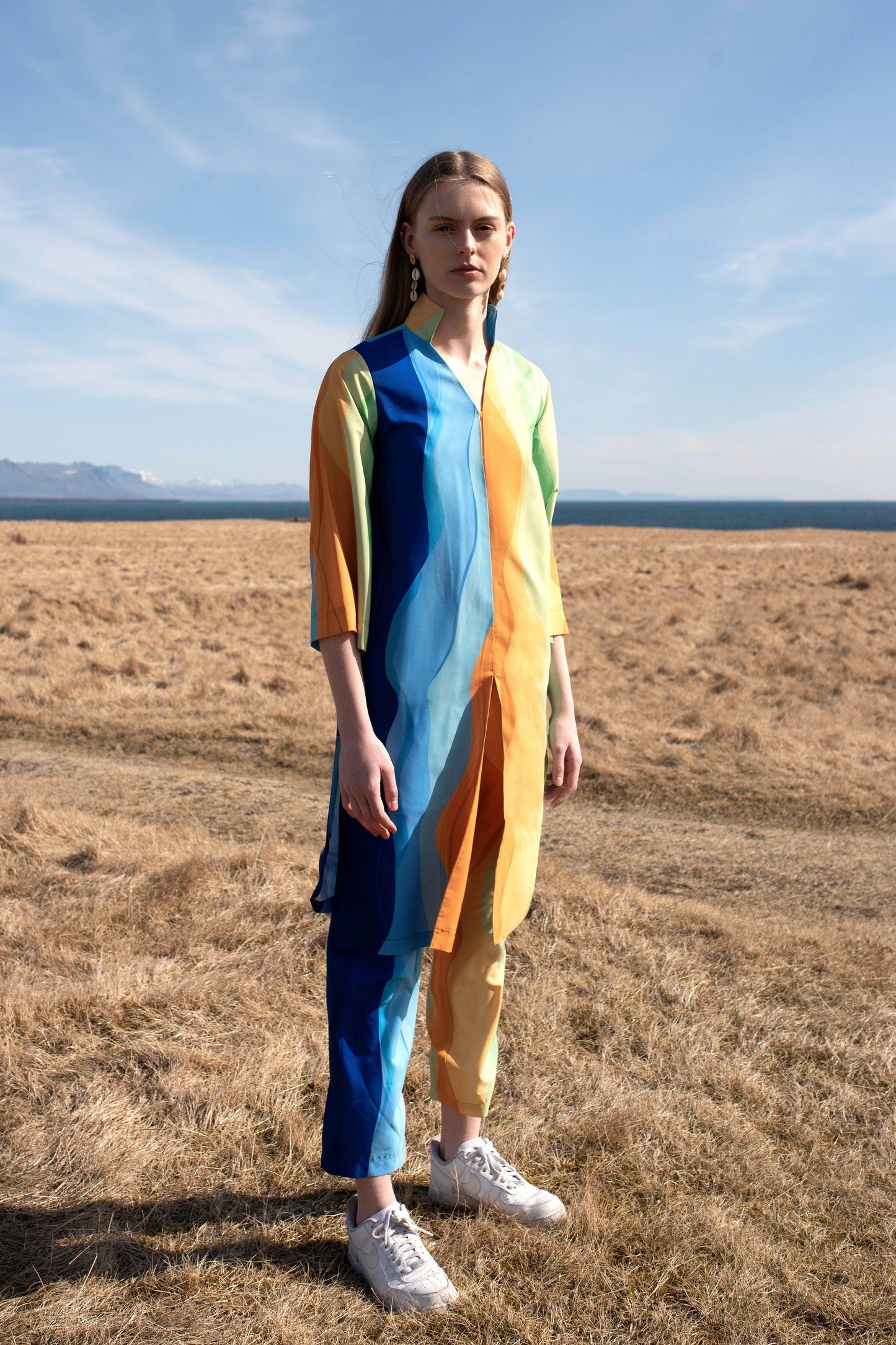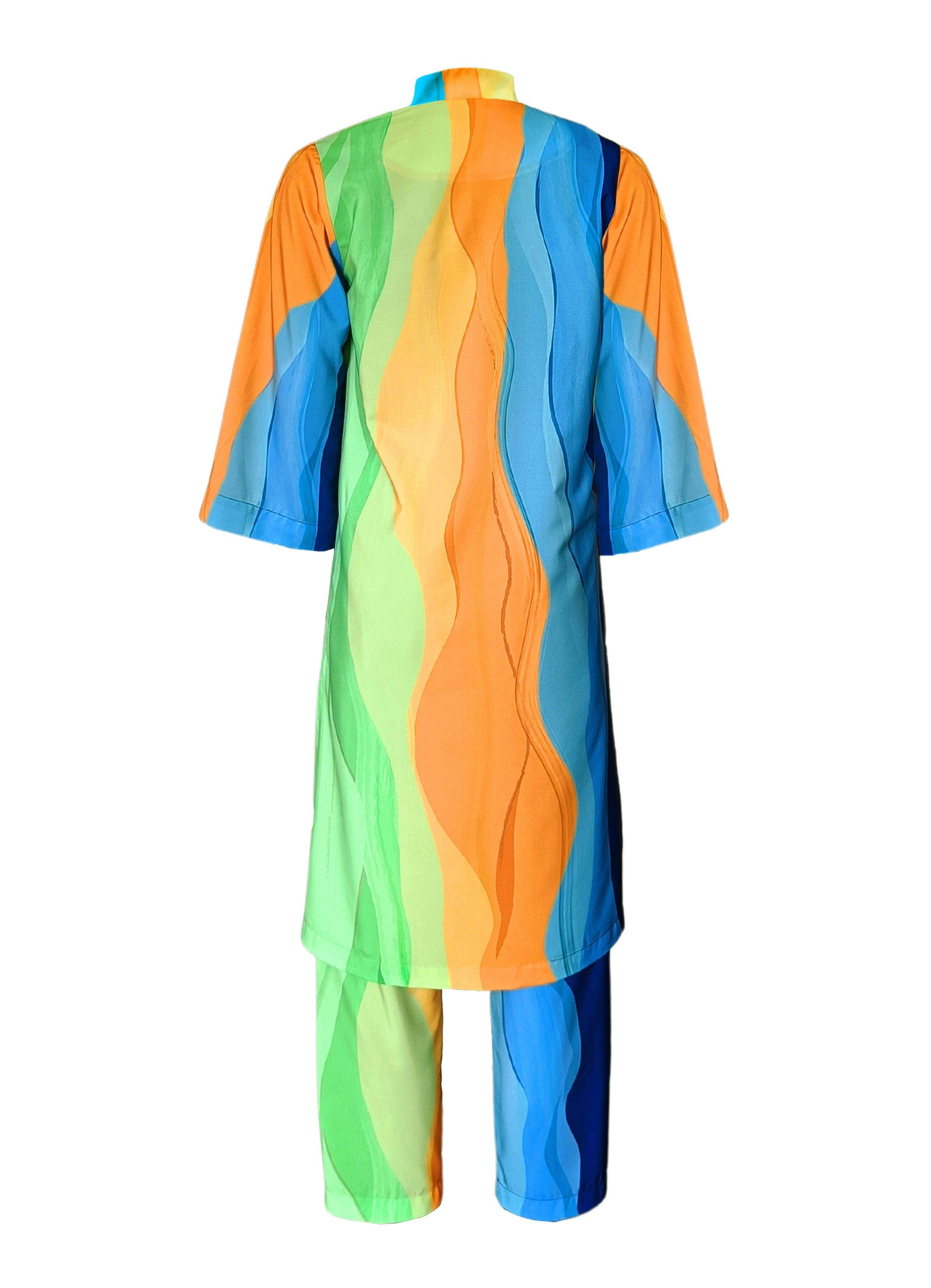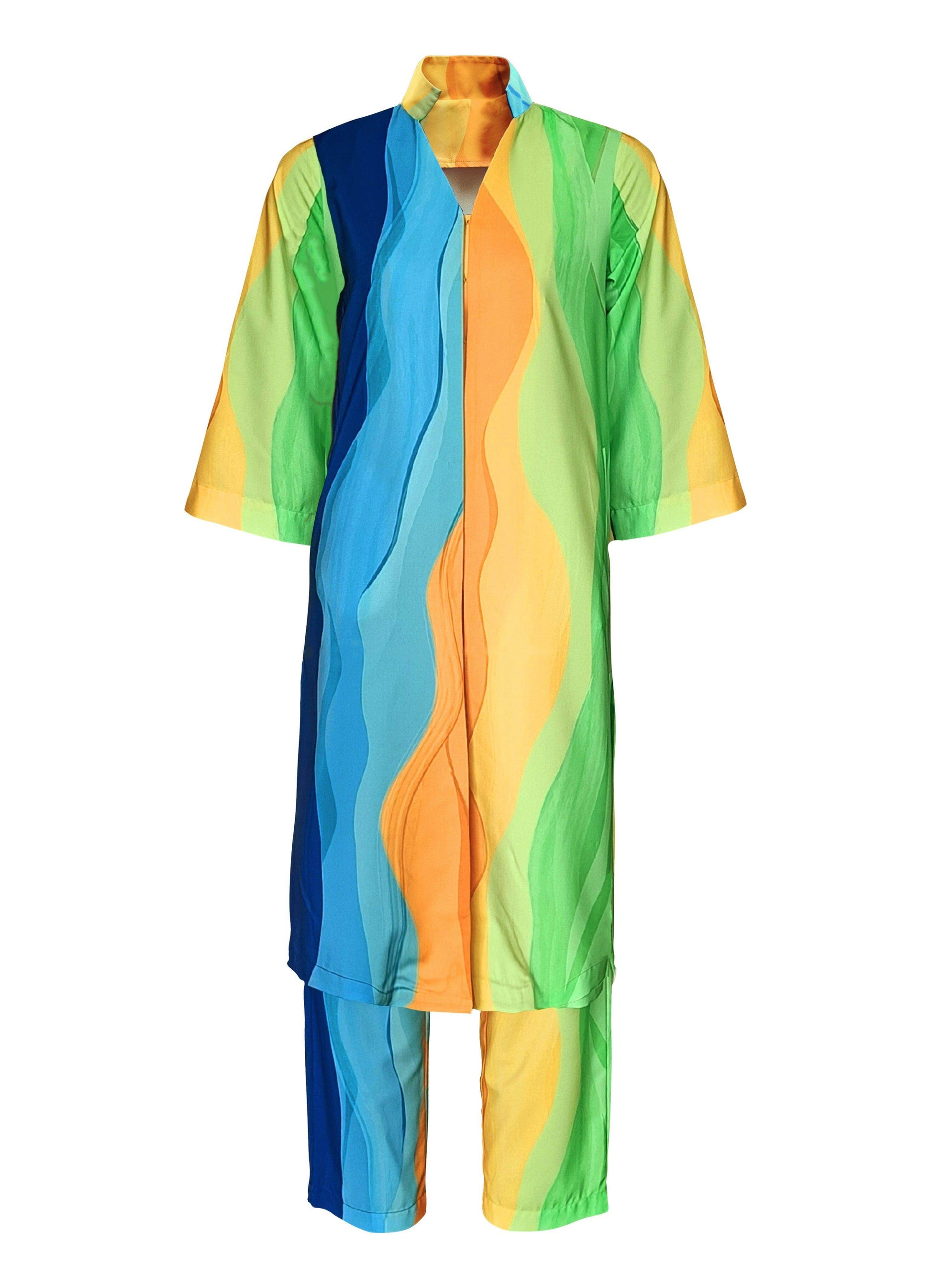 Pant set in hand-painted water colour inspired print. Longline top with a regular collar and V-neck. Hook and eye closure at the front. Pockets and slits on the sides. Can be worn as a top or a jacket.