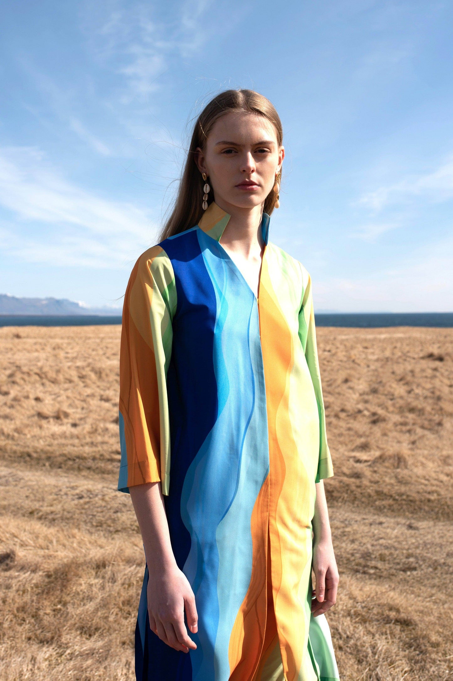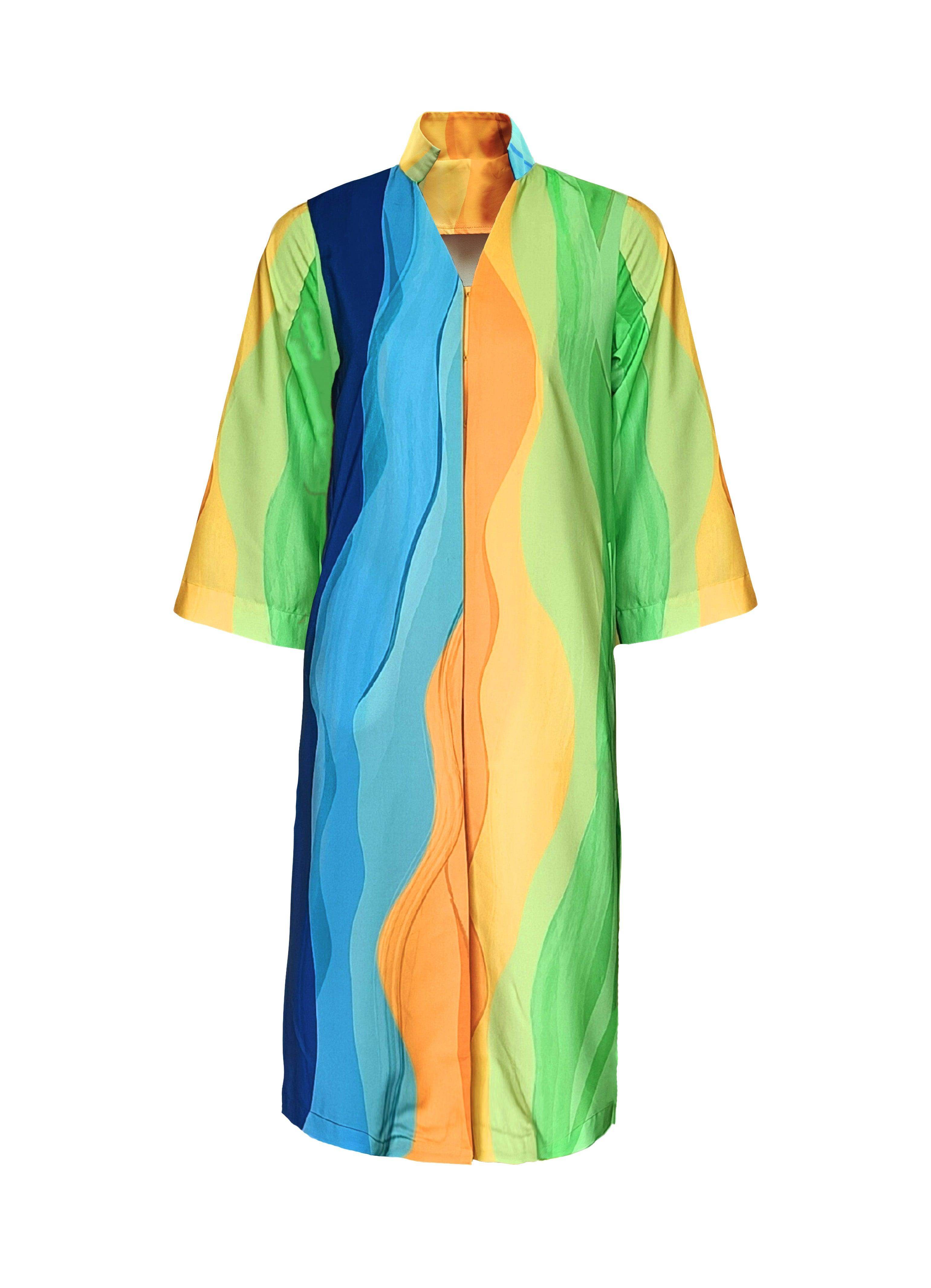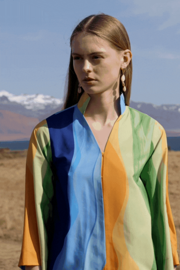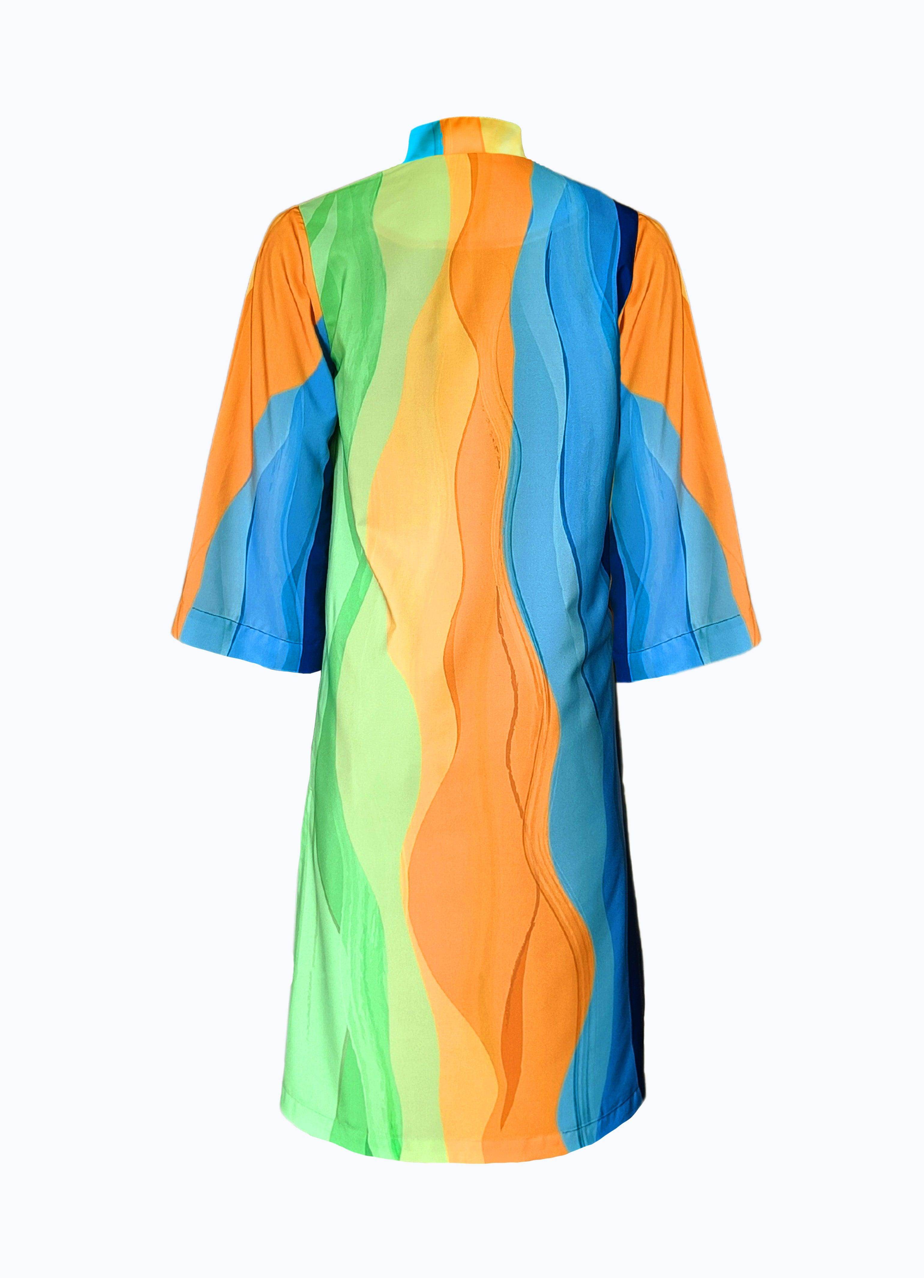 Pant set in hand-painted water colour inspired print. Longline top with a regular collar and V-neck. Hook and eye closure at the front. Pockets and slits on the sides. Can be worn as a top or a jacket.