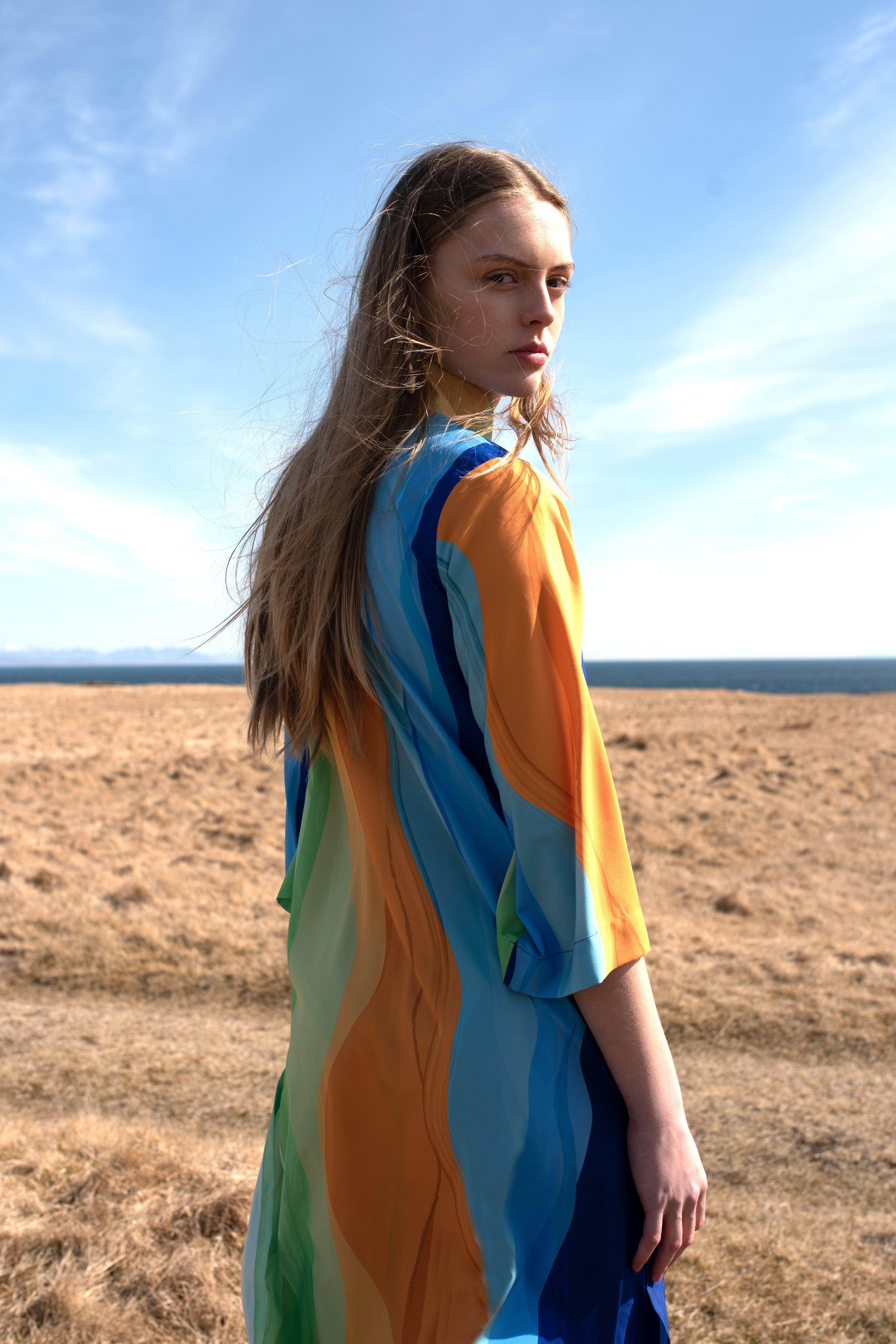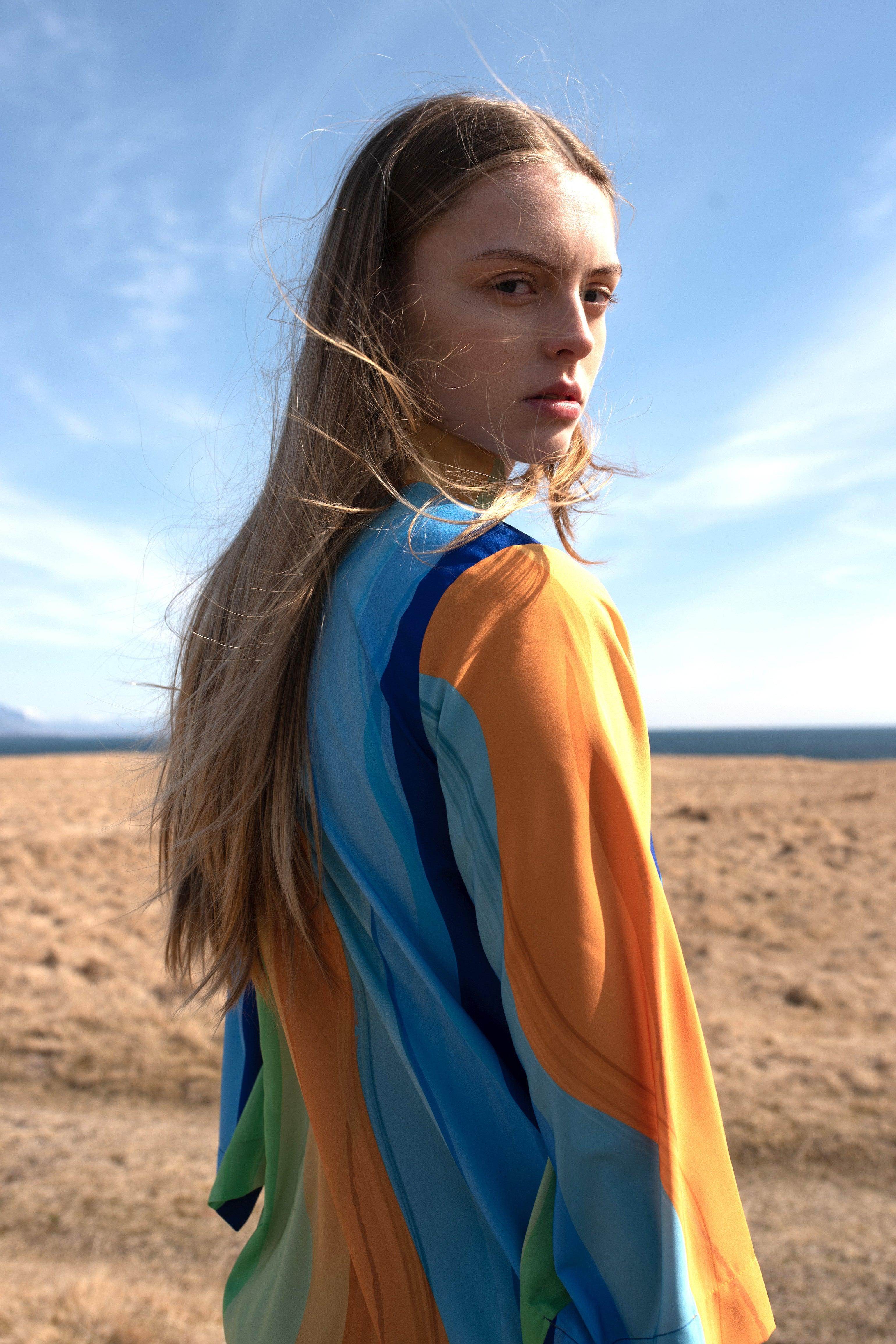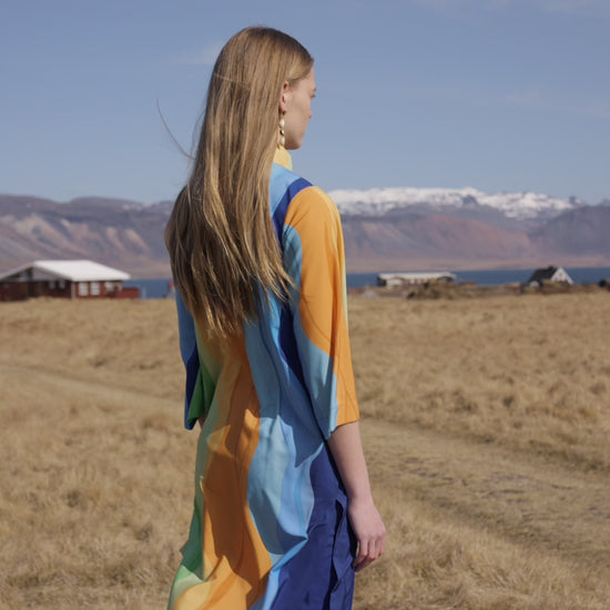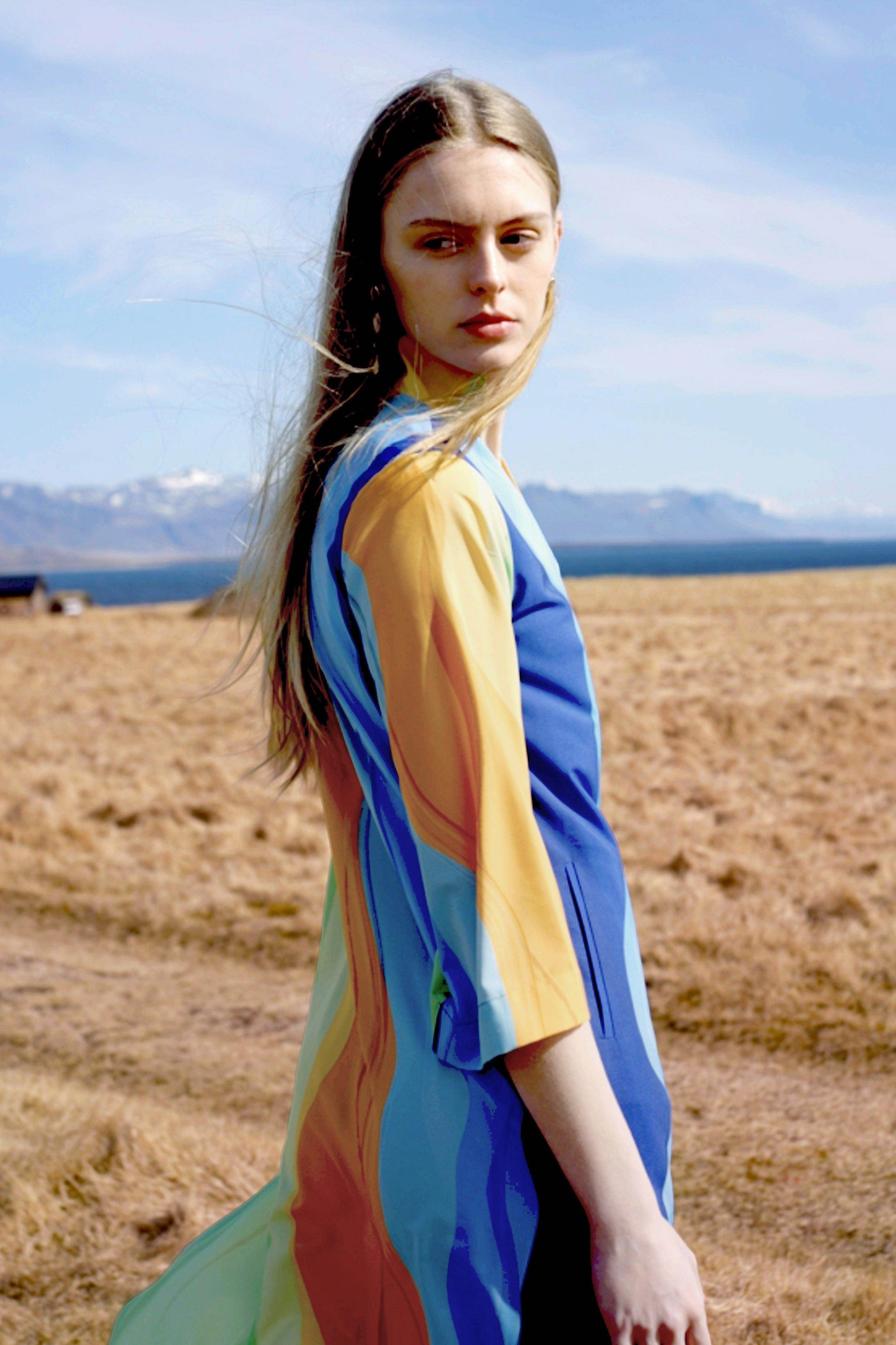 Pant set in hand-painted water colour inspired print. Longline top with a regular collar and V-neck. Hook and eye closure at the front. Pockets and slits on the sides. Can be worn as a top or a jacket.