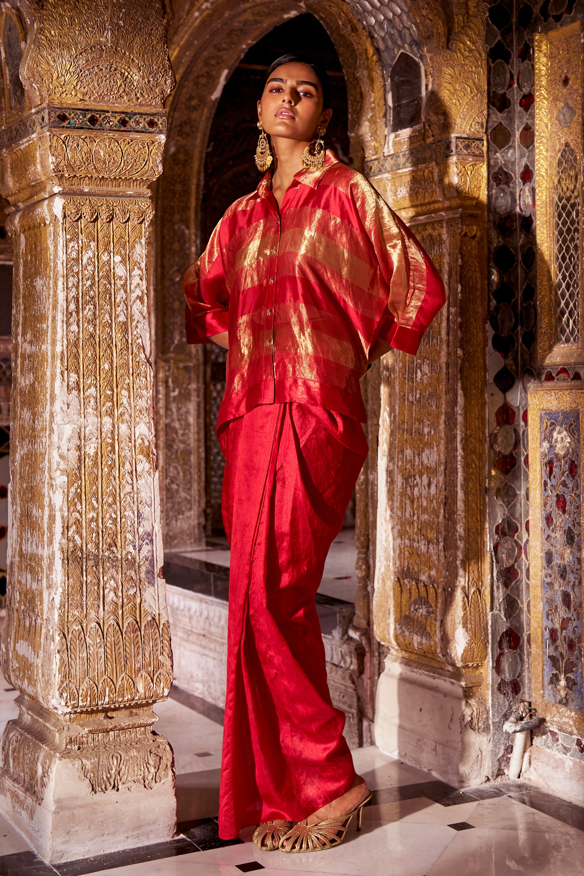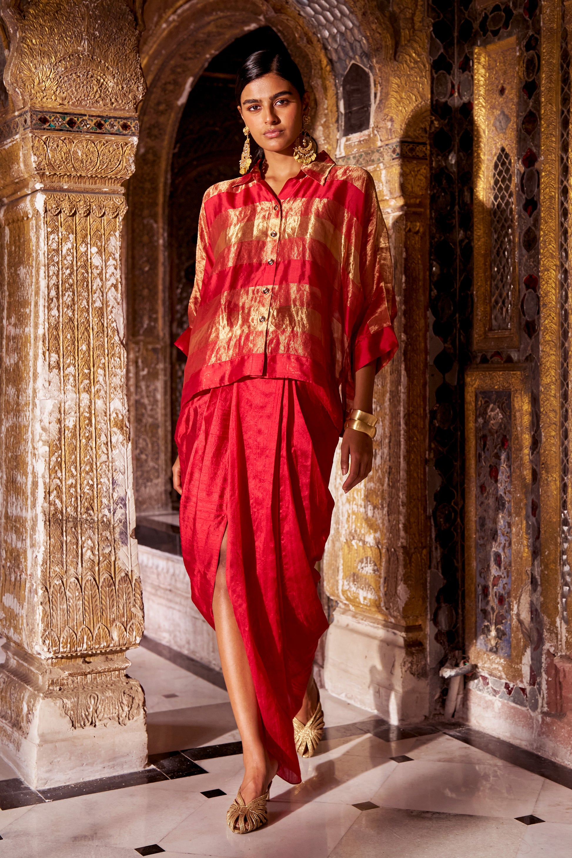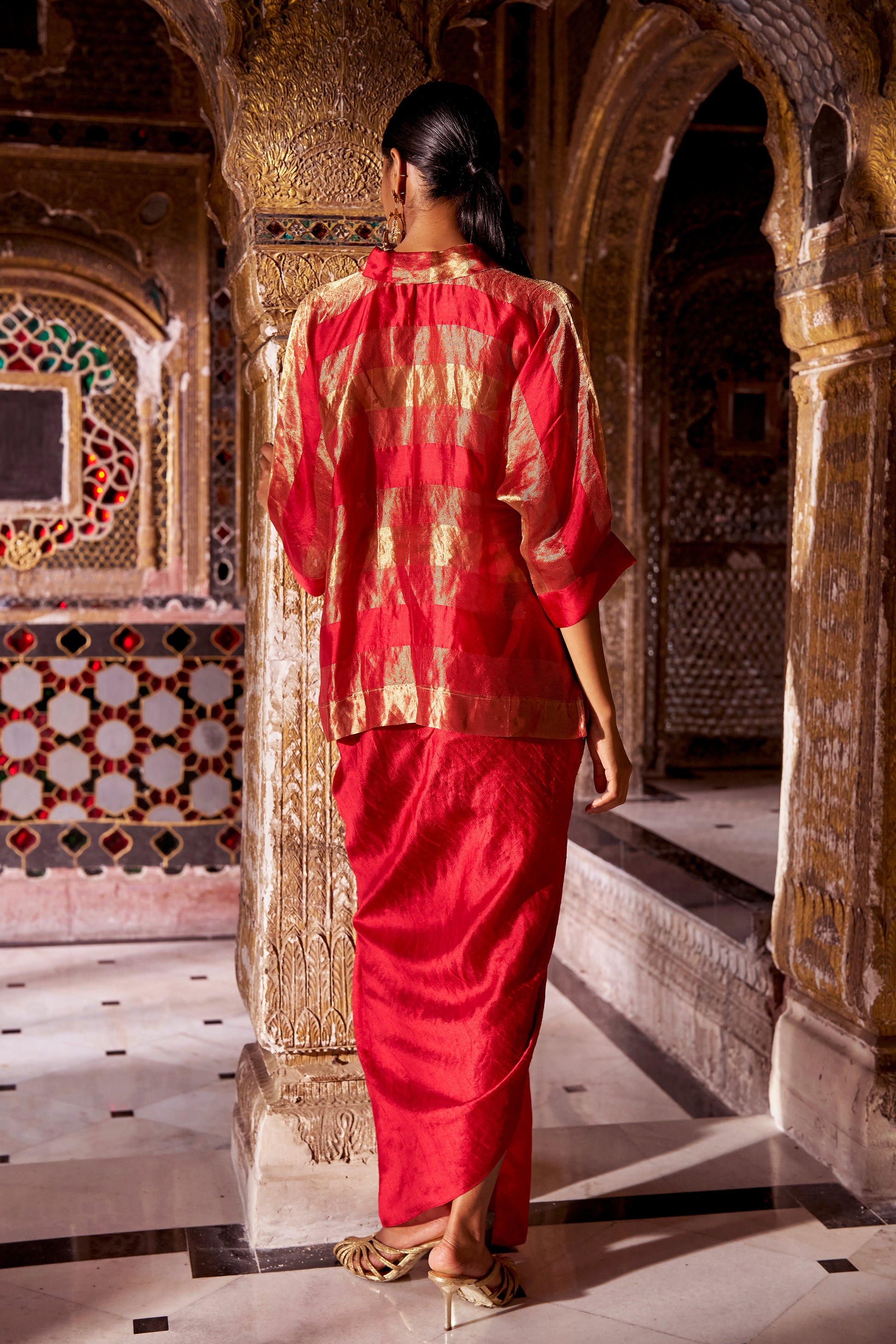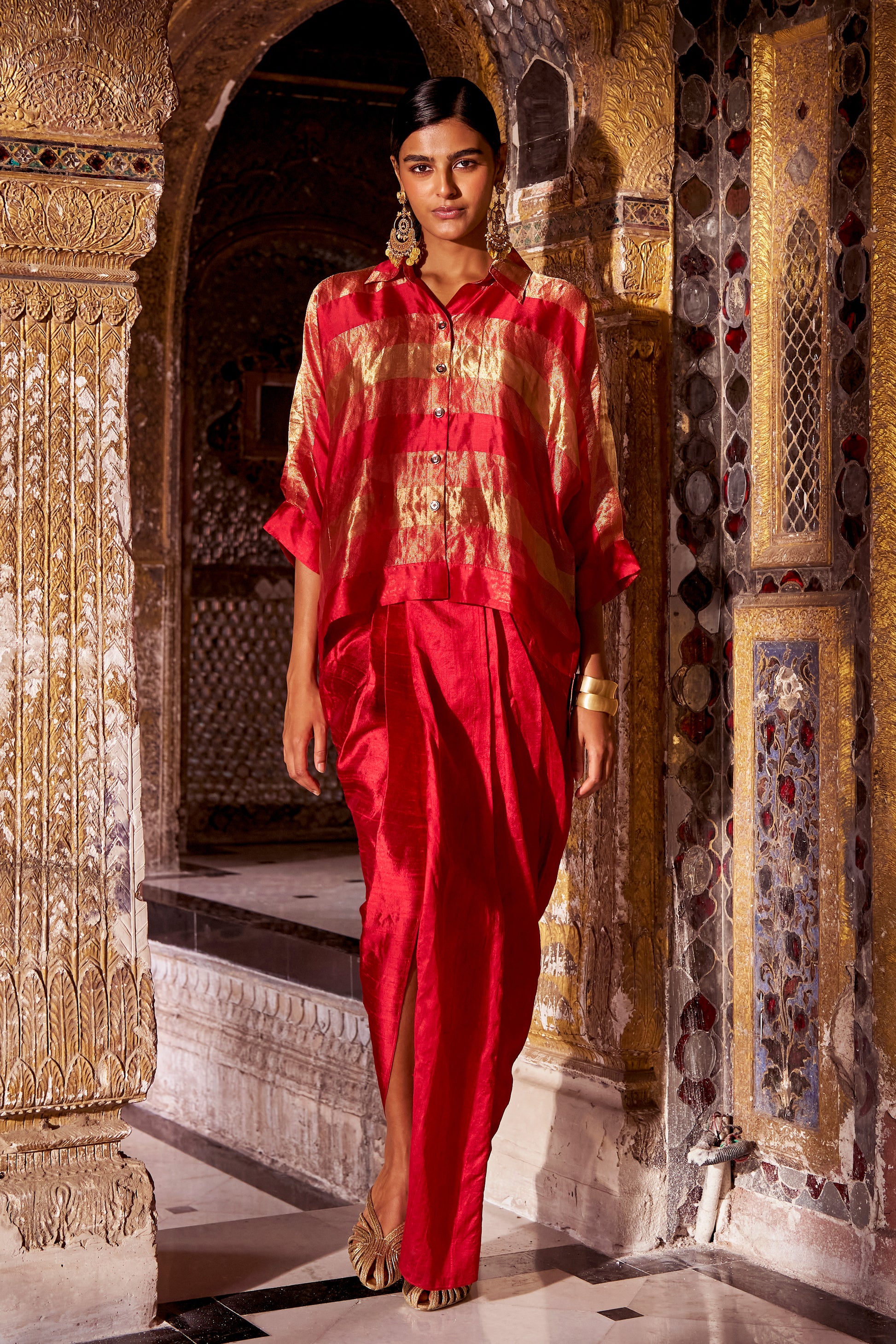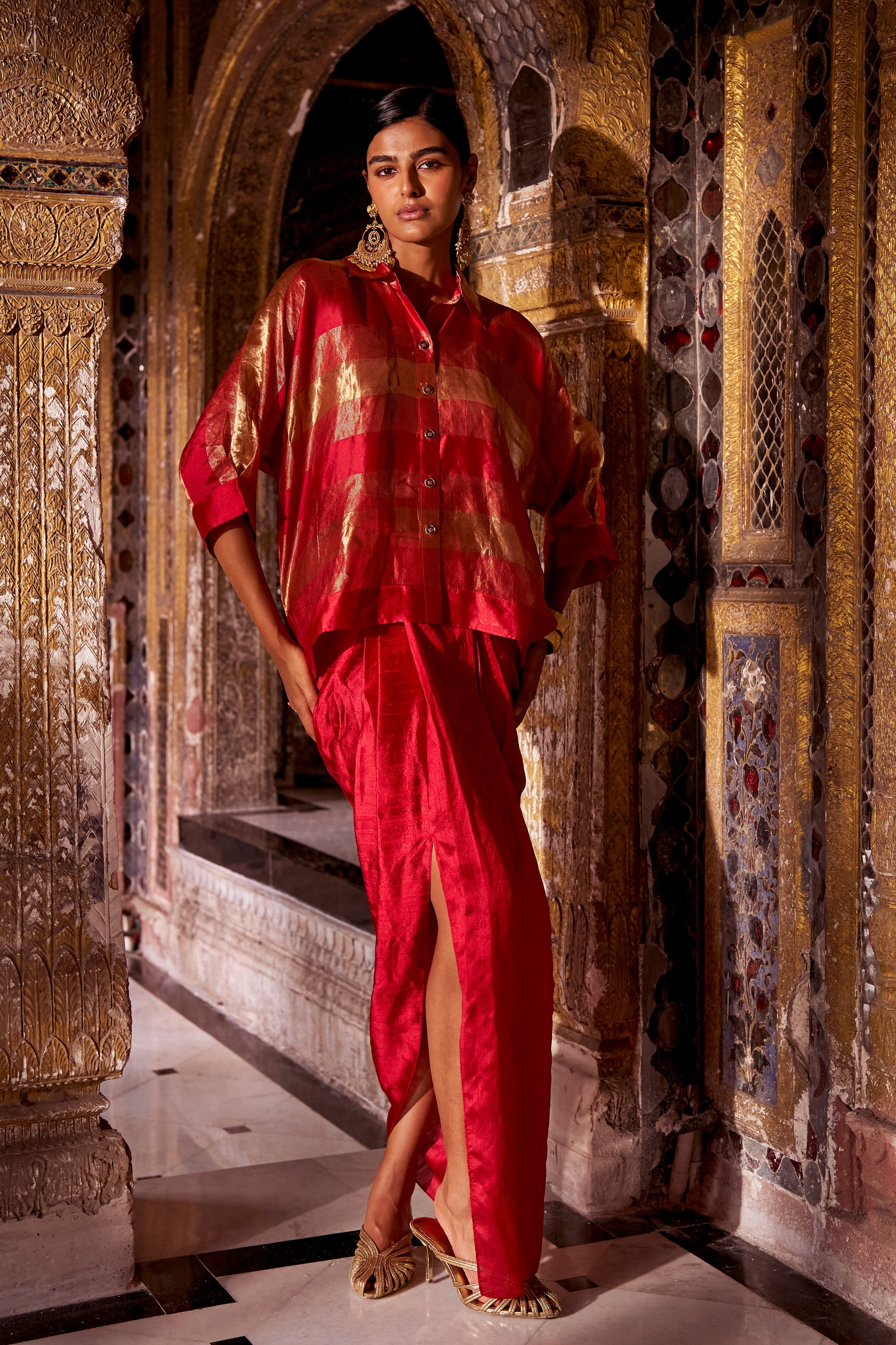 Carmine Benares tissue shirt with horizontal gold metallic stripes on the front, back and sleeves. Shirt collar with gold-toned buttons on the front placket. Dolman sleeves with a relaxed fit. Comes with a slip.