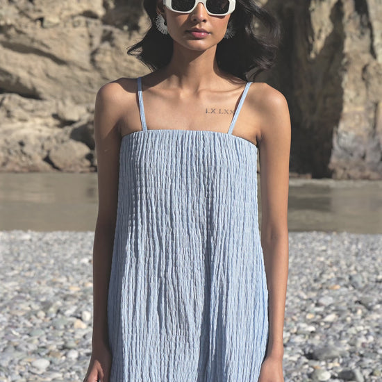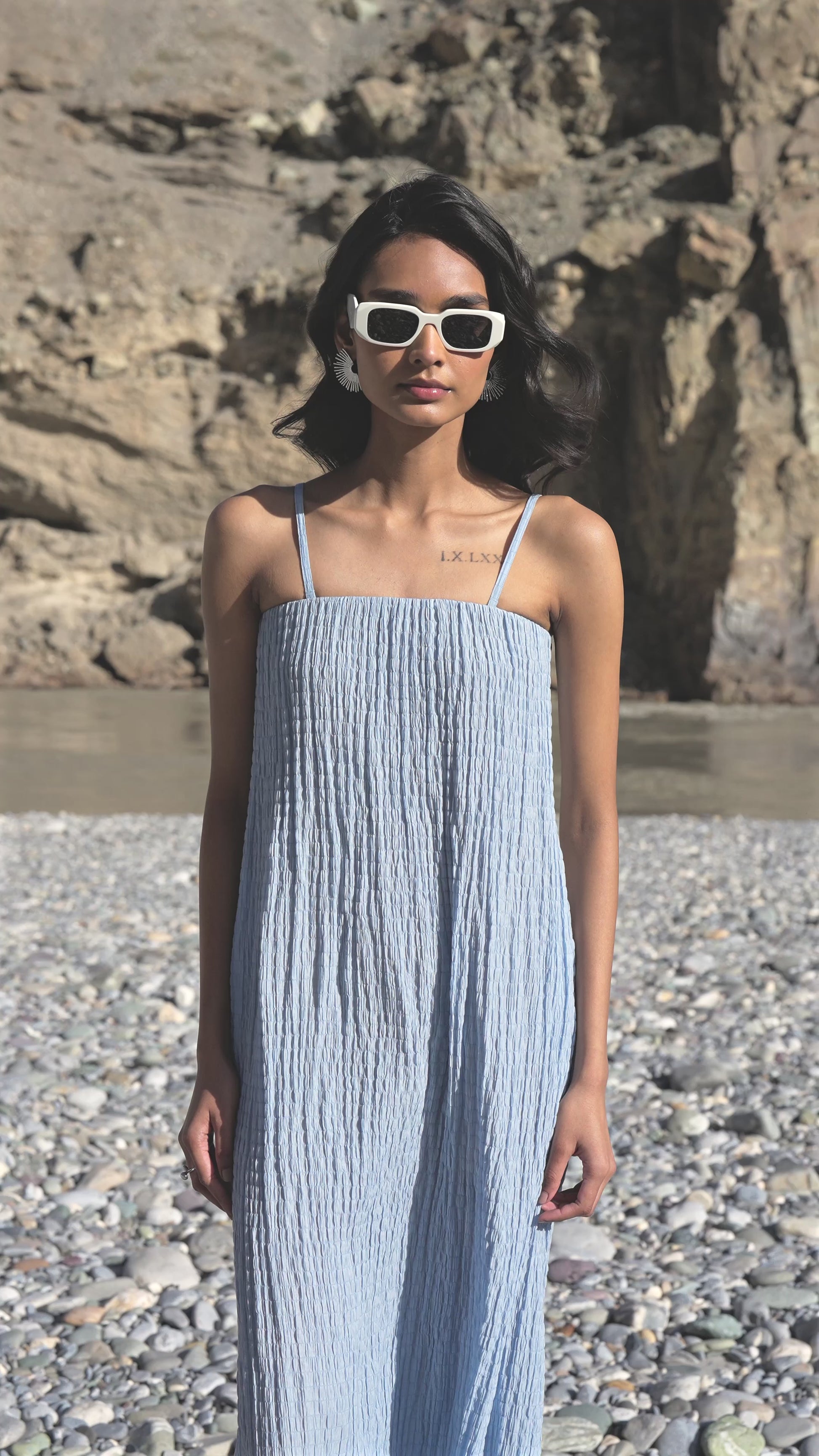 Hand-crushed off-shoulder midi dress in textured sky blue. Elasticated at the top with a side zipper. Lettuce hem detailing at the bottom. Comes with adjustable, detachable straps. Garment is lined till the knee.
