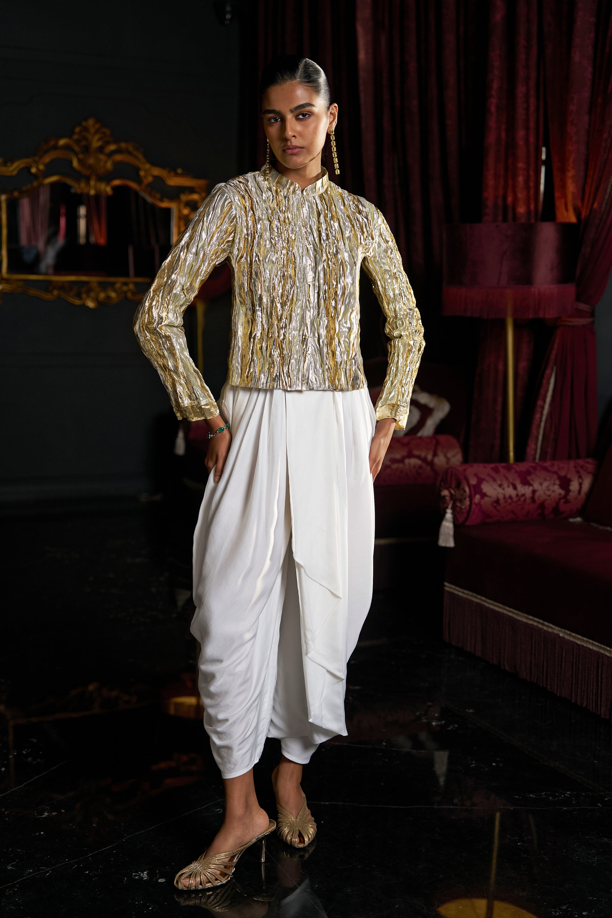 Bolero-inspired jacket crafted with hand-sewn gold and silver ribbons in a striped weave. Hand-crushed finish adds rich texture. Cropped length with a band collar and structured shoulders. Concealed placket with hook/eye closure. Full sleeves. Paired with complementary ivory cowl pant in all weather suiting material. Hand sewn pleats and a draped panel at the waist, creating folds that taper towards the hem. Dhoti-inspired draped pleat detail. Elasticated waist. Comfort fit.