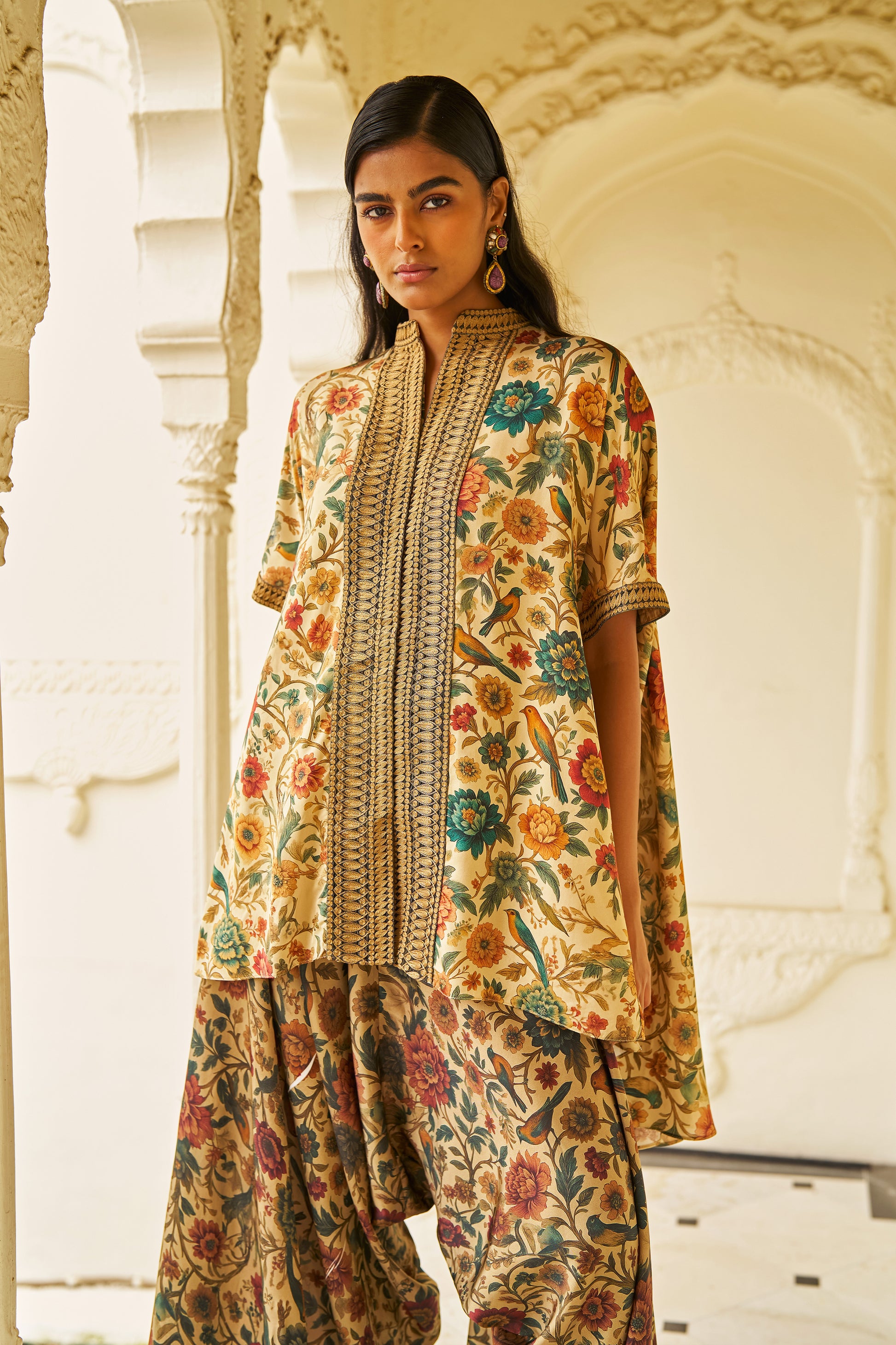 Dori embroidered printed top in heritage-inspired soft floral motifs. Band collar with metallic thread embroidery placed at the front. Relaxed fit with a high-low curved hem. Dolman sleeves cut for movement. Flared at the back.