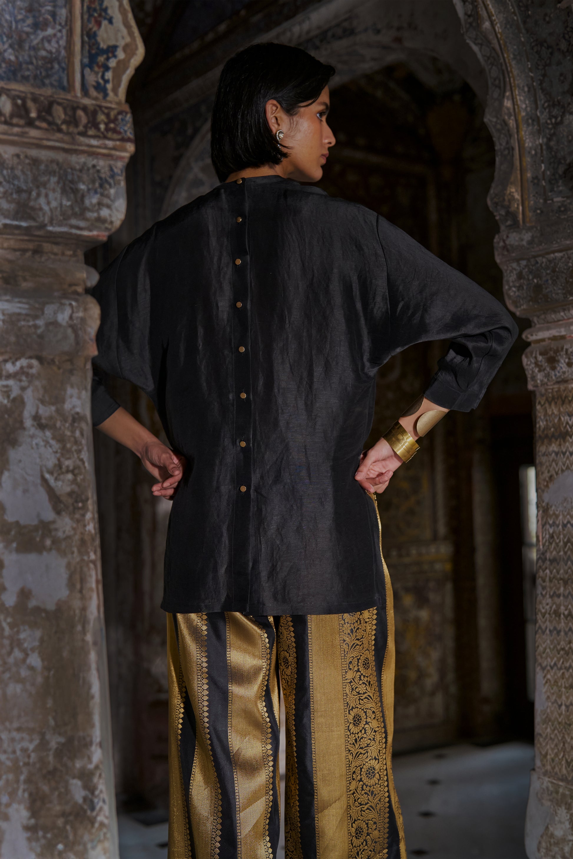 Relaxed fit black shirt in silk textured viscose. A boxy silhouette with dolman sleeves falling to the elbow and a round neckline. Detailed with a metallic button placket at the back and cuffs, and gold thread embroidery across the front inspired by Benares weaves. High-low hem. Paired with complementary Benares brocade wide-leg pant with front pleats. Vertical panel placement with alternating metallic gold floral woven motifs and plain black stripes. Side zip with hook/eye closure. Pockets in the sides.