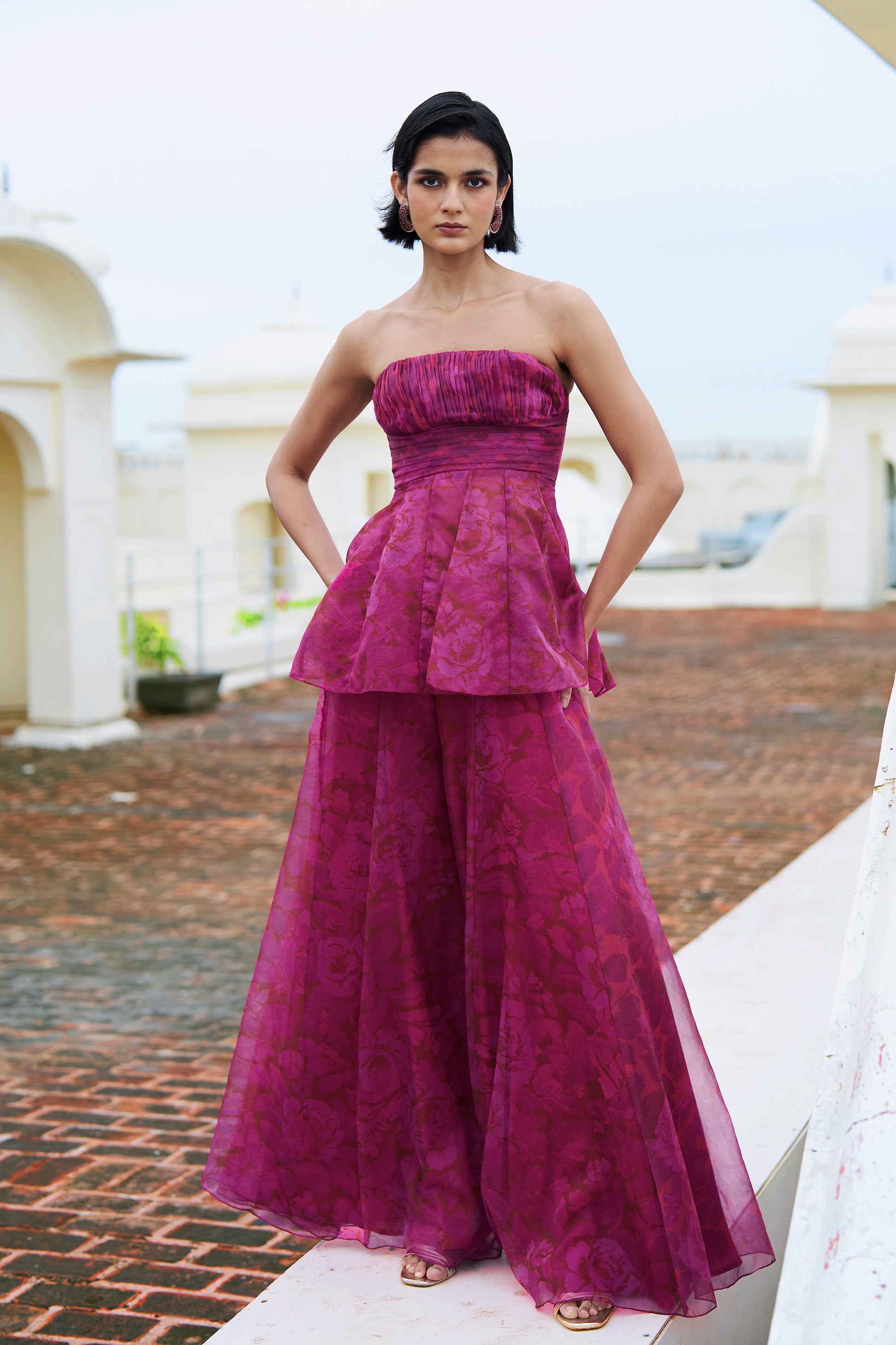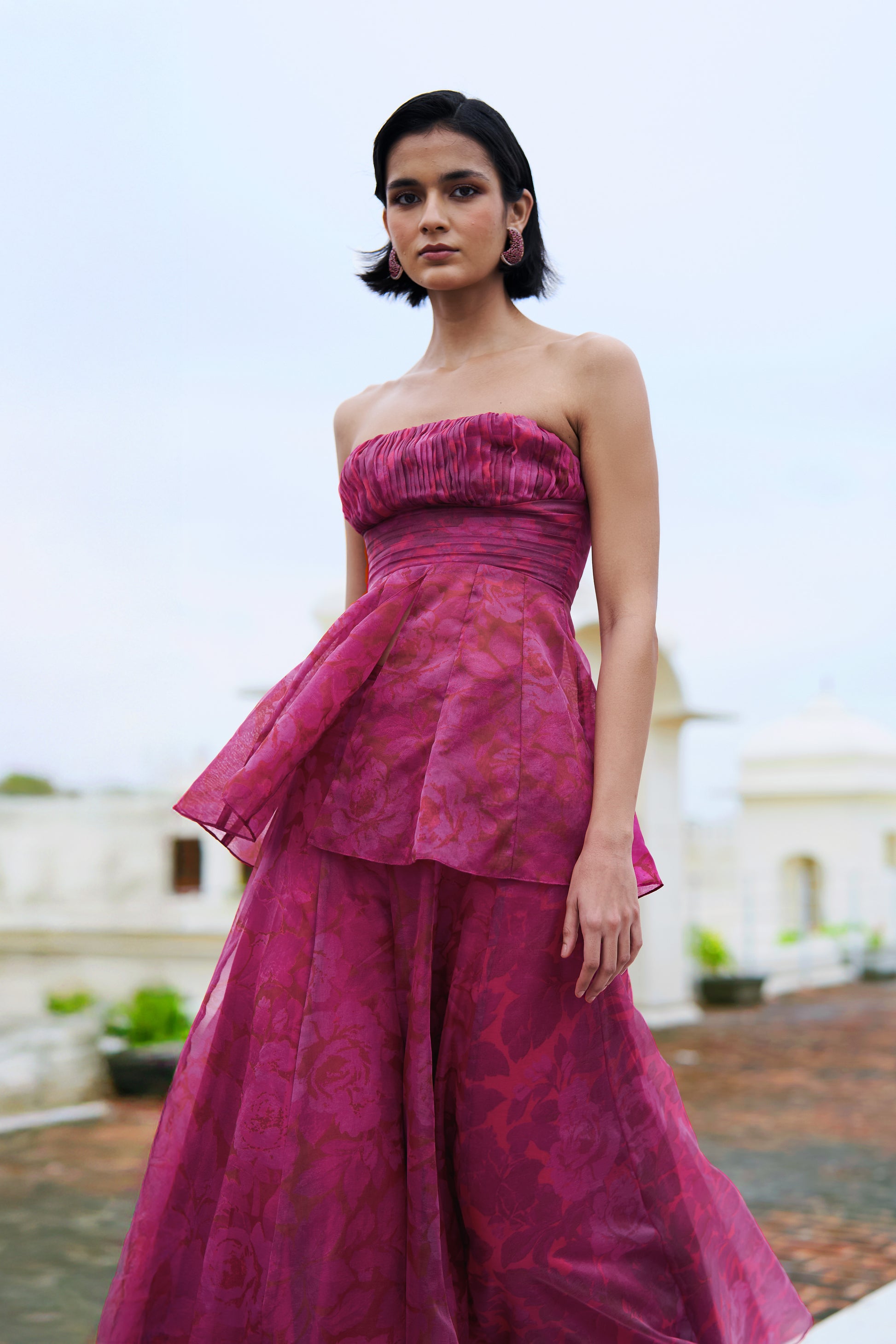 Off-shoulder peplum top in double-layered soft organza with an abstract rose watercolor print. Hand-applied pleats at the top with an A-line flare and a front slit. Back zipper closure. Top is semi-lined. Paired with matching high-waist fit-and-flare pant. Cut in vertical panels for a linear, flowing shape. Wide-leg silhouette with fluid movement. Inner drawstring with hook/eye and zip closure. Garment is fully lined.