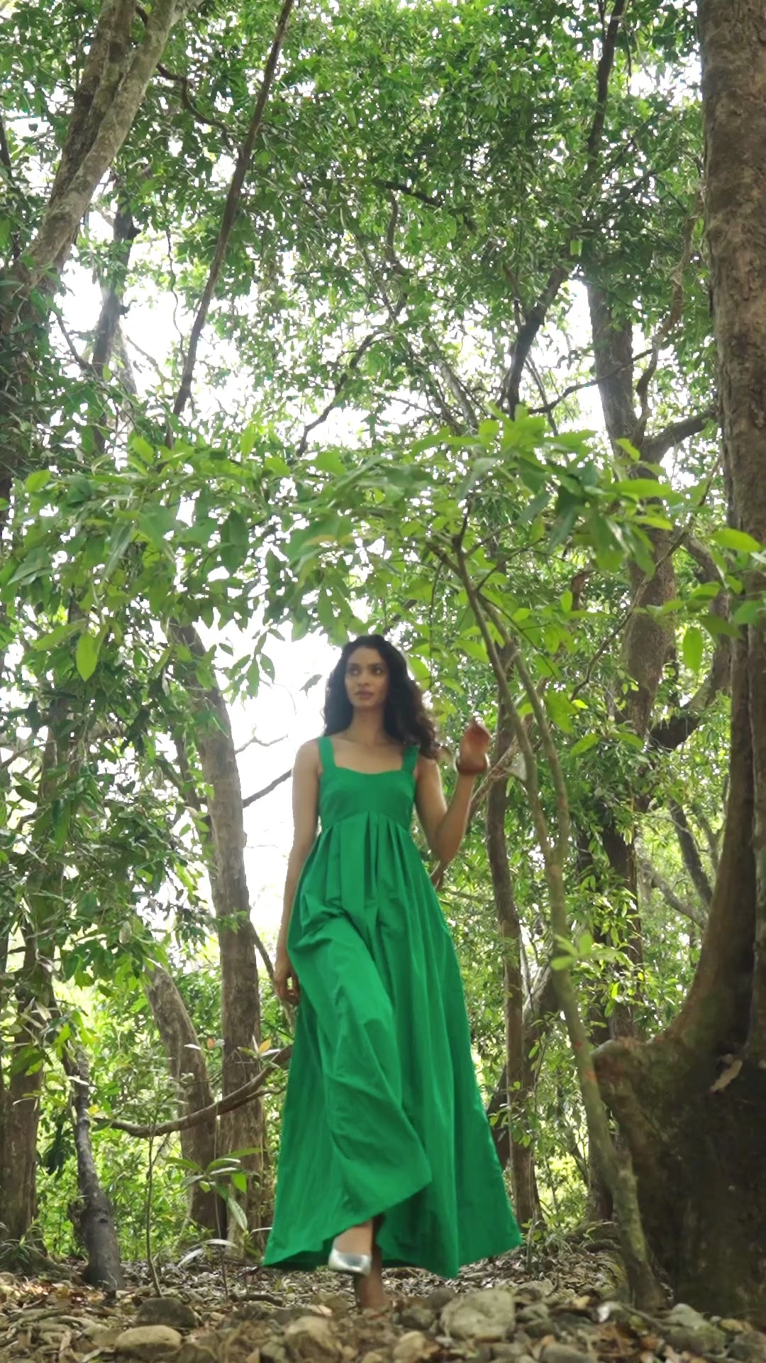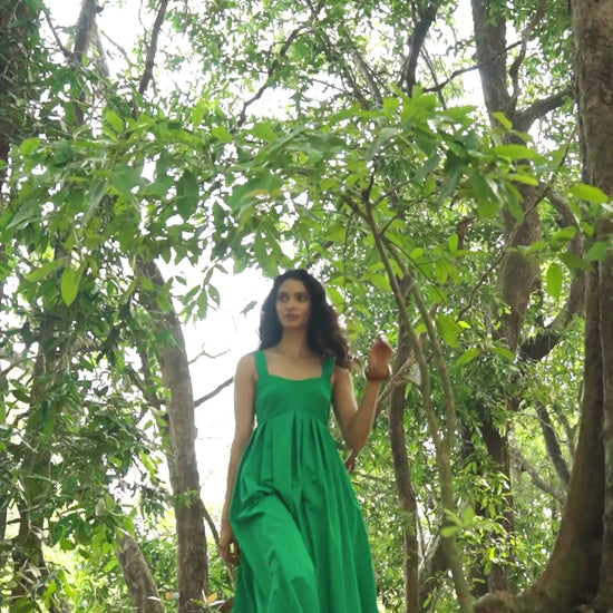 Green dress in a fit-and-flare silhouette with hand sewn irregular box pleats and a sweetheart neckline. Flowing, exaggerated flare toward the hem. Features a back zip closure. Pockets in the sides. The top is lined, made of a textured paper finish poplin.