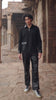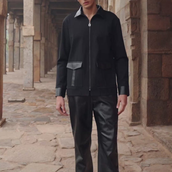 Knitted shirt in ponte roma with waxed denim accents on the collar, front patch pockets and full sleeve cuffs. Full front zip down. Relaxed fit.