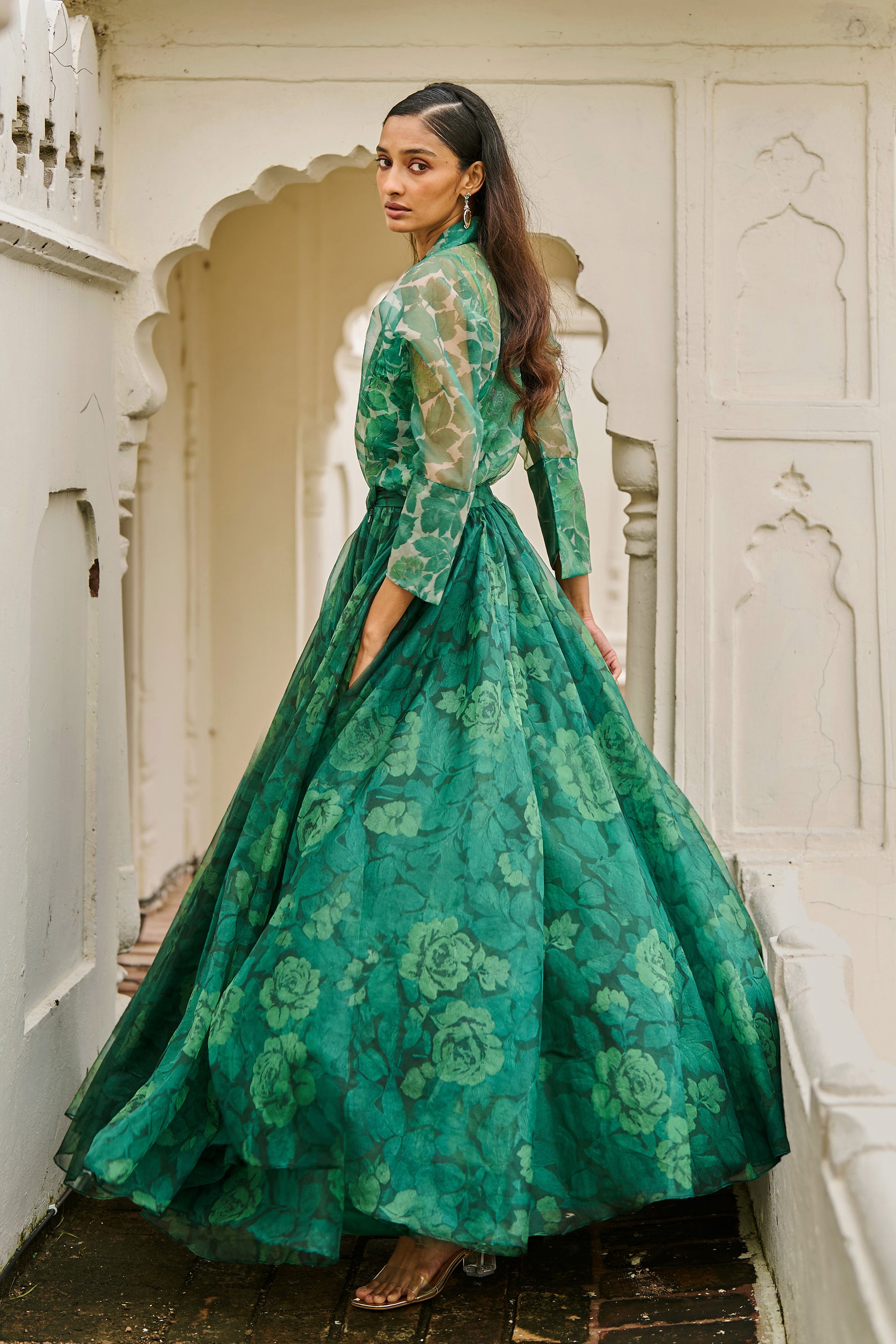 Tonal green rose print shirt in soft, flowing organza. Layered in lighter shades of emerald, moss, and sage. Shirt collar with a concealed button-down placket. Full sleeves with dramatic flared cuffs. Relaxed fit. Comes with a coordinated slip that mirrors the print for a seamless layered effect. Paired with complementary maxi skirt in soft, flowing organza. Layered in darker shades of emerald, fern, and moss to create depth within the print. A-line silhouette with generous movement and soft ruching at the waist that flares towards the hem. Structured waistband with internal drawstring, side zip, and hook/eye closure. Fully lined, with fusing at the bottom hem to support drape and maintain sculptural flow.