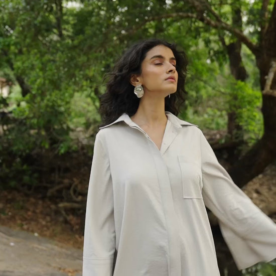 Beige relaxed fit poplin shirt dress. Concealed functional front placket with additional exposed button plackets down the side seams. Boxy long sleeves with an exaggerated cuff. Patch pocket in the front, inverted pleat in the back.