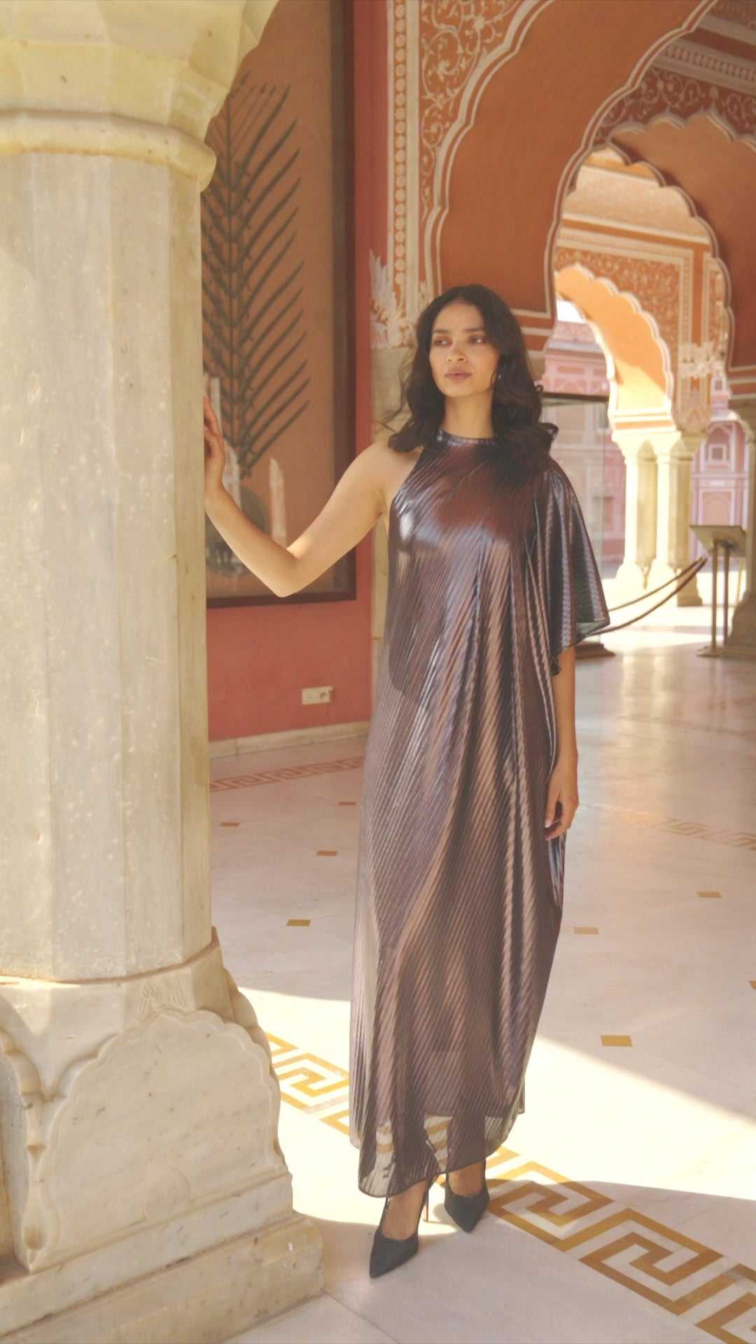 Grecian inspired draped kaftan maxi-dress. Shimmer textured stripe in bronze. Hand applied pleats in the front to add a flattering shape. Asymmetric shape with a single kaftan-style sleeve. Zip closure on the shoulder. Comes with a slip.