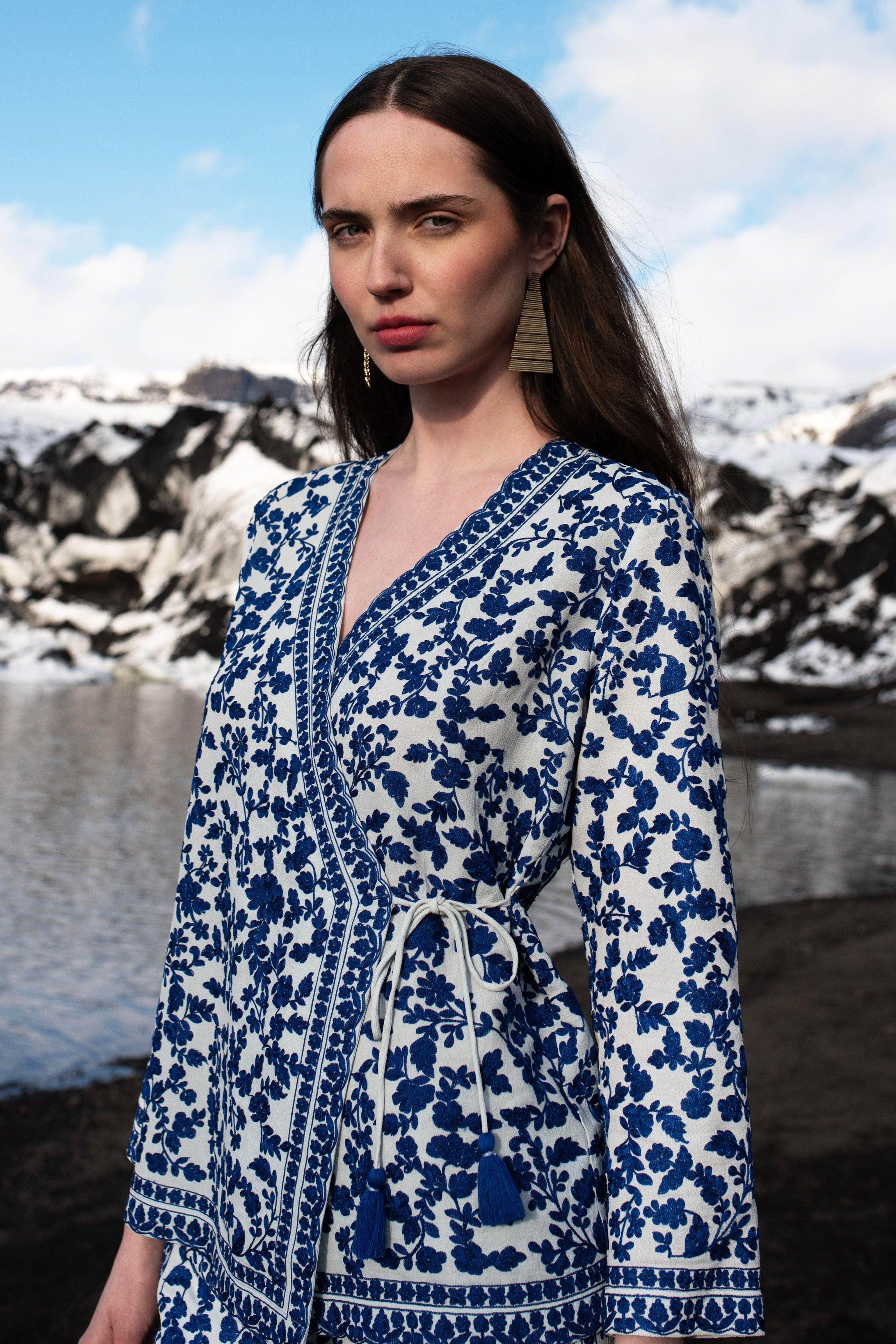 Striking royal blue Ari stitch inspired embroidery on a soft powder blue base. Floral resham allover embroidery framed with dramatic placed borders on the front and bottom hem of the top. Front overlapping relaxed fit top with a dori and tassel side tie detail. Textured all season summer viscose.