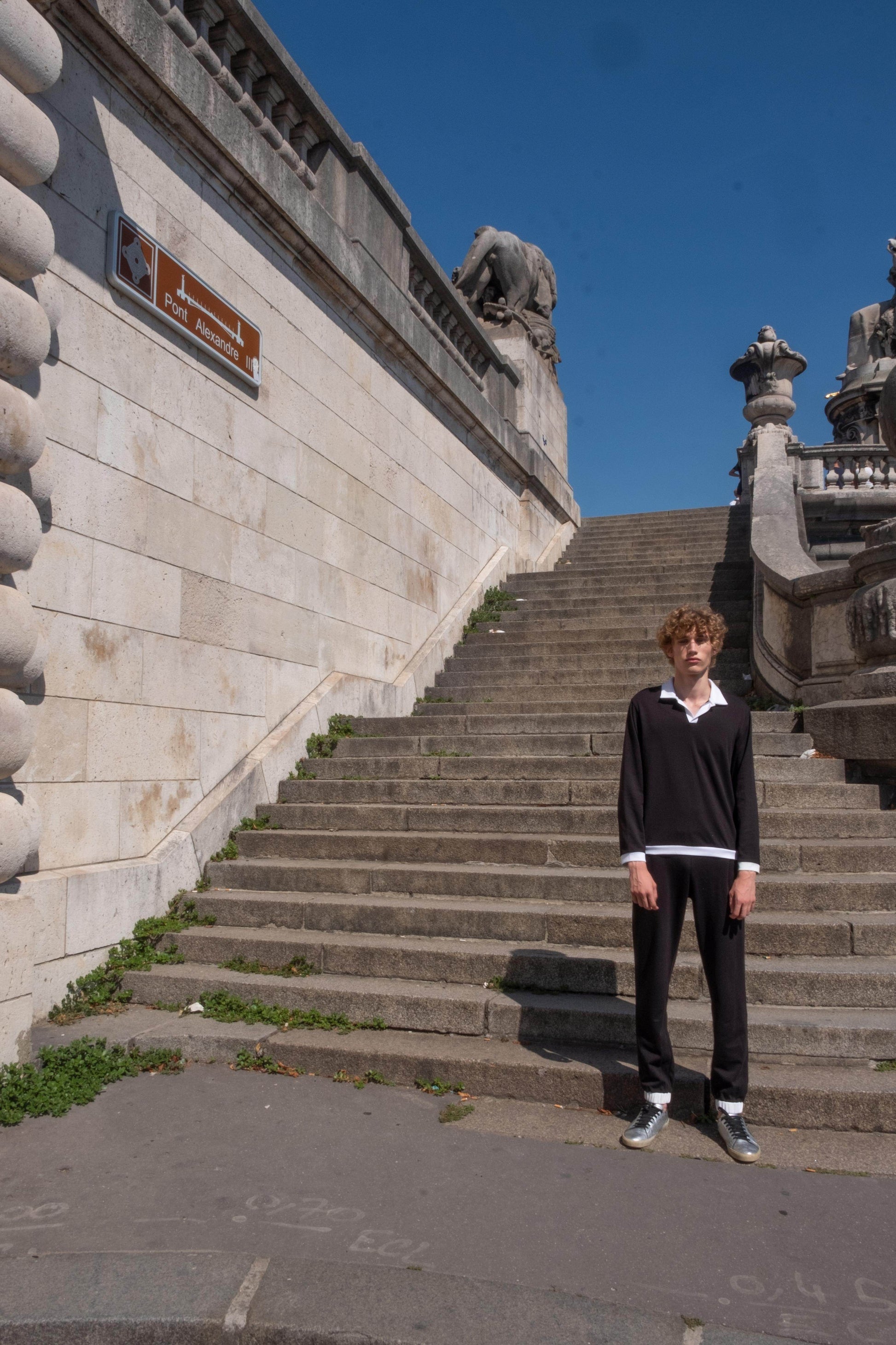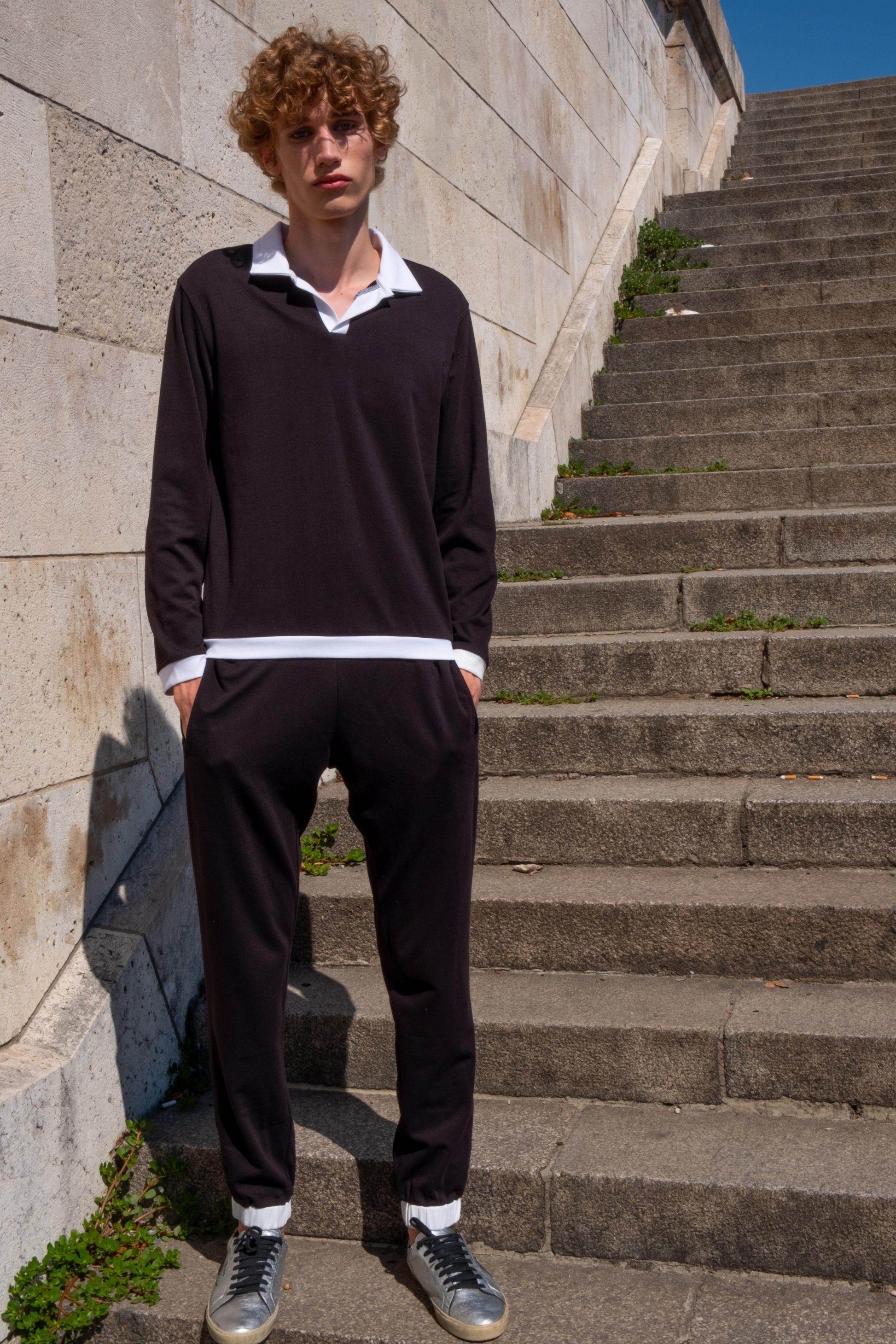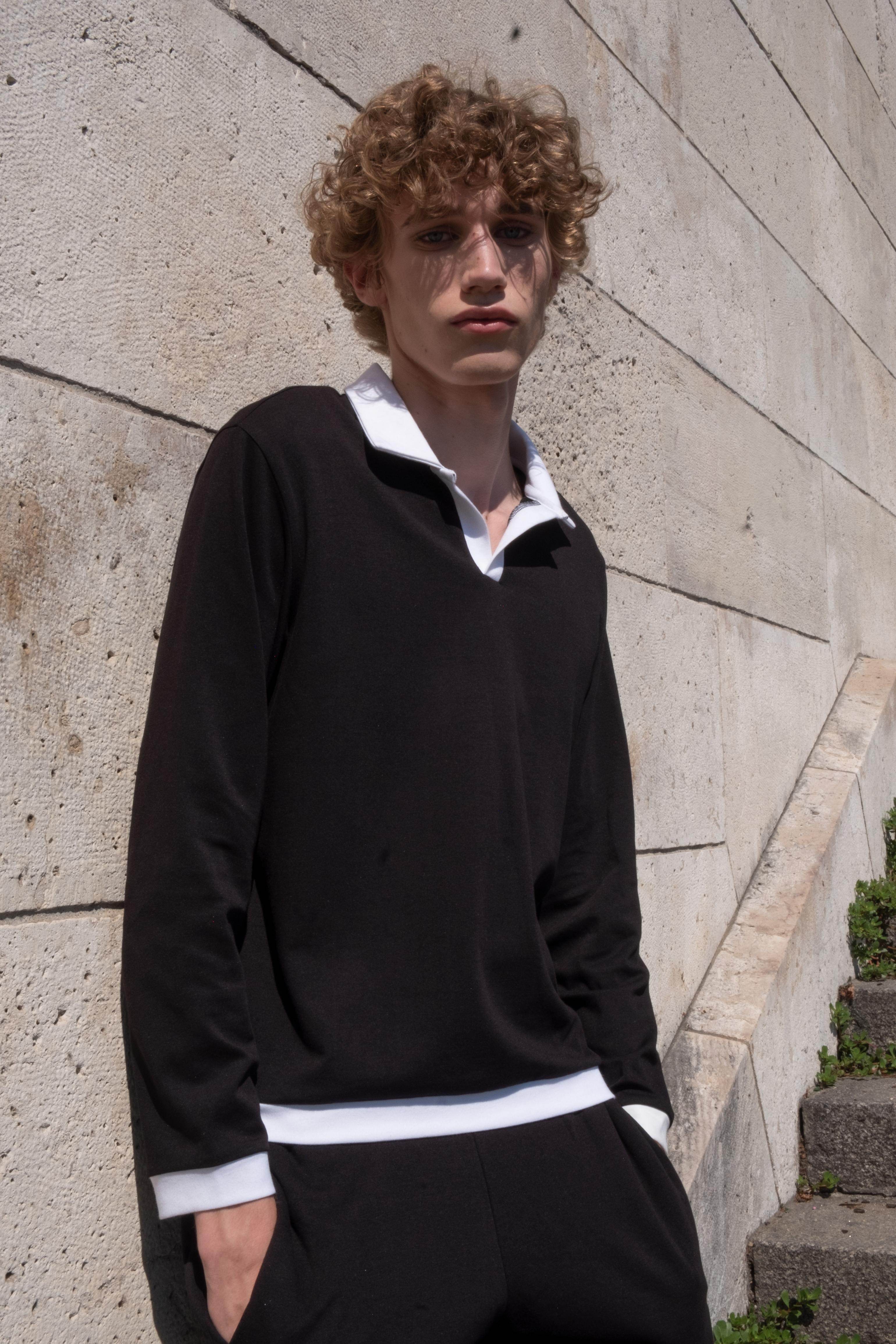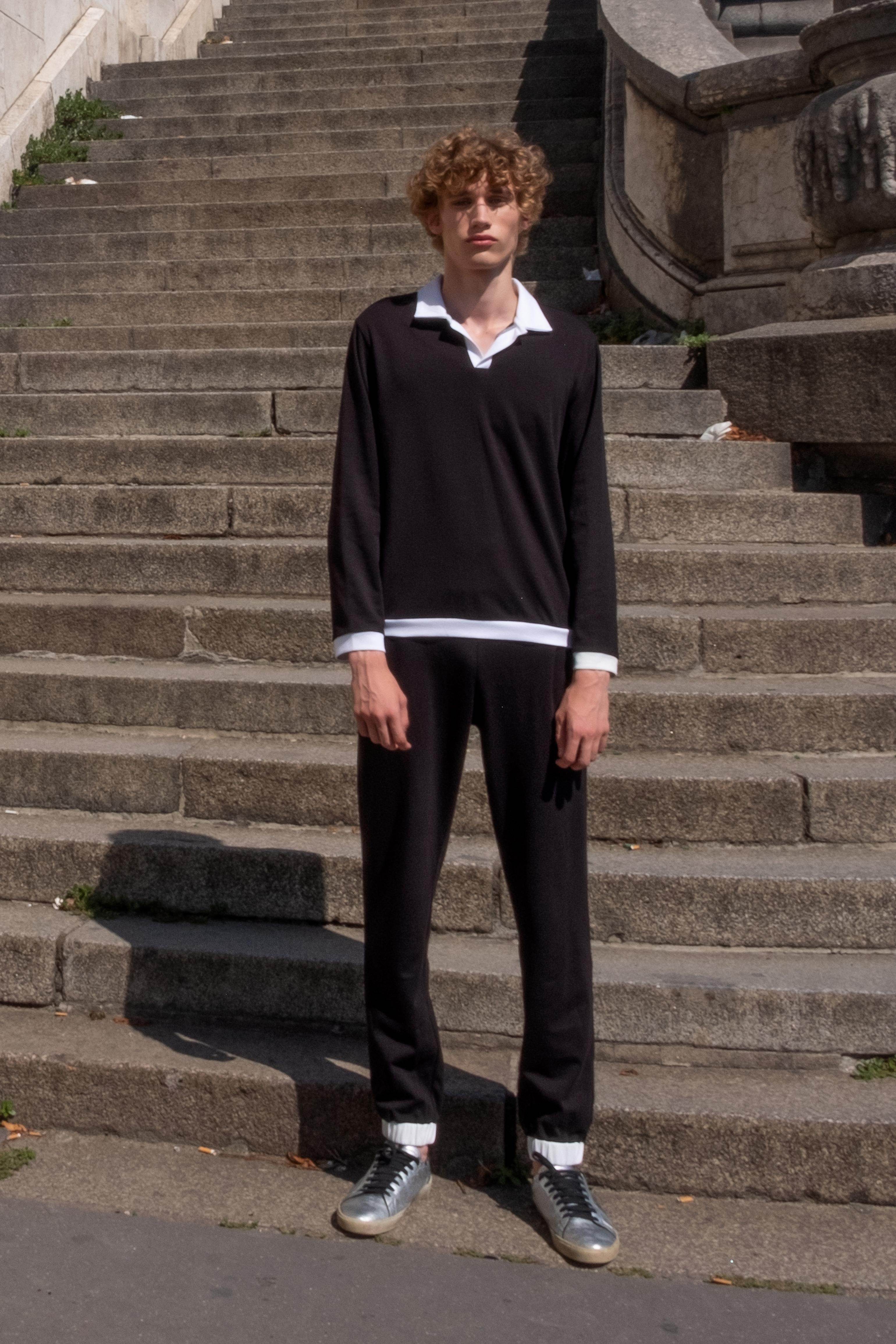 Black long sleeve polo with contrasting white collar, placket, cuff, and hem detail. Paired with matching jogger pants with contrast waist band and cuff. Regular fit. Sustainably sourced recycled polyester and Pima cotton blend.