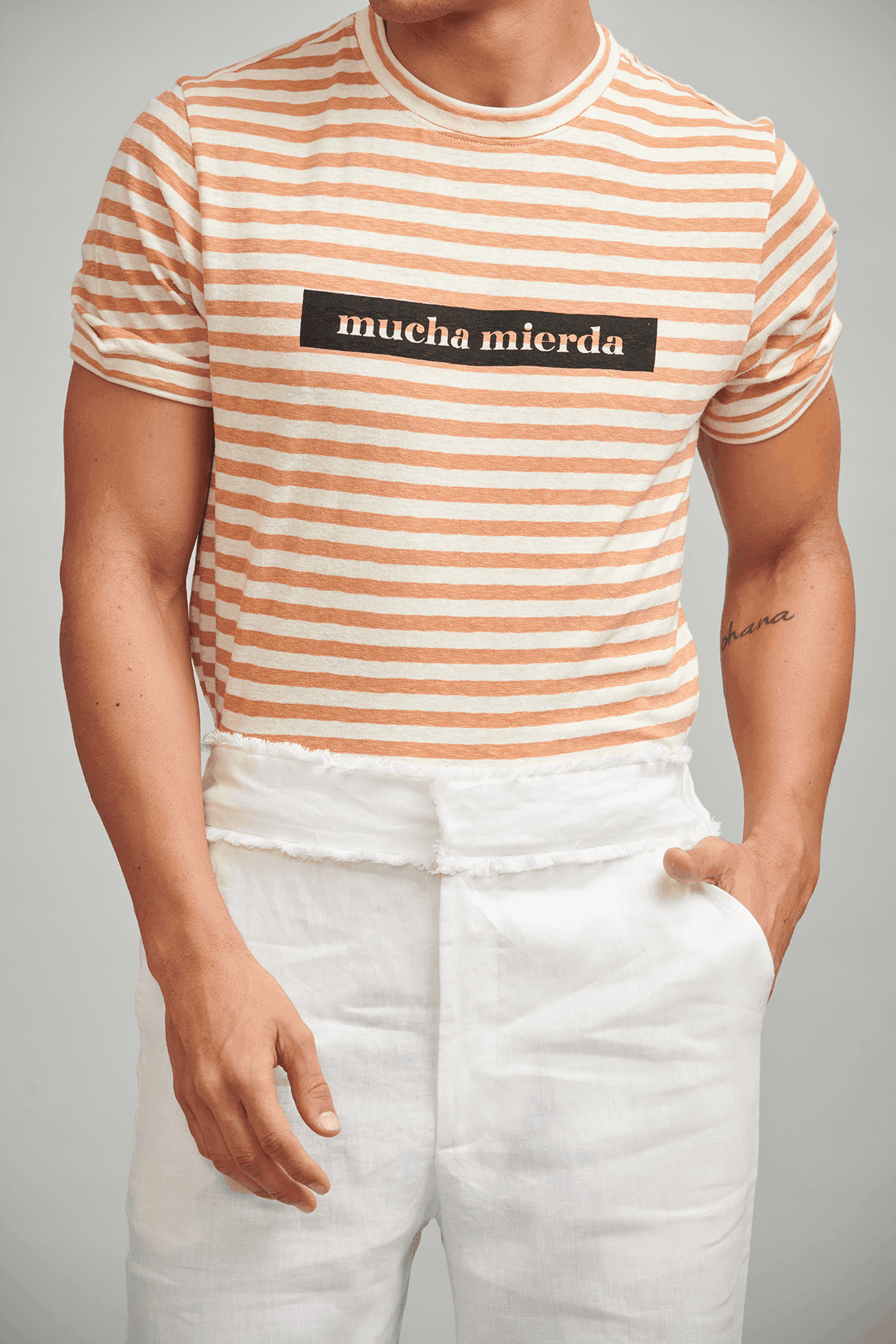Basic stripe short sleeve tee with contrast 'mucha mierda' (Spanish: a lot of shit) print on the front. Tonal rib detail at neck and sleeve. Boxy, cropped shape with a raw hem. Orange and white slub stripe.