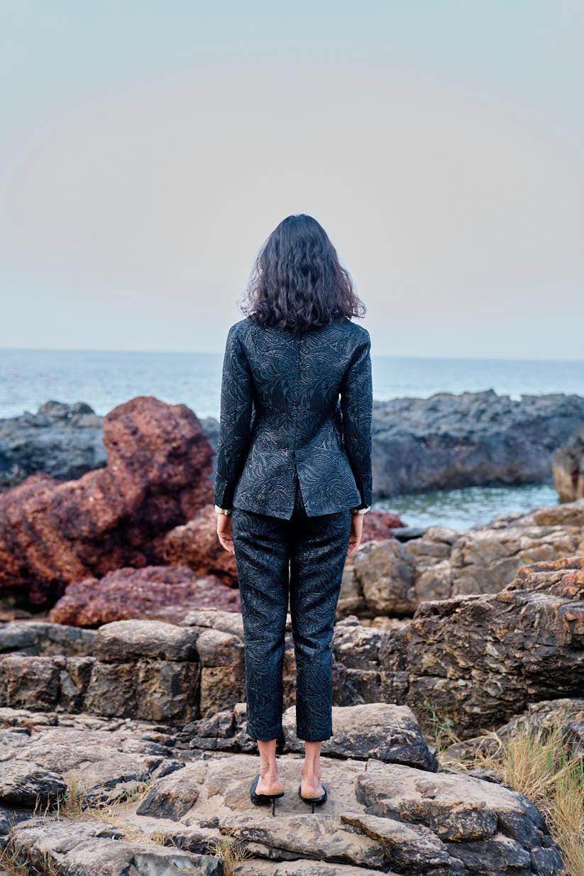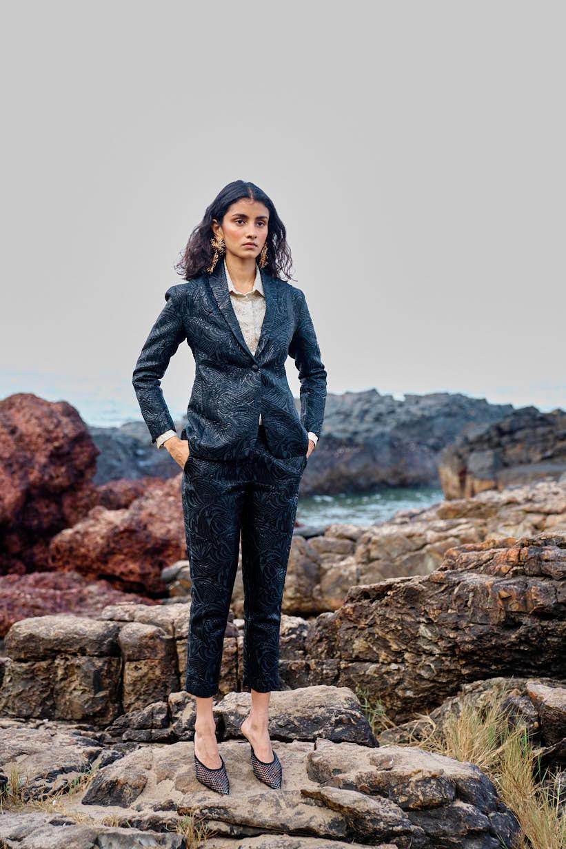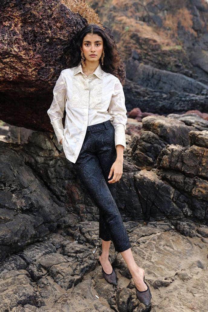 Black and metallic soft brocade pant in Baroque inspired pattern. Tapered fit.