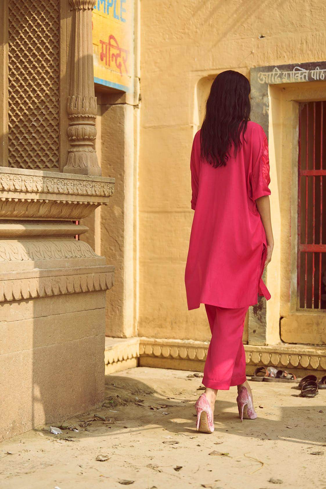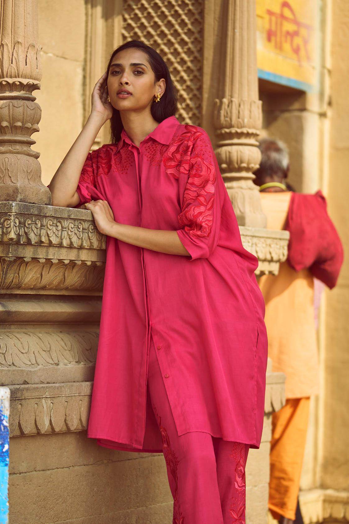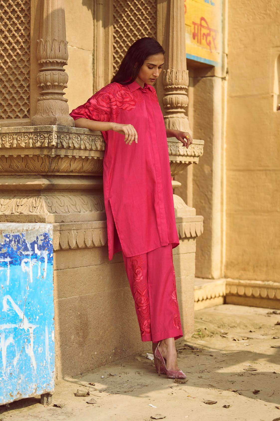 Fuchsia boxy longline shirt with placed tonal and red floral embroidery across the shoulders and sleeves. Shirt collar. Concealed button placket. Paired with pants with a similar embroidery detailing down the sides. Pockets on the side. Hook and zip closure at the front.