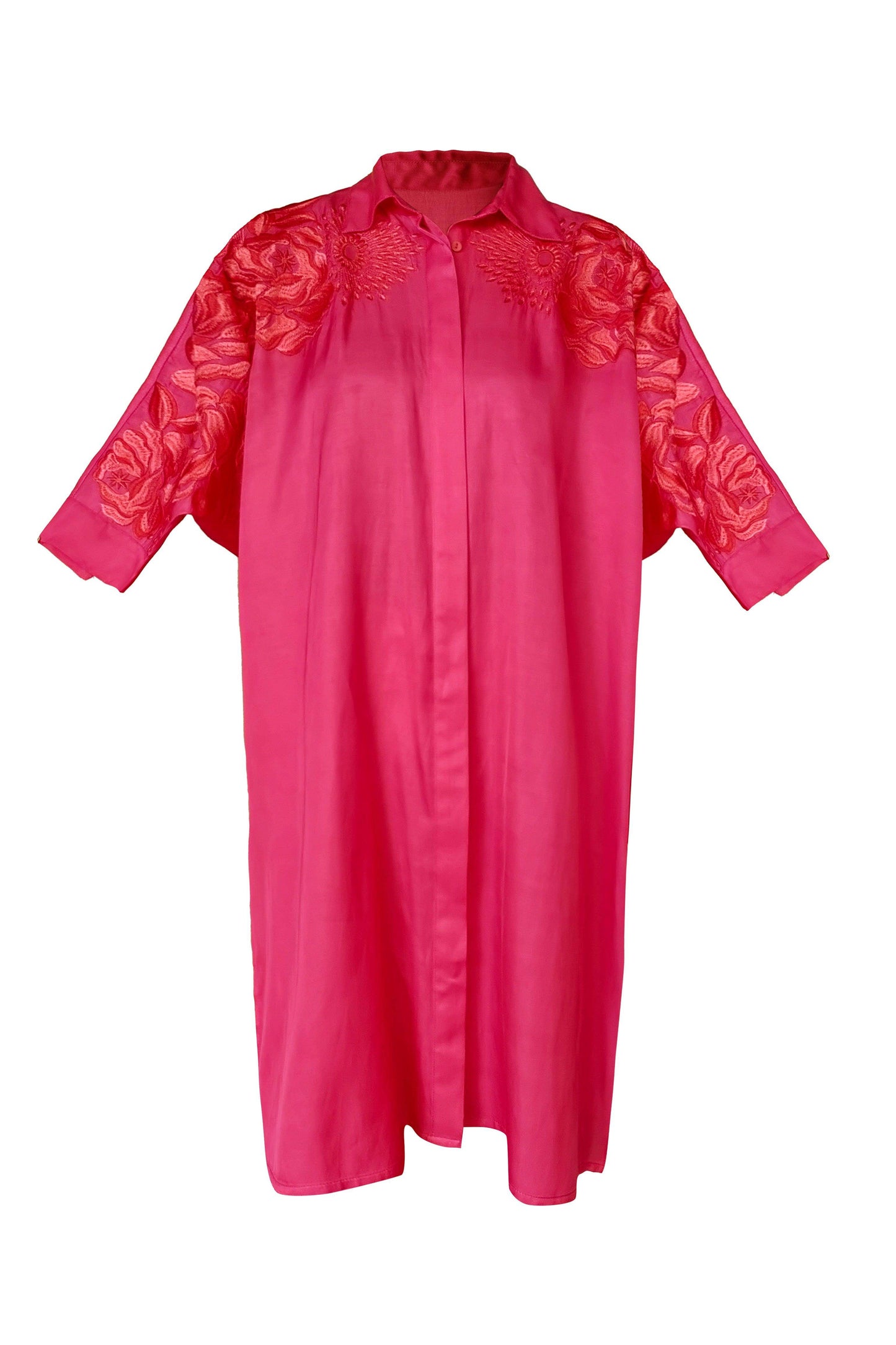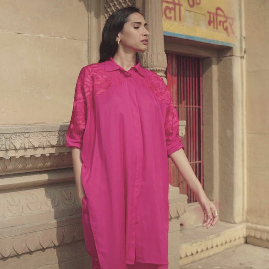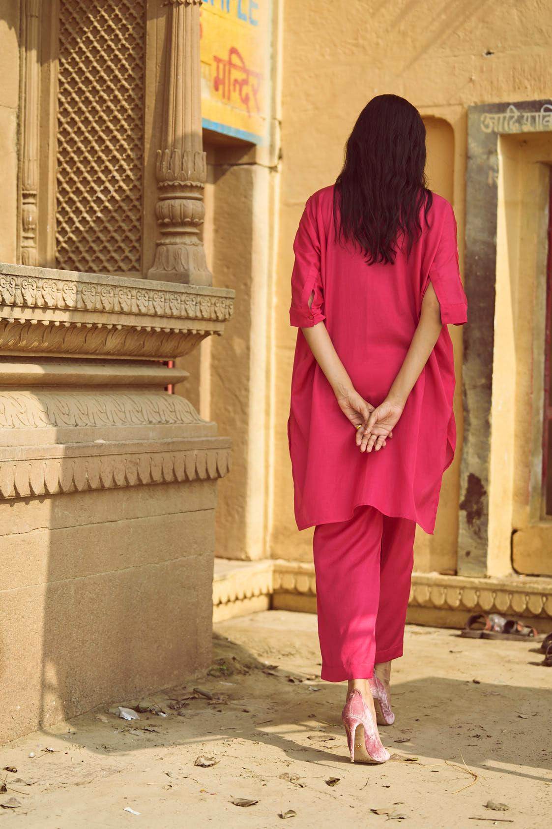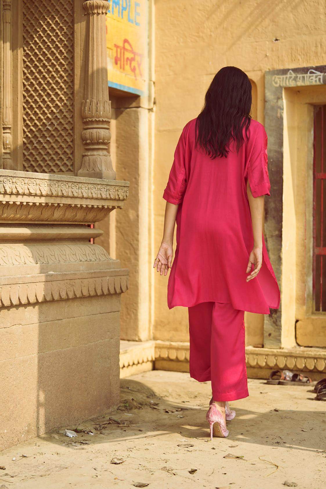Fuchsia boxy longline shirt with placed tonal and red floral embroidery across the shoulders and sleeves. Shirt collar. Concealed button placket. Paired with pants with a similar embroidery detailing down the sides. Pockets on the side. Hook and zip closure at the front.