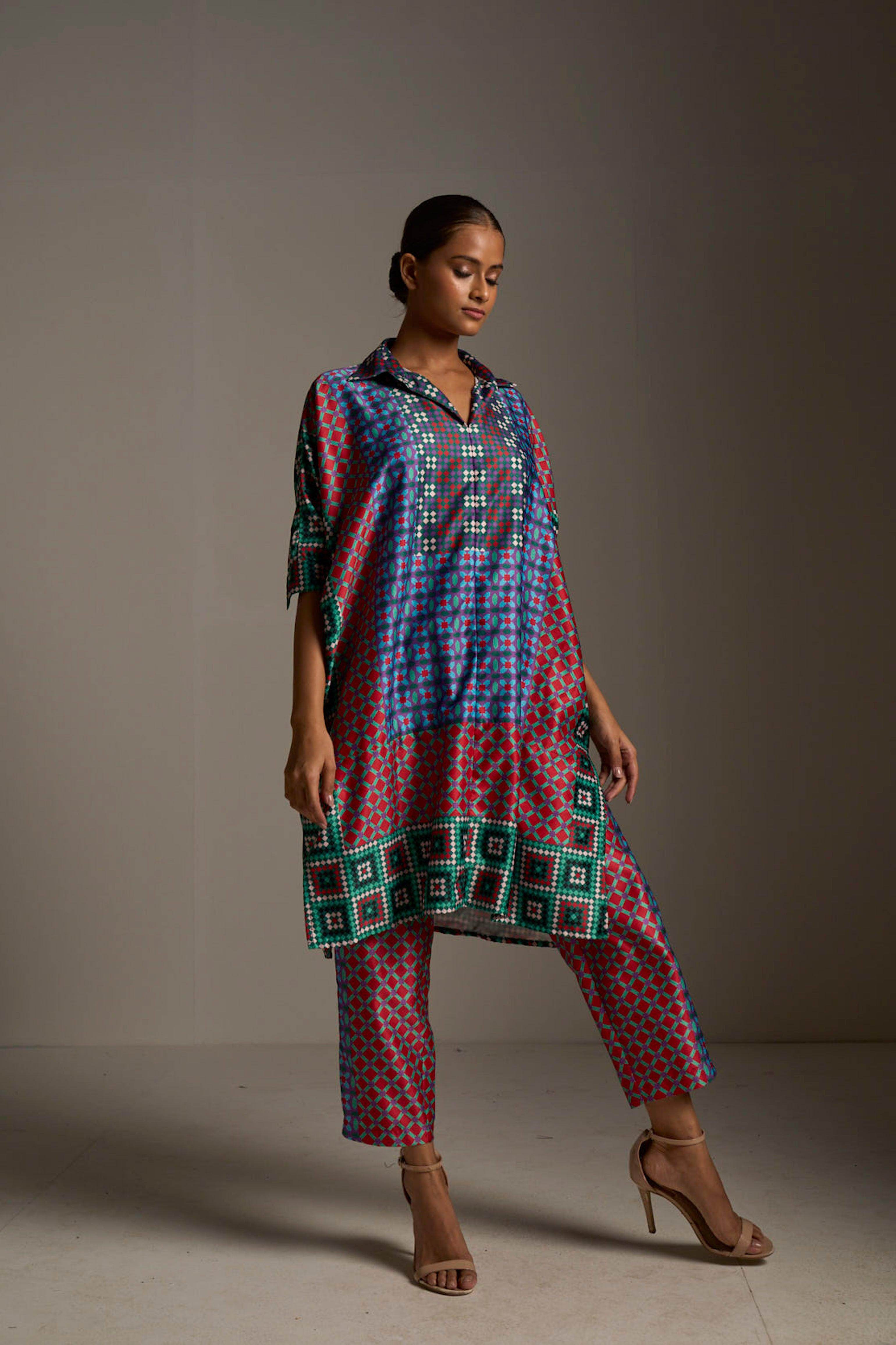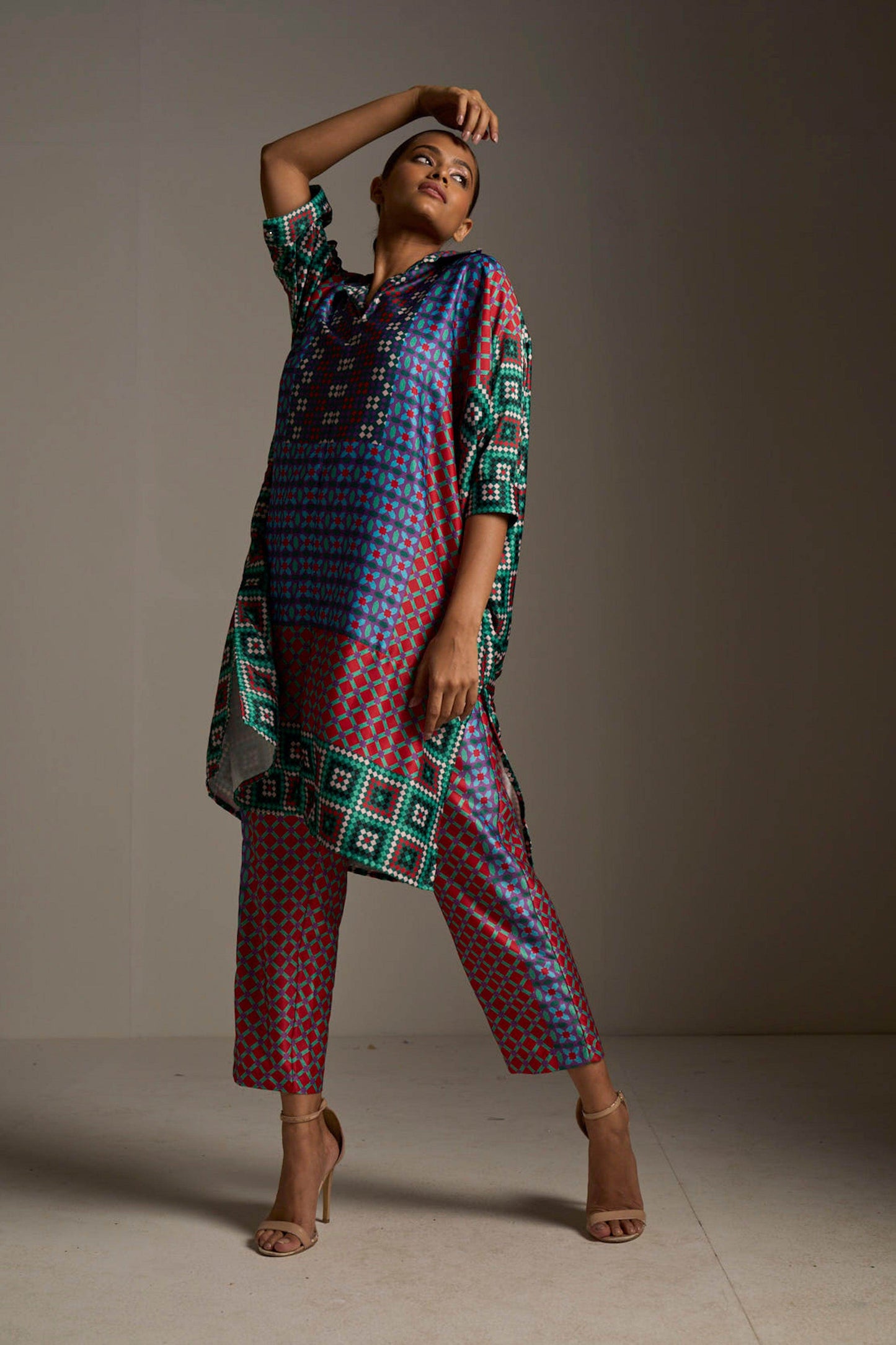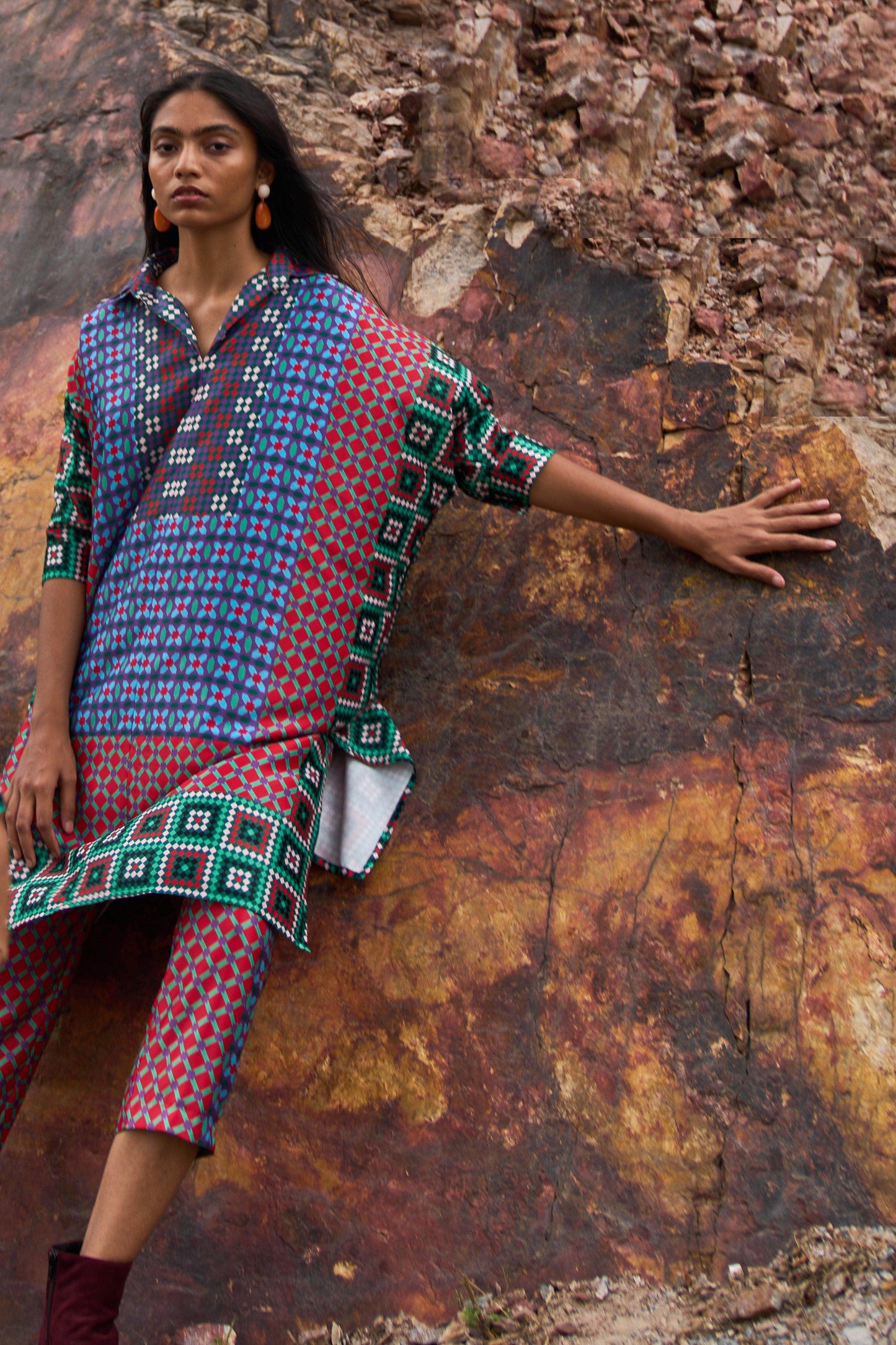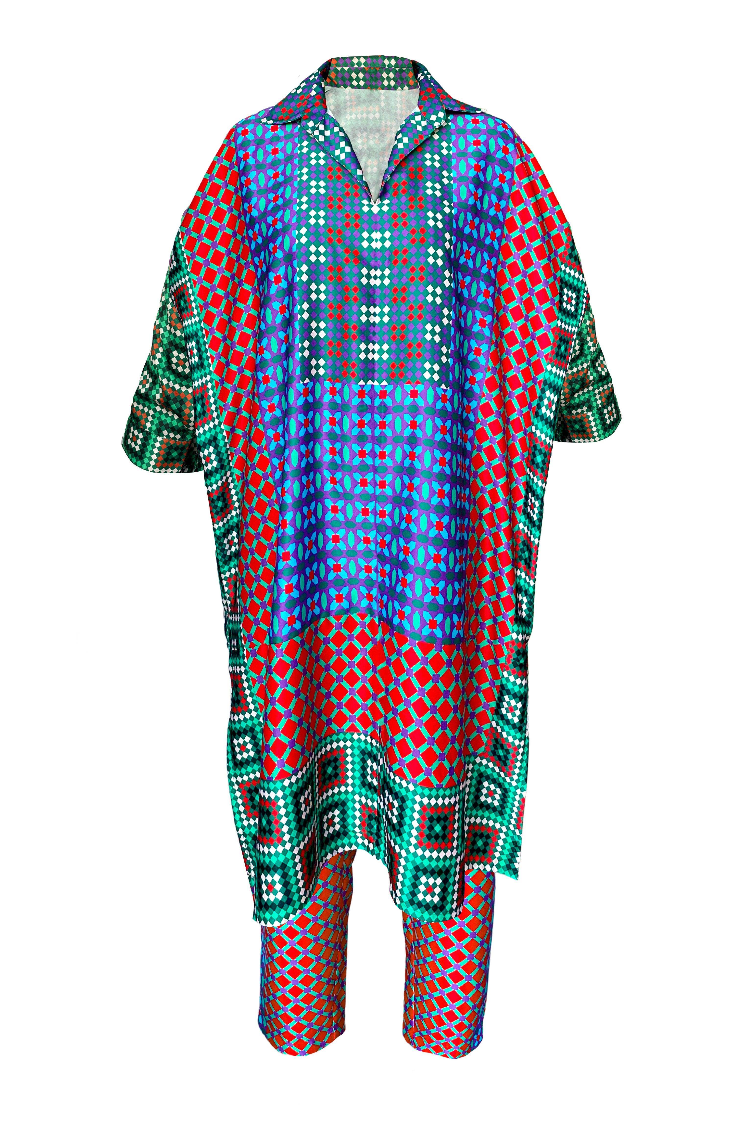 Boxy longline popover top. Placement border print inspired by moroccan mosaic tiles. Shirt collar with V-neck. Paired with pants with a placement border on the side. Elasticated at the waist, pockets on the sides.