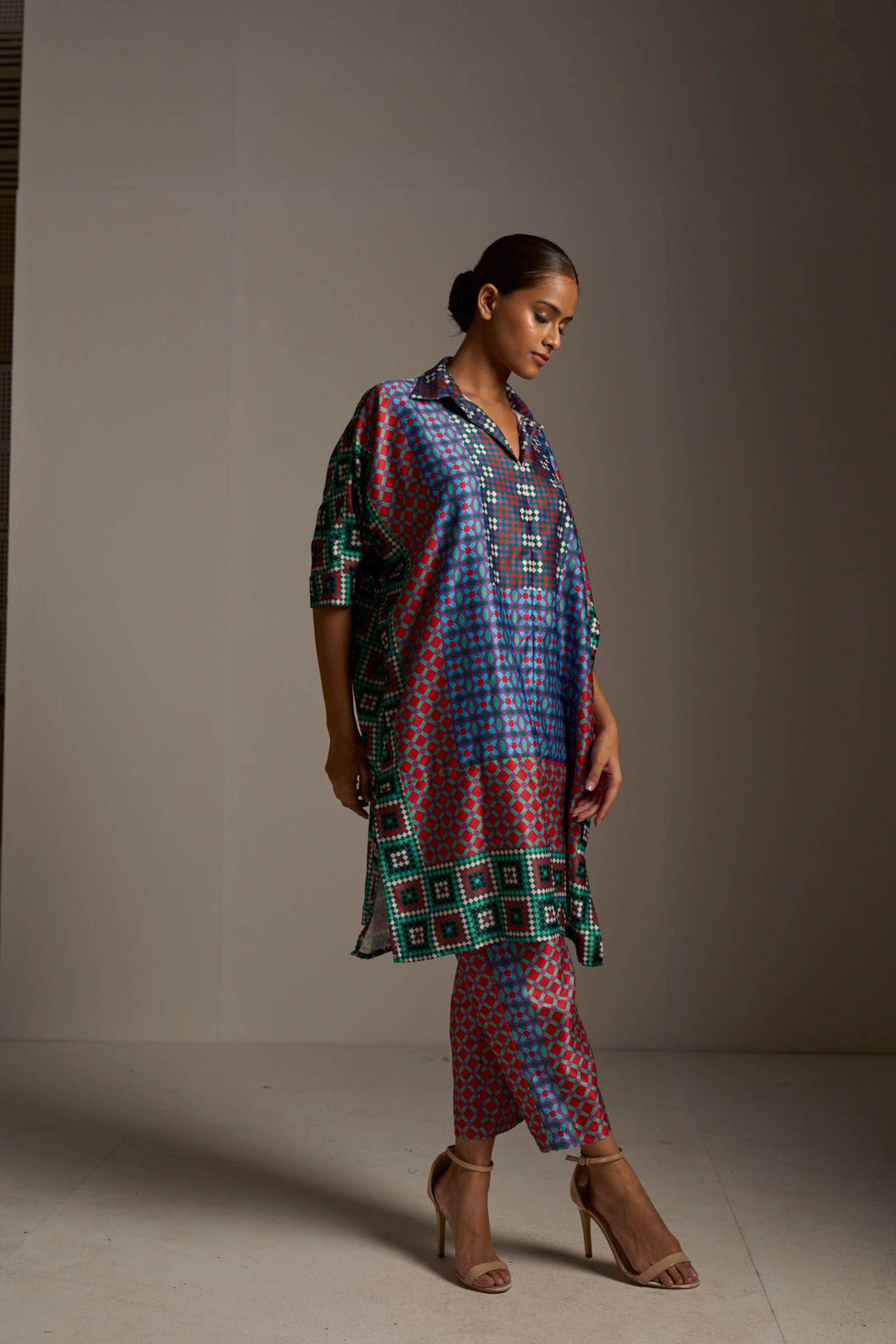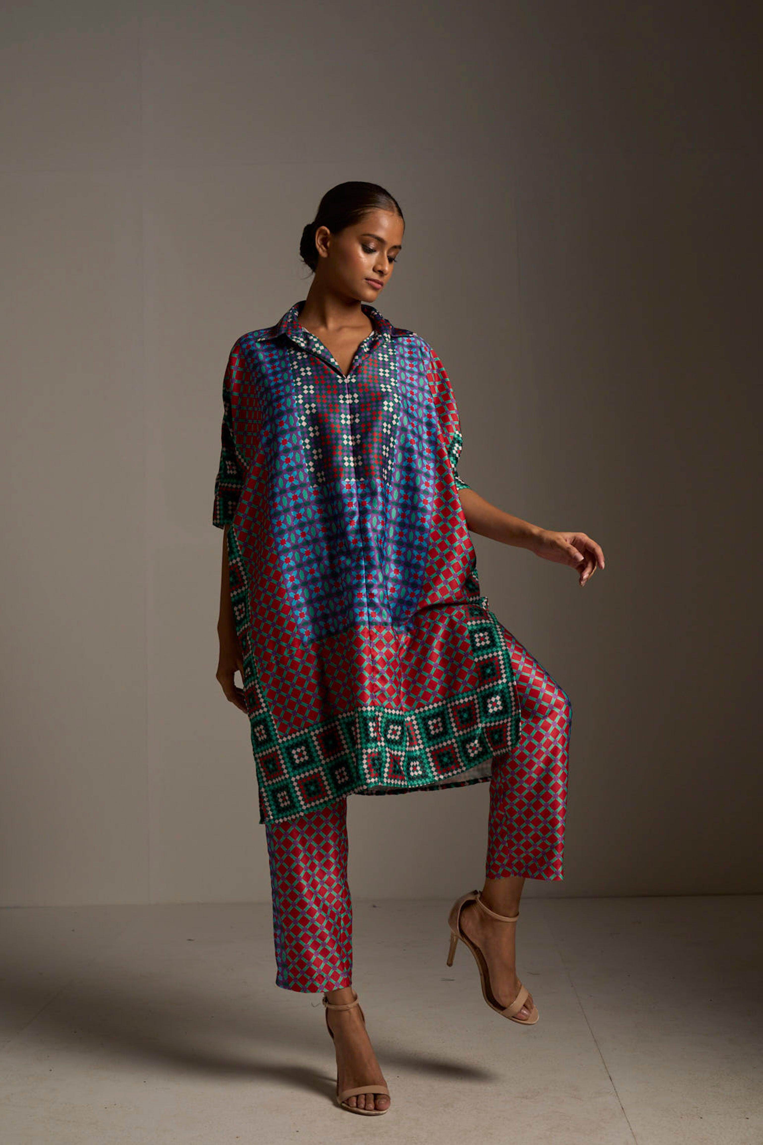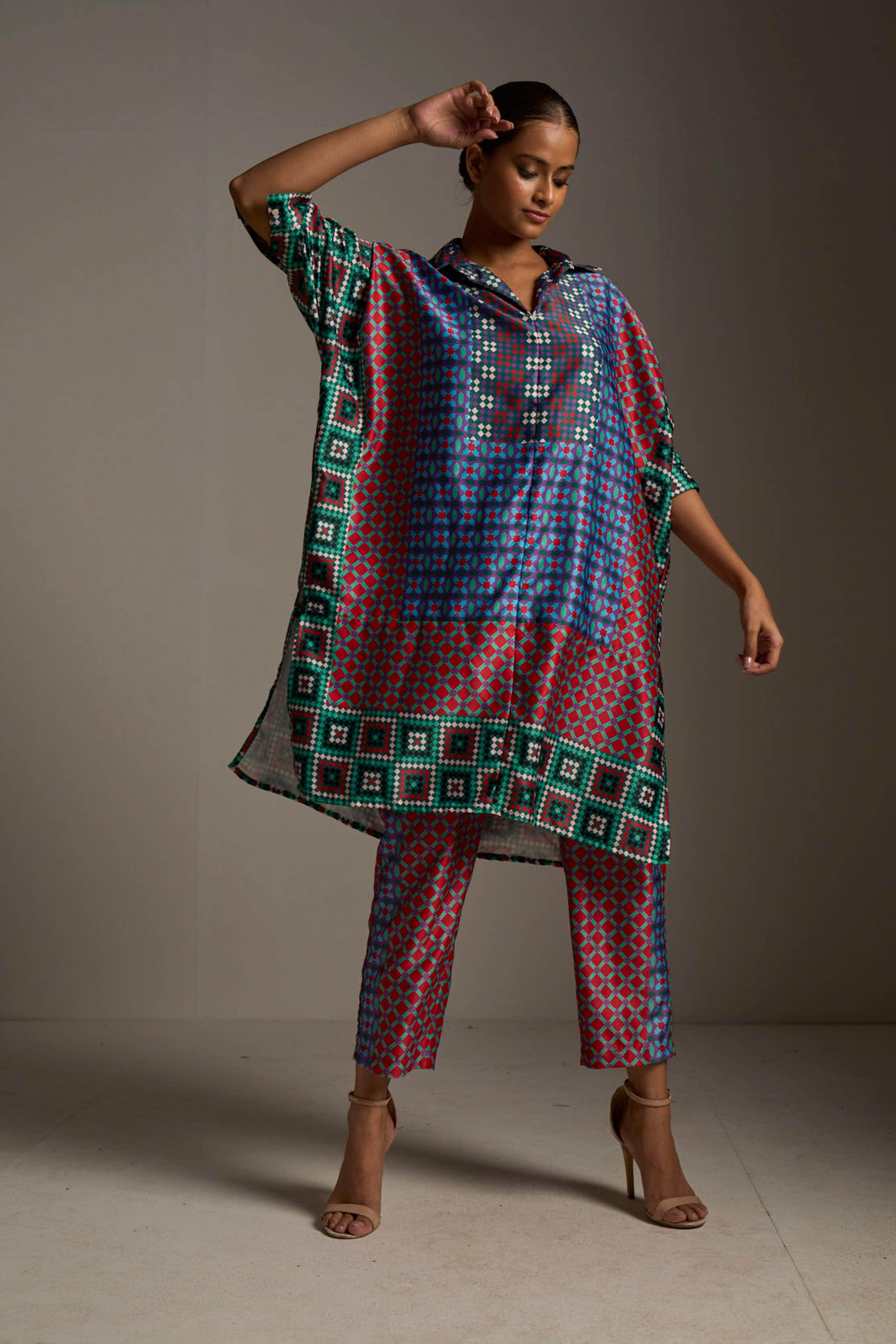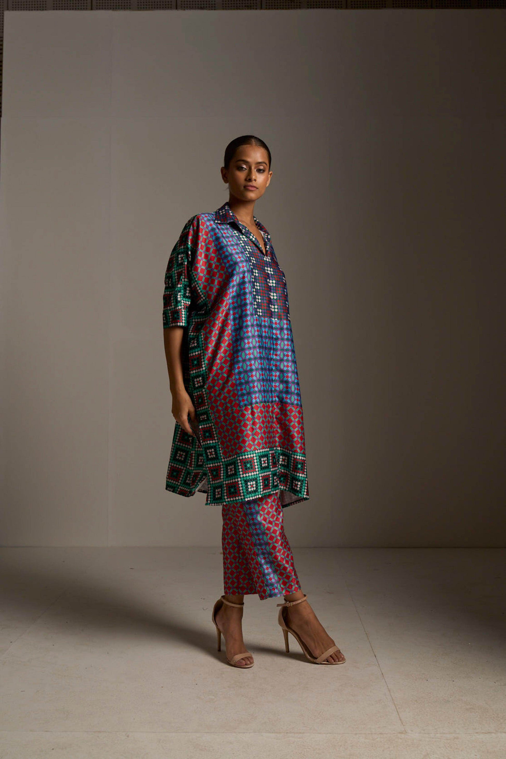 Boxy longline popover top. Placement border print inspired by moroccan mosaic tiles. Shirt collar with V-neck. Paired with pants with a placement border on the side. Elasticated at the waist, pockets on the sides.