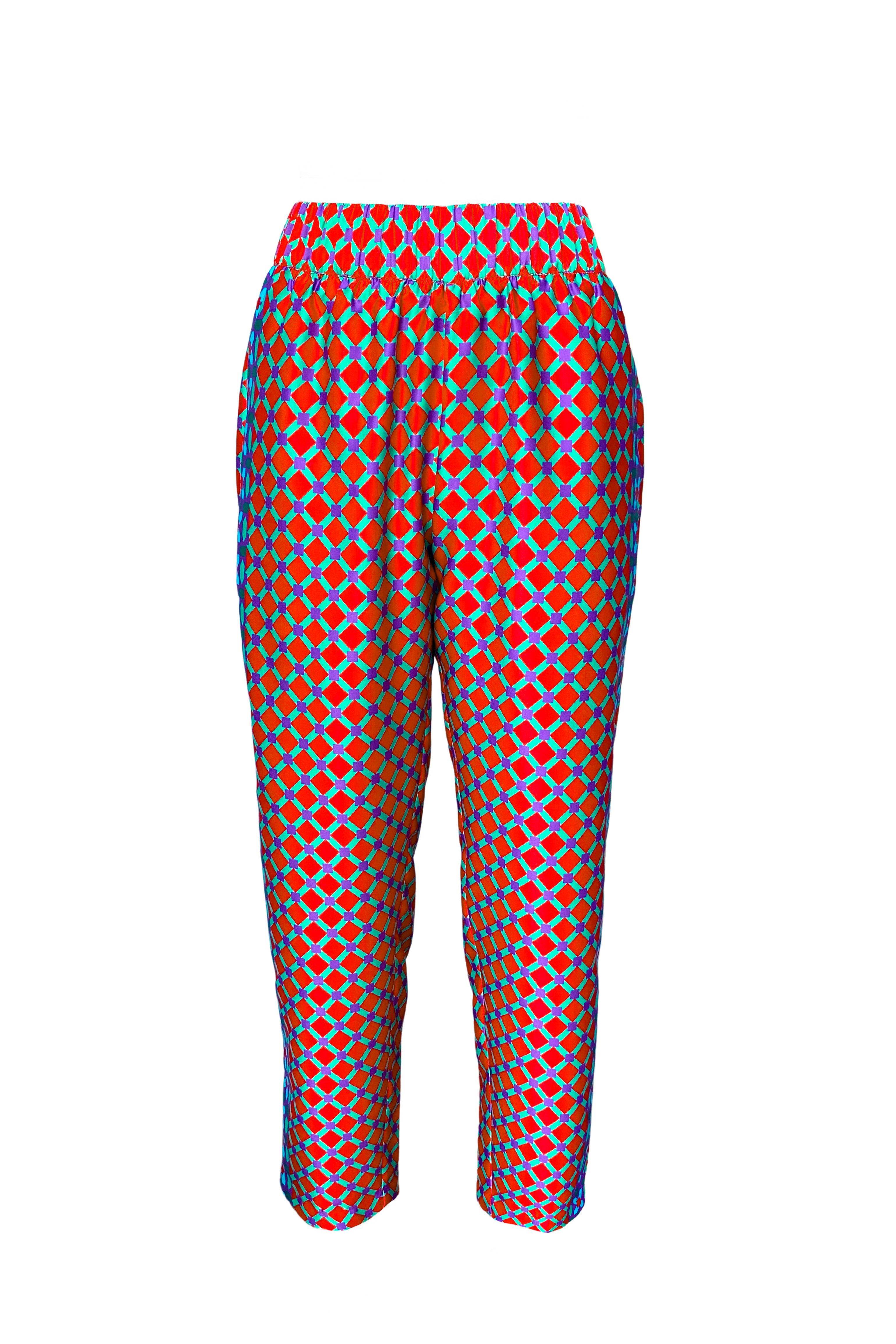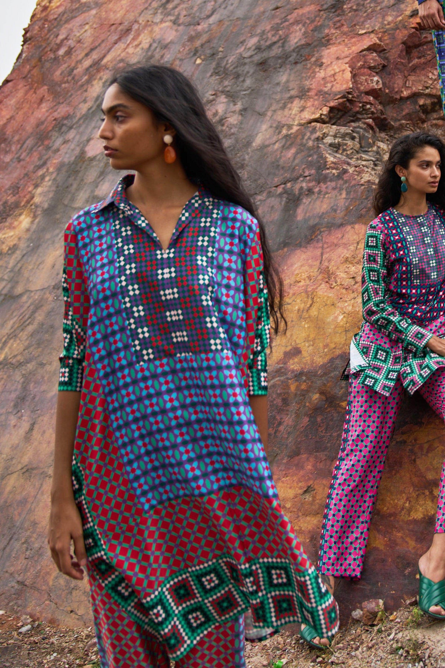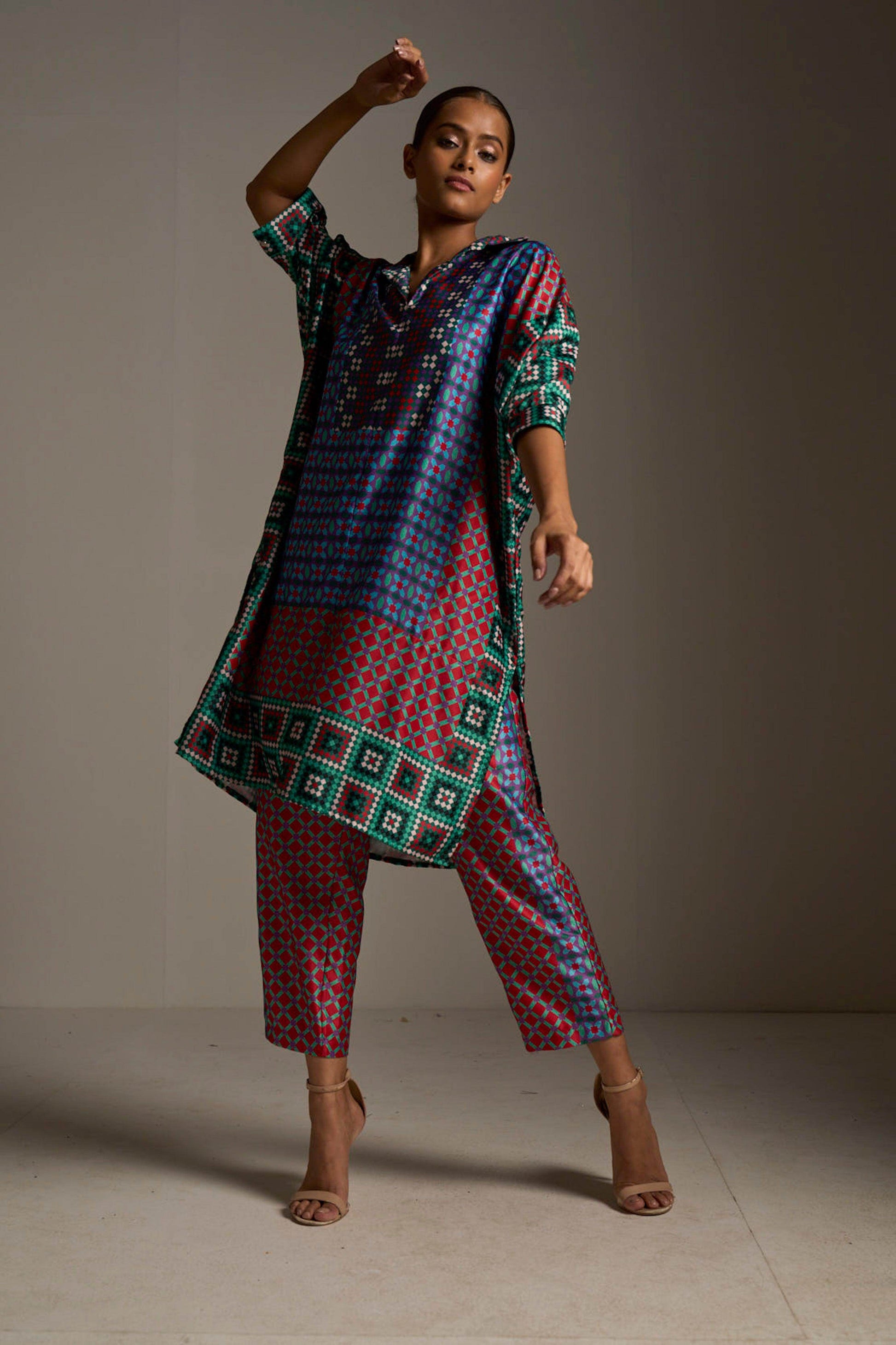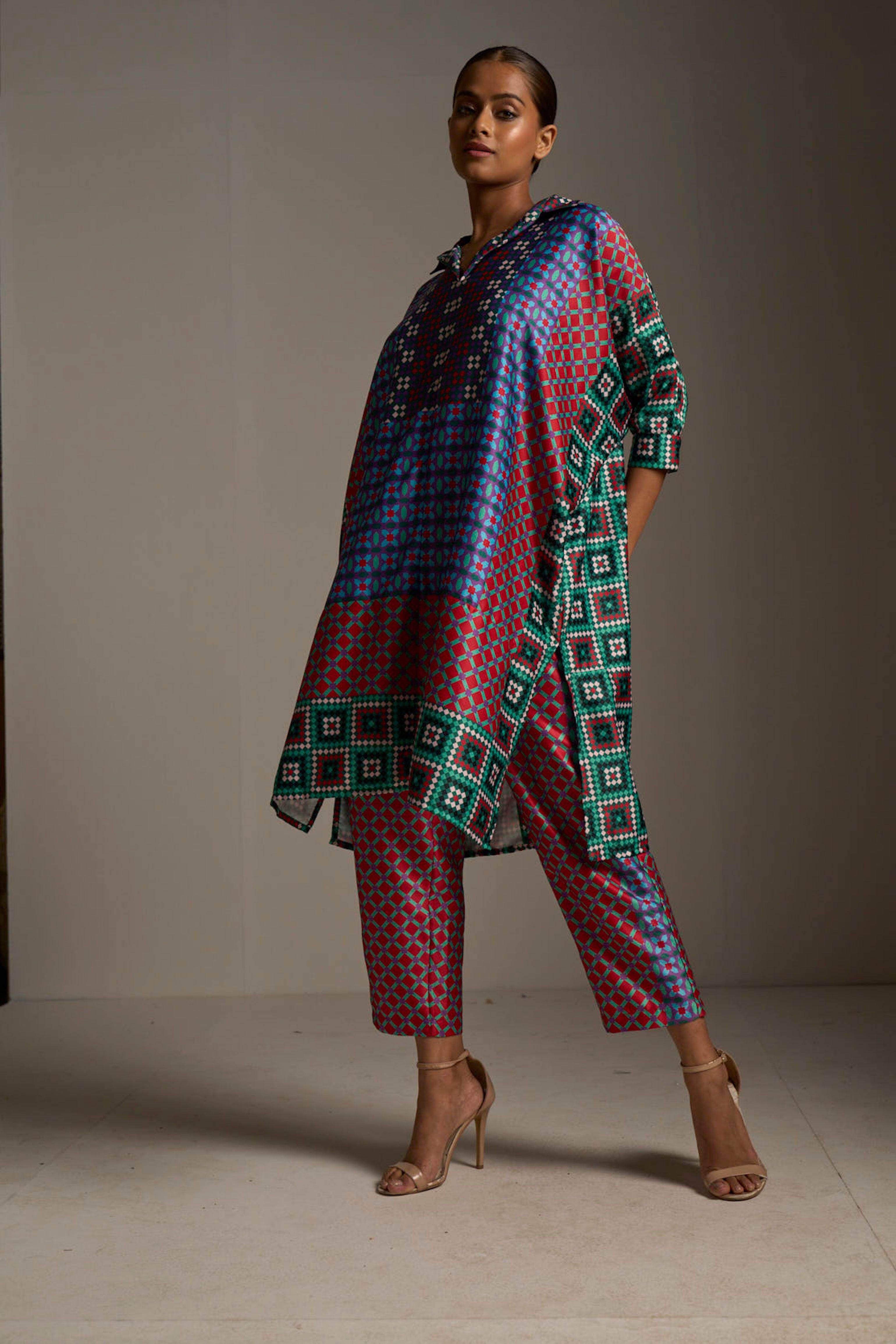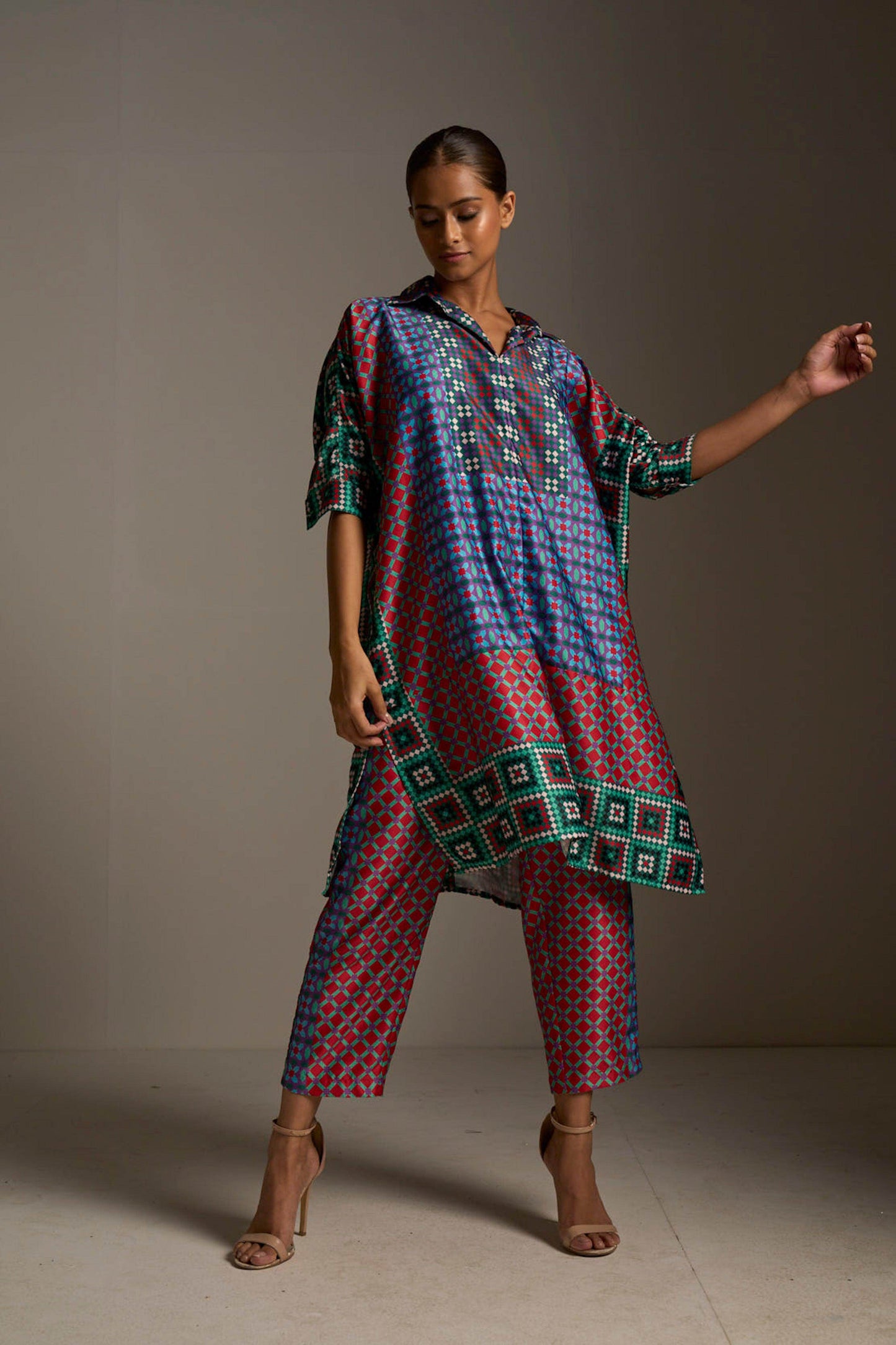 Boxy longline popover top. Placement border print inspired by moroccan mosaic tiles. Shirt collar with V-neck. Paired with pants with a placement border on the side. Elasticated at the waist, pockets on the sides.