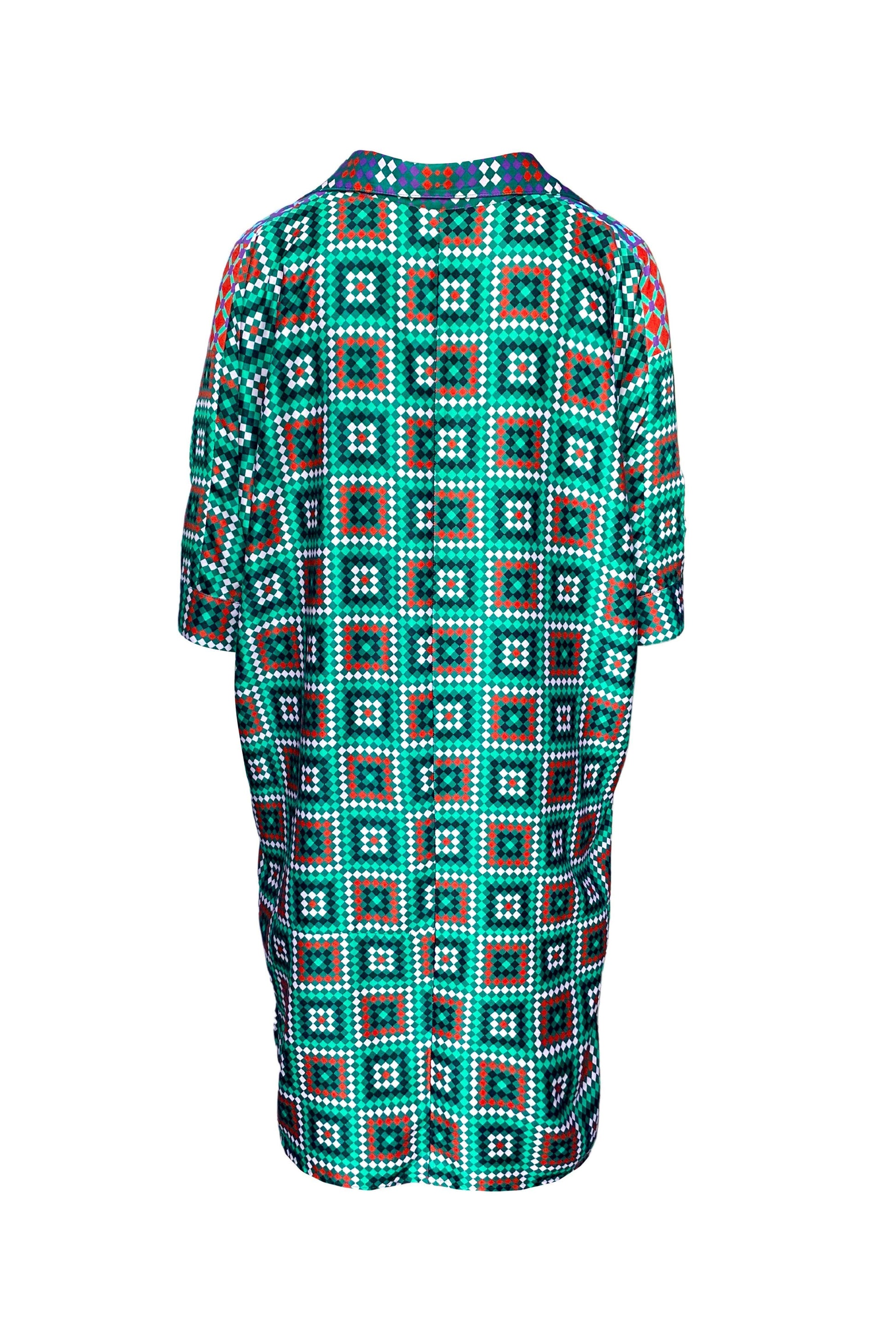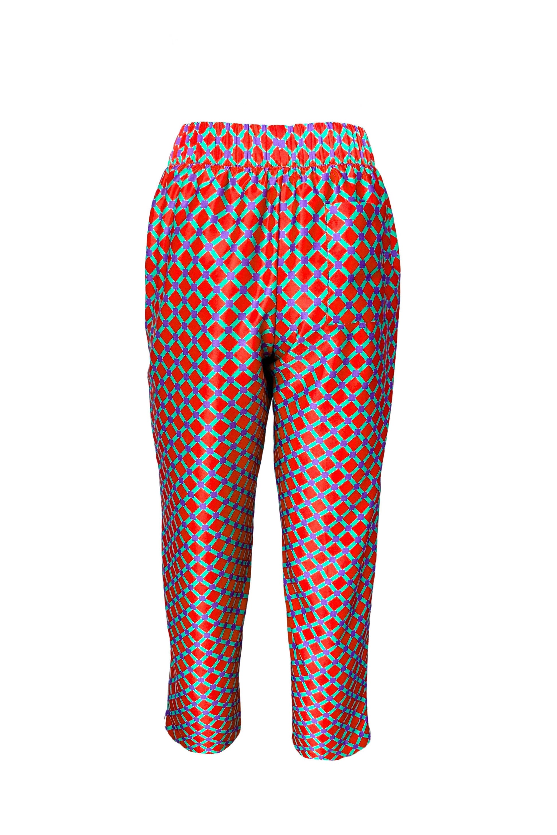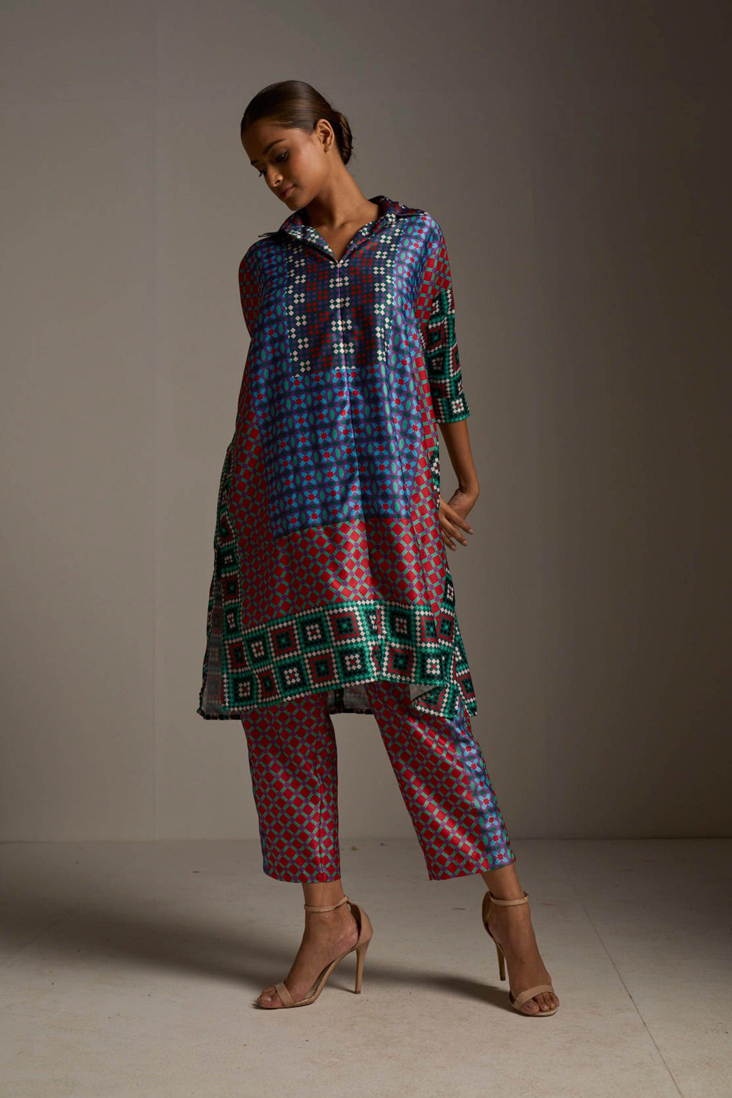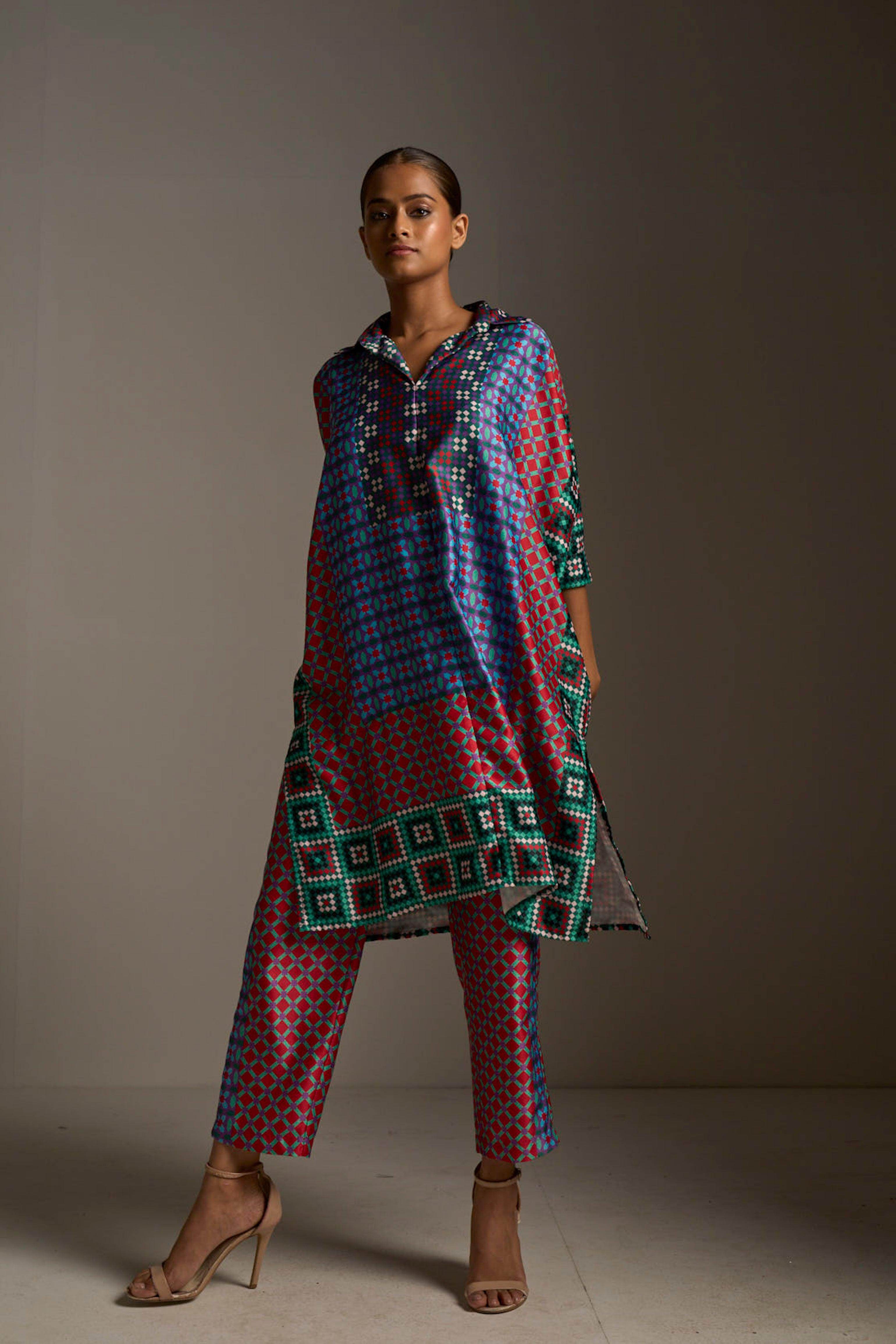 Boxy longline popover top. Placement border print inspired by moroccan mosaic tiles. Shirt collar with V-neck. Paired with pants with a placement border on the side. Elasticated at the waist, pockets on the sides.