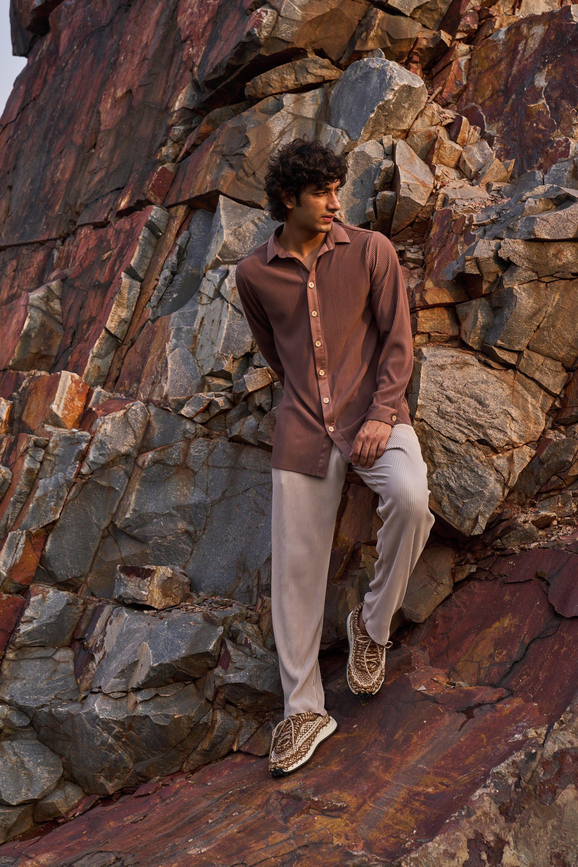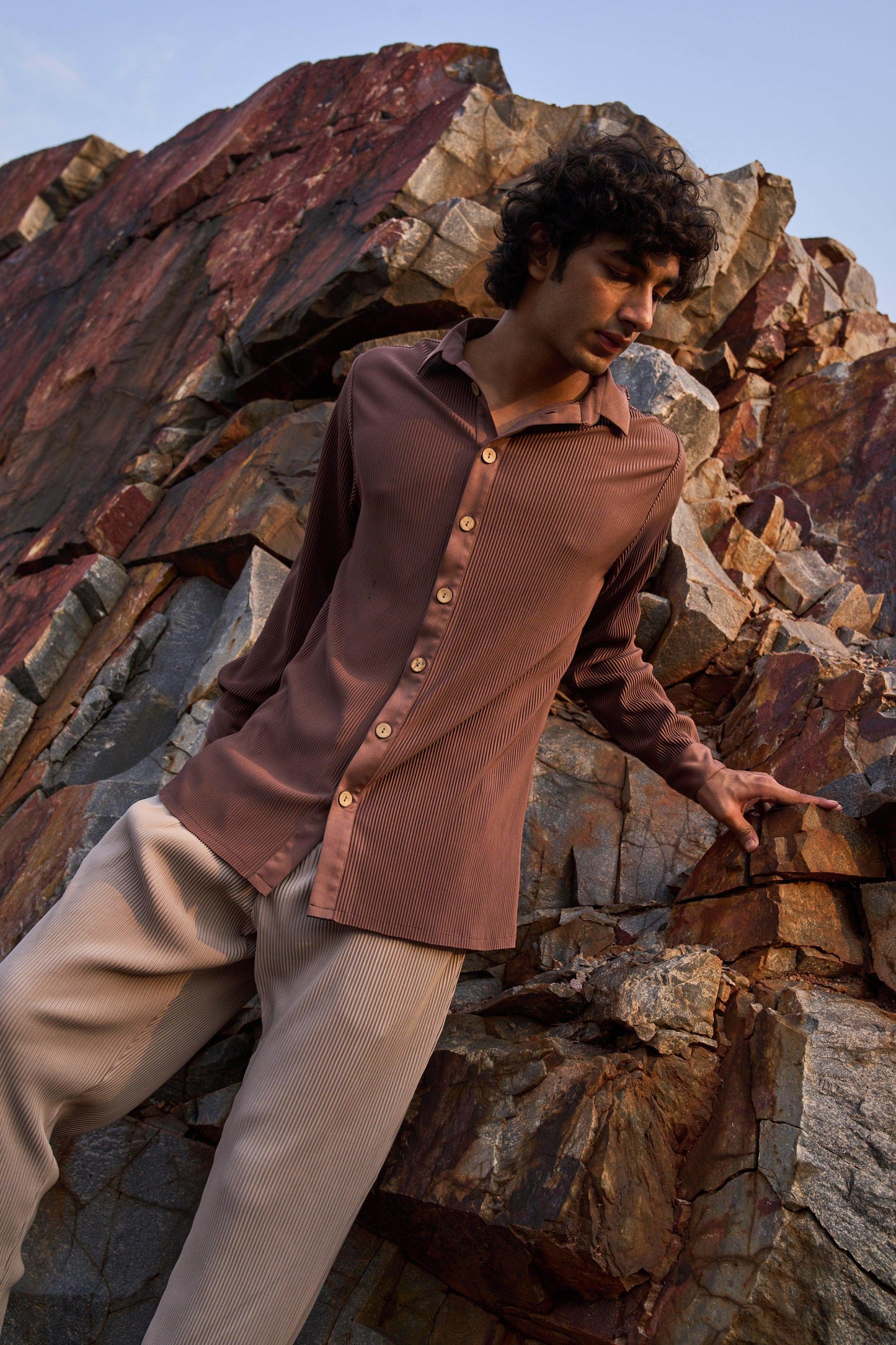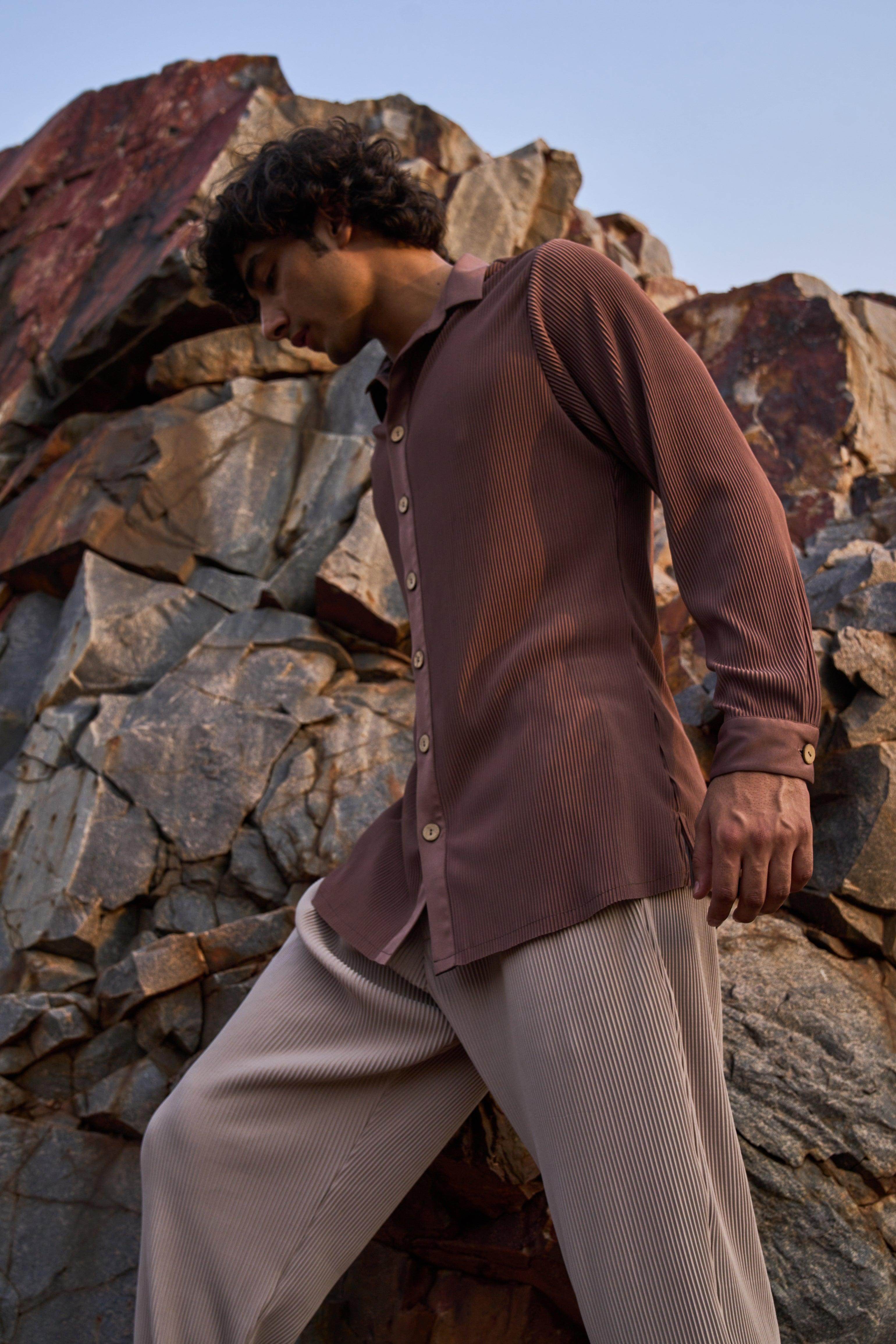 Pleated brown longline button-down shirt. Full sleeves. Wooden button front placket. Comfort fit. Paired with straight cut, pleated beige pants. Pockets in the side. Elasticated at the waist with zip fly and hook closure in the front.