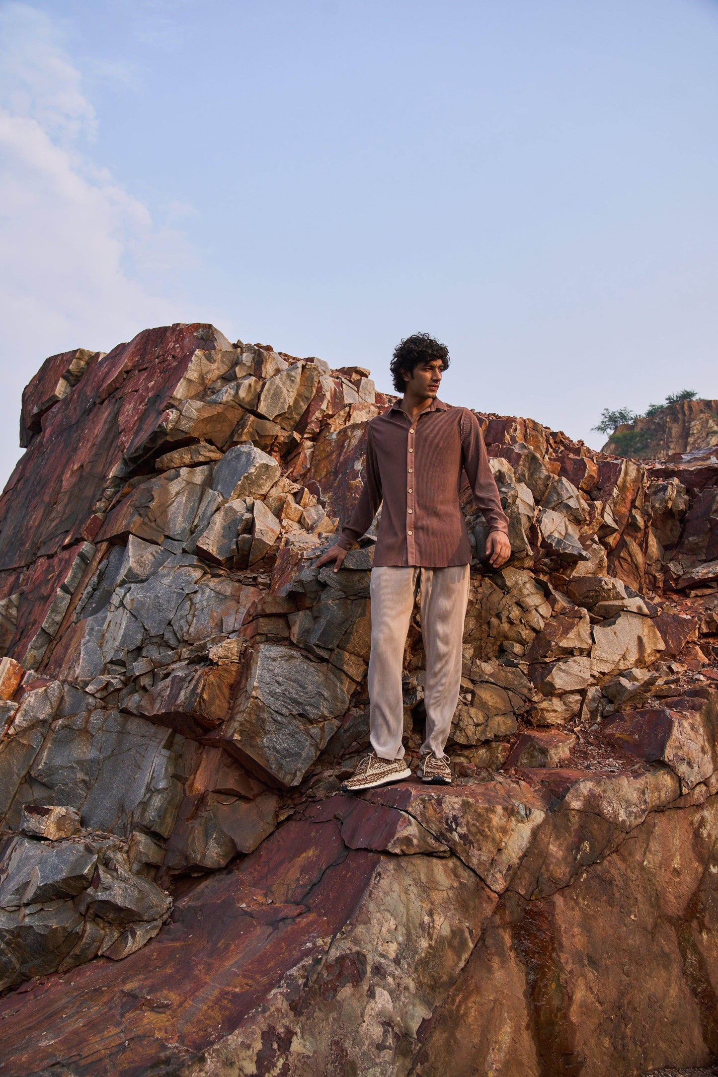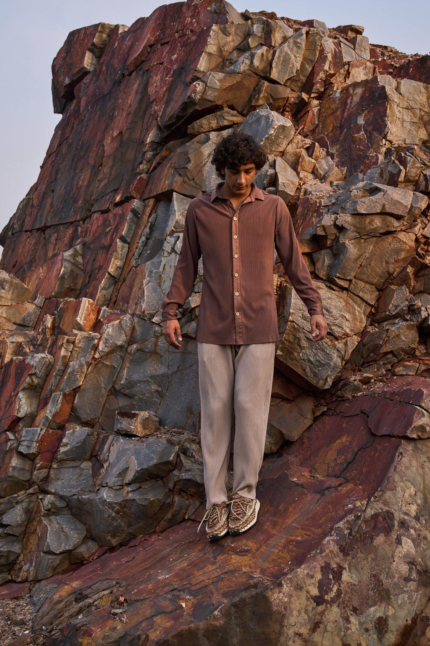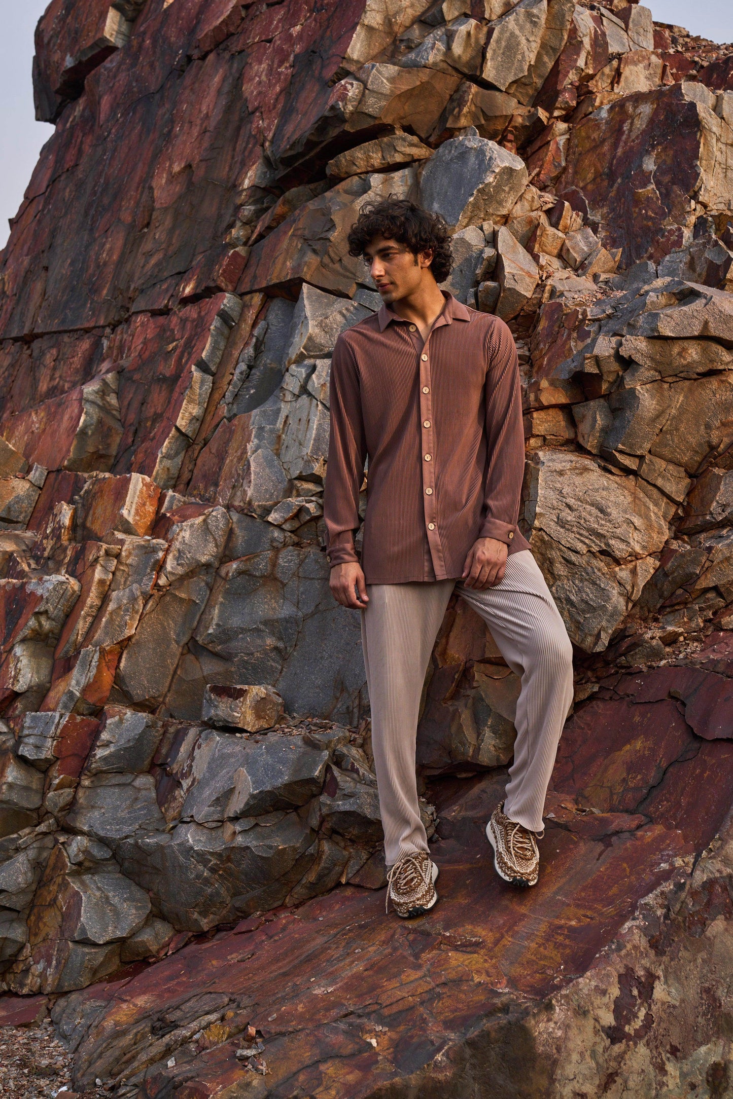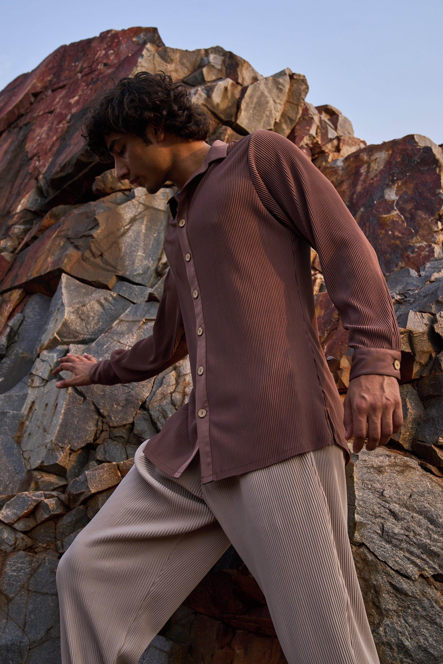 Pleated brown longline button-down shirt. Full sleeves. Wooden button front placket. Comfort fit. Paired with straight cut, pleated beige pants. Pockets in the side. Elasticated at the waist with zip fly and hook closure in the front.