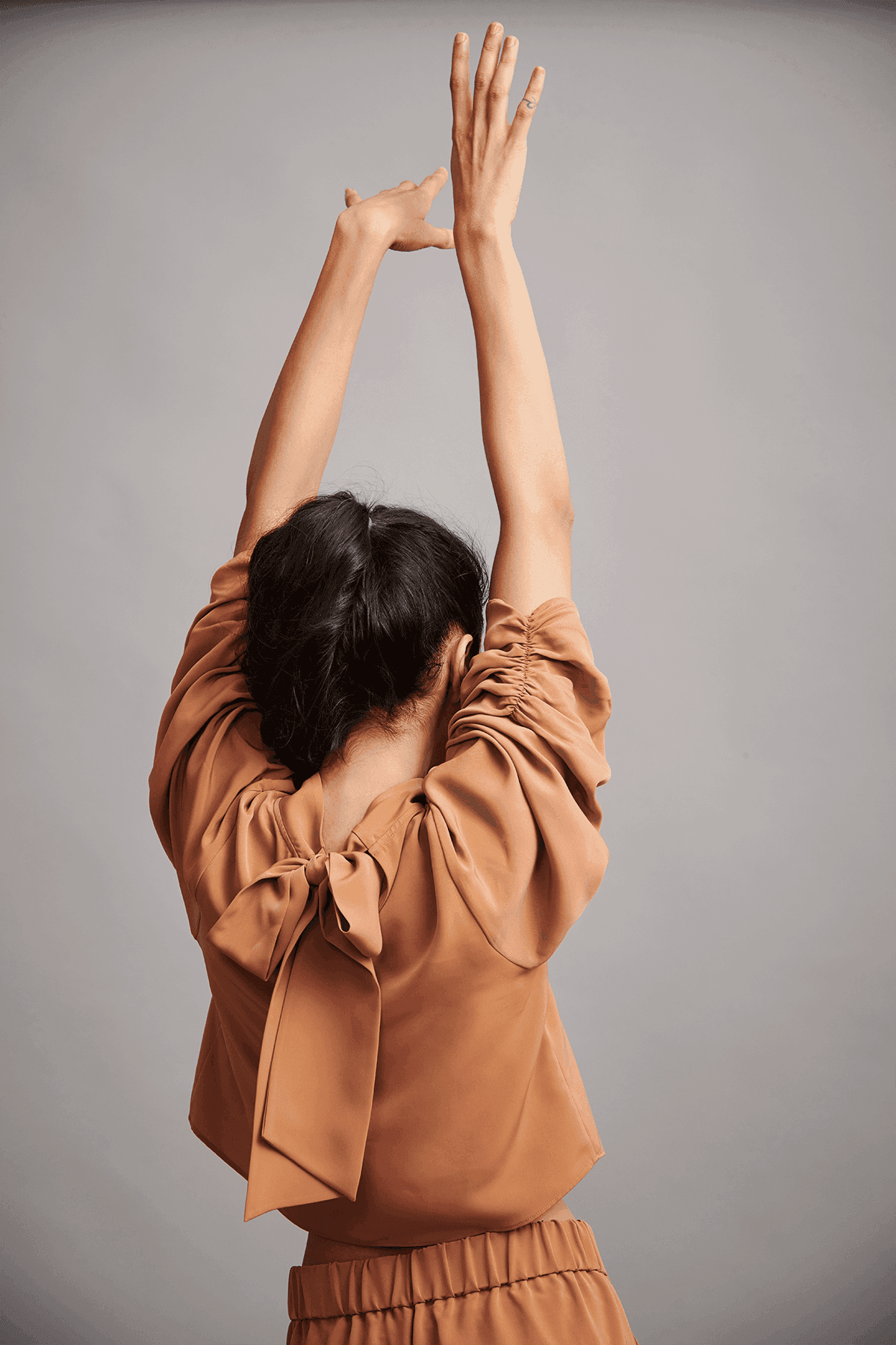 High-neck boxy top with back-tie detail. Three-fourth sleeves with ruched cuffs. Elastic waist, wide-legged bottom. Flowy fabric. Paired best with Caramel Back Tie Blouse.