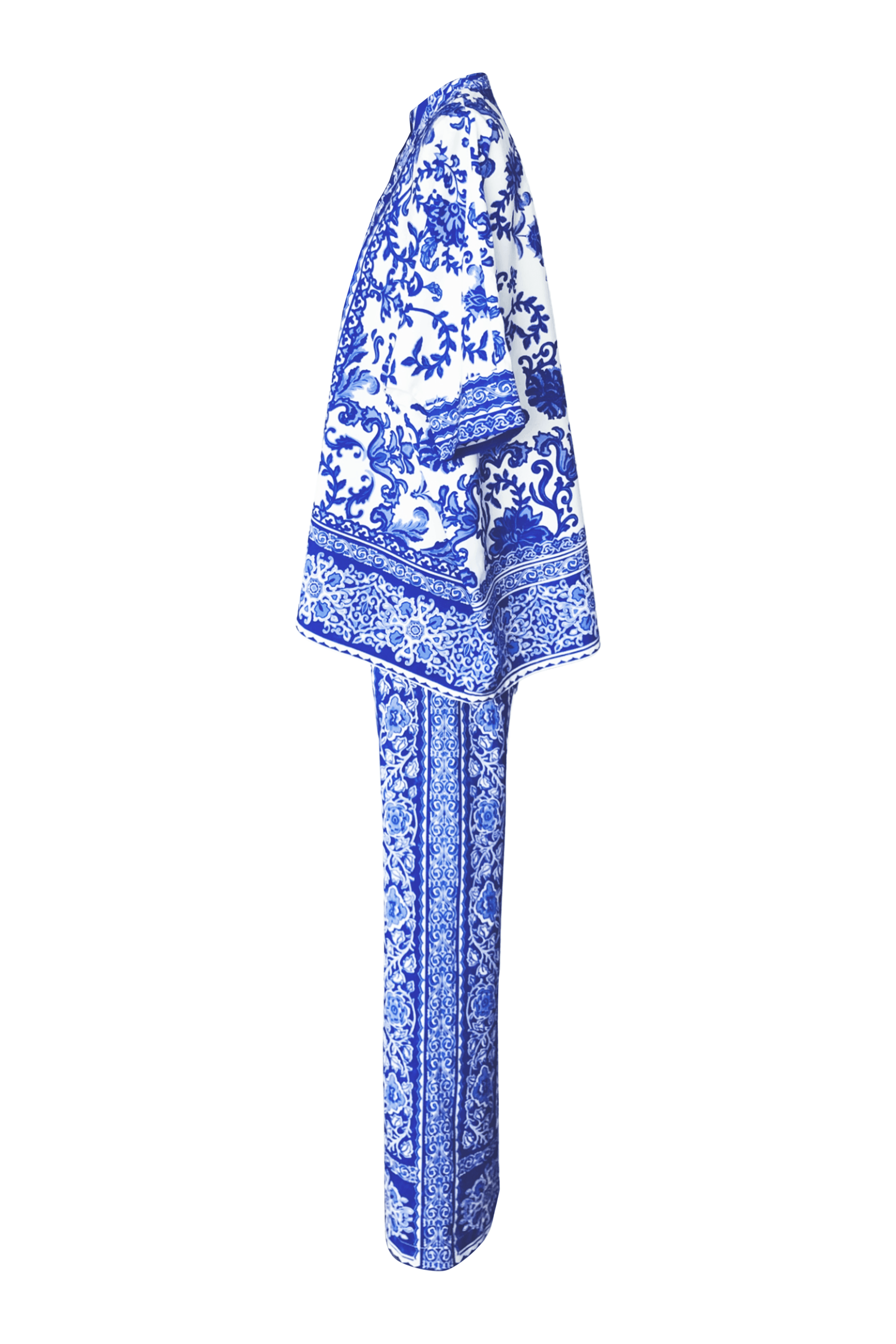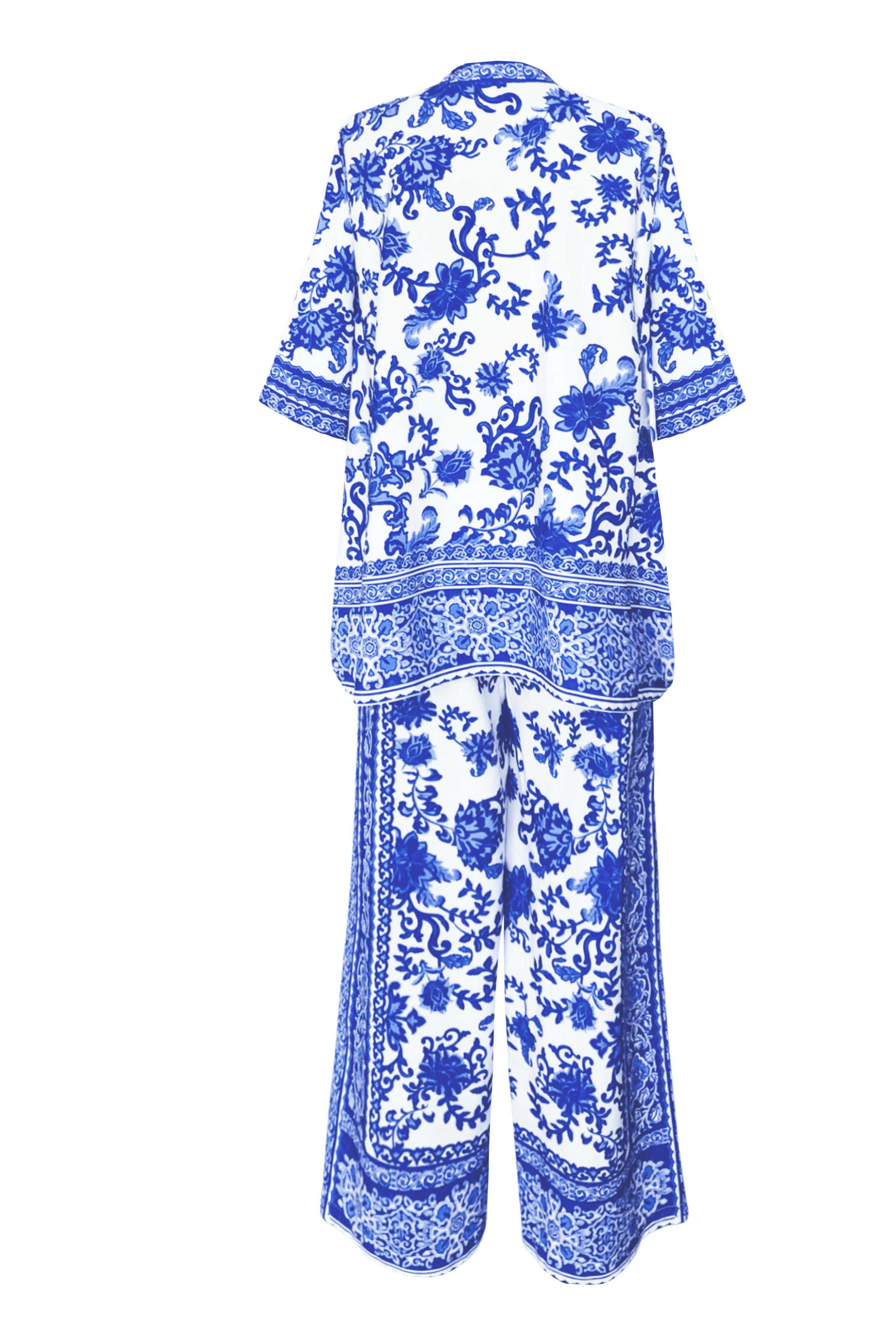 Blue on white floral ceramic inspired printed coord set. Placed borders around the center placket, sleeve cuffs, and the bottom hem of the top. Button-down half sleeve boxy shirt with snap button closure. Paired with matching straight-fit pants. Hook and eye closure, pockets on the side and back. Zip fly.