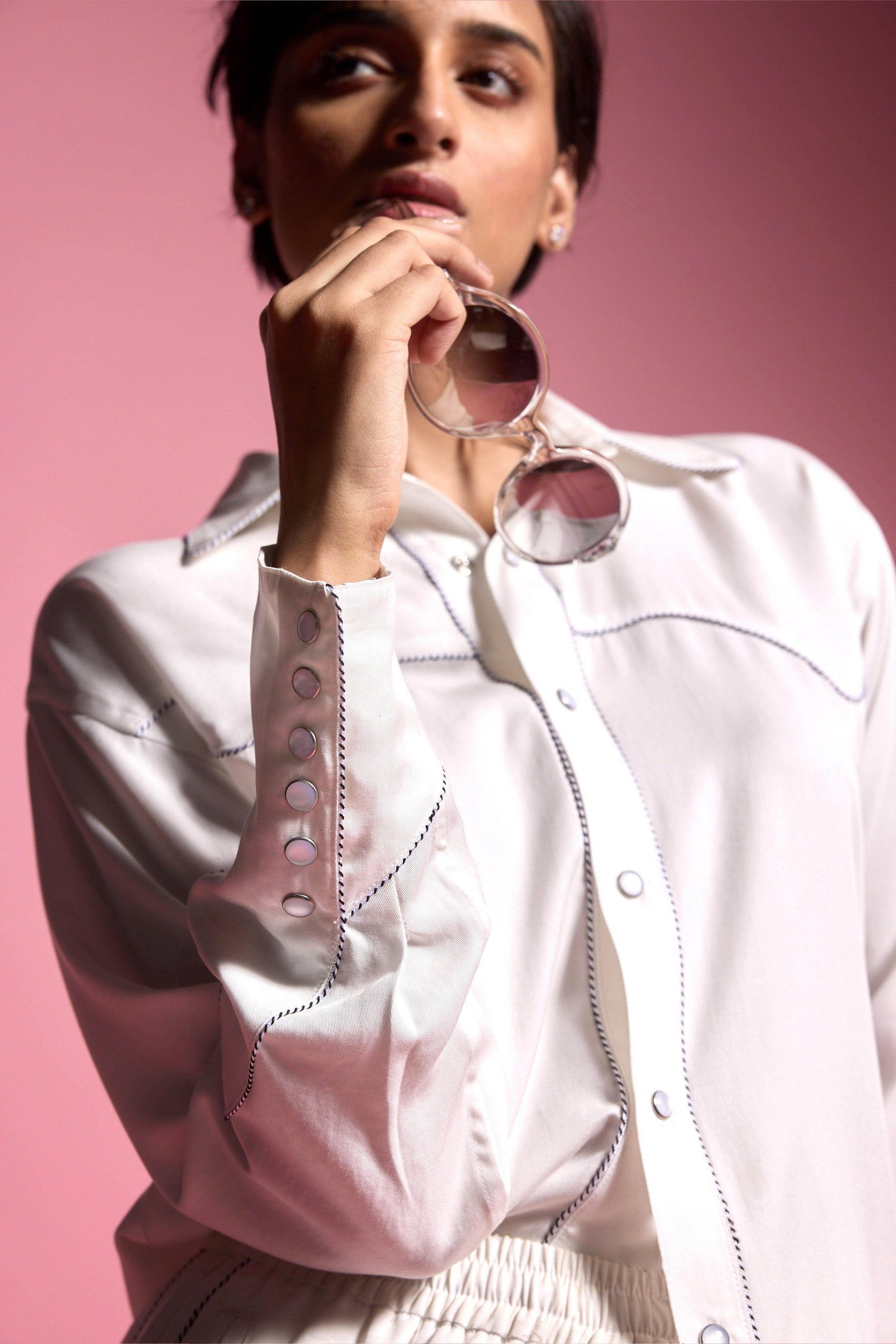 Off-white shirt made from sustainable, breathable Tencel. Features decorative piping inserts on the collar, placket, front yoke, back yoke, and sleeve cuffs, inspired by old Western style. Snap pearl buttons on the front placket and exaggerated sleeve cuffs.
