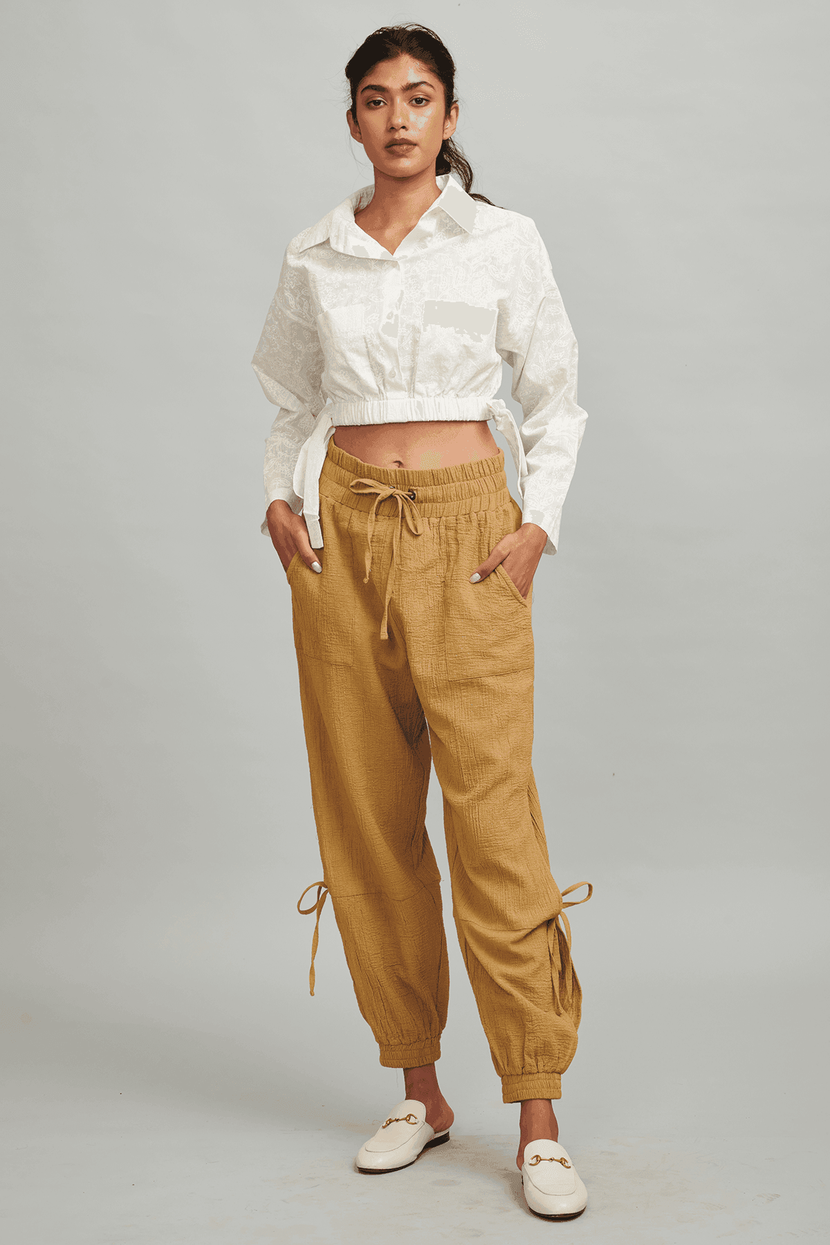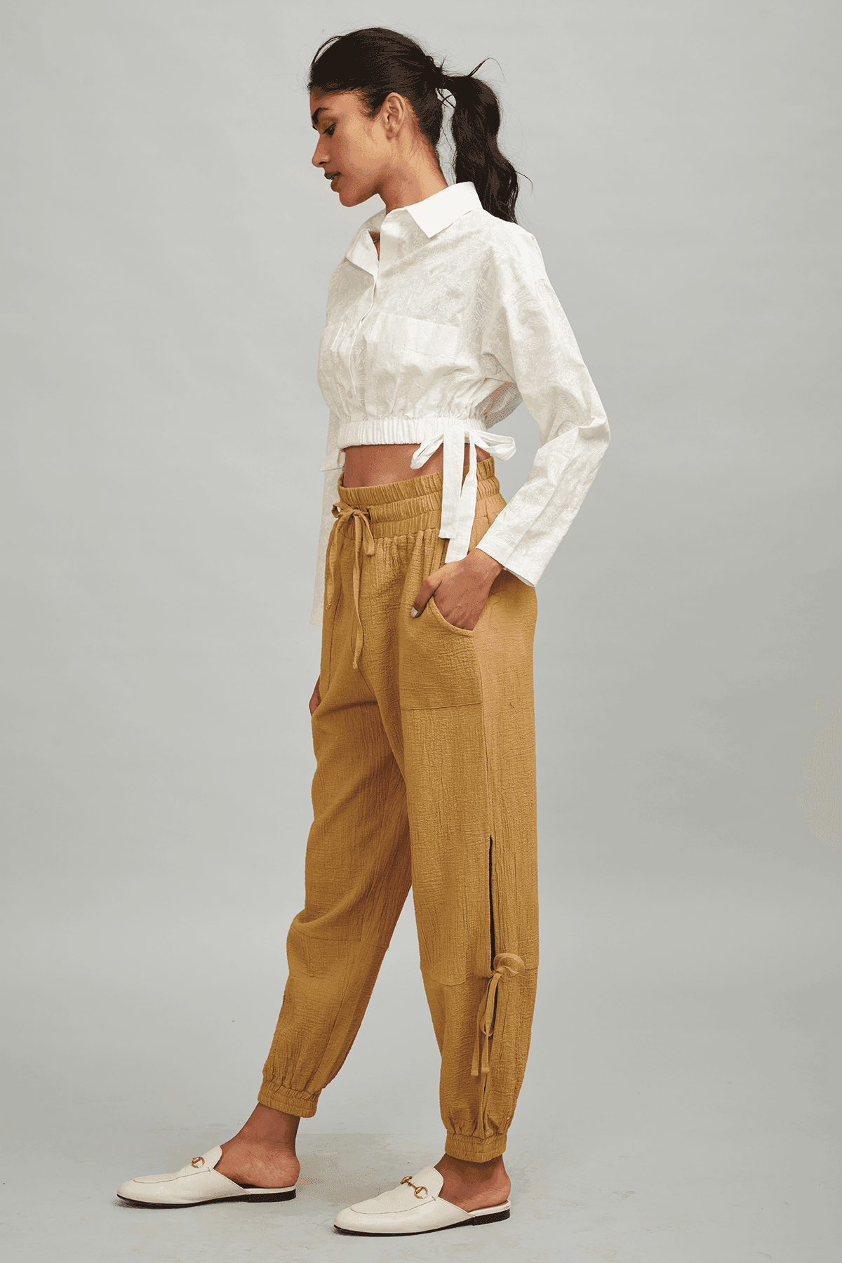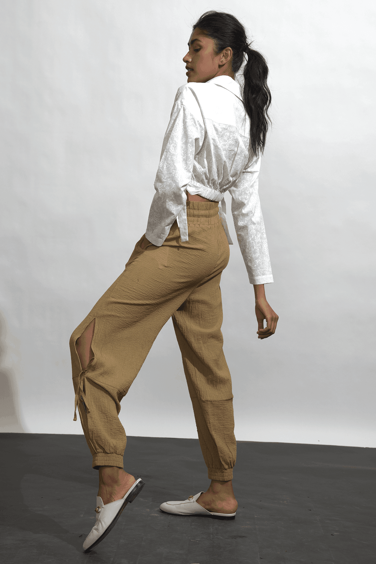 Woven cotton crinkle jogger with side slit up to the knee. Tie ups on the side. Elasticated waist and cuff.
