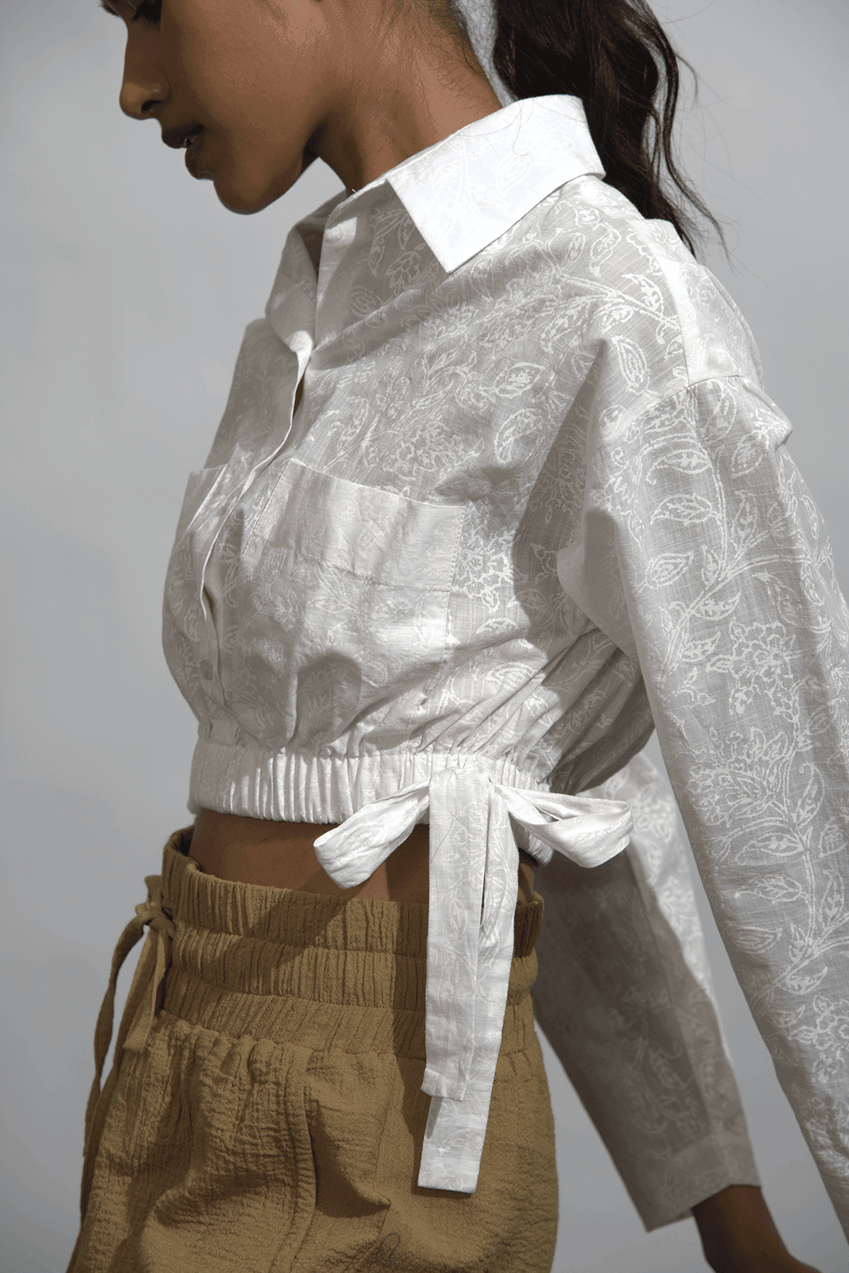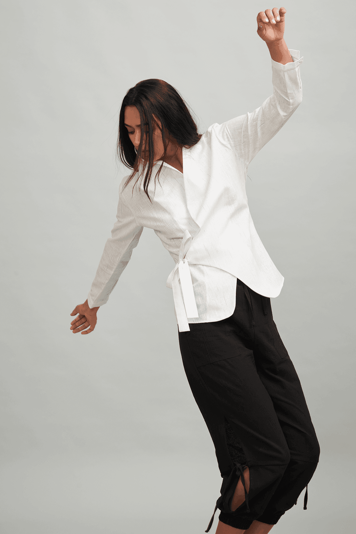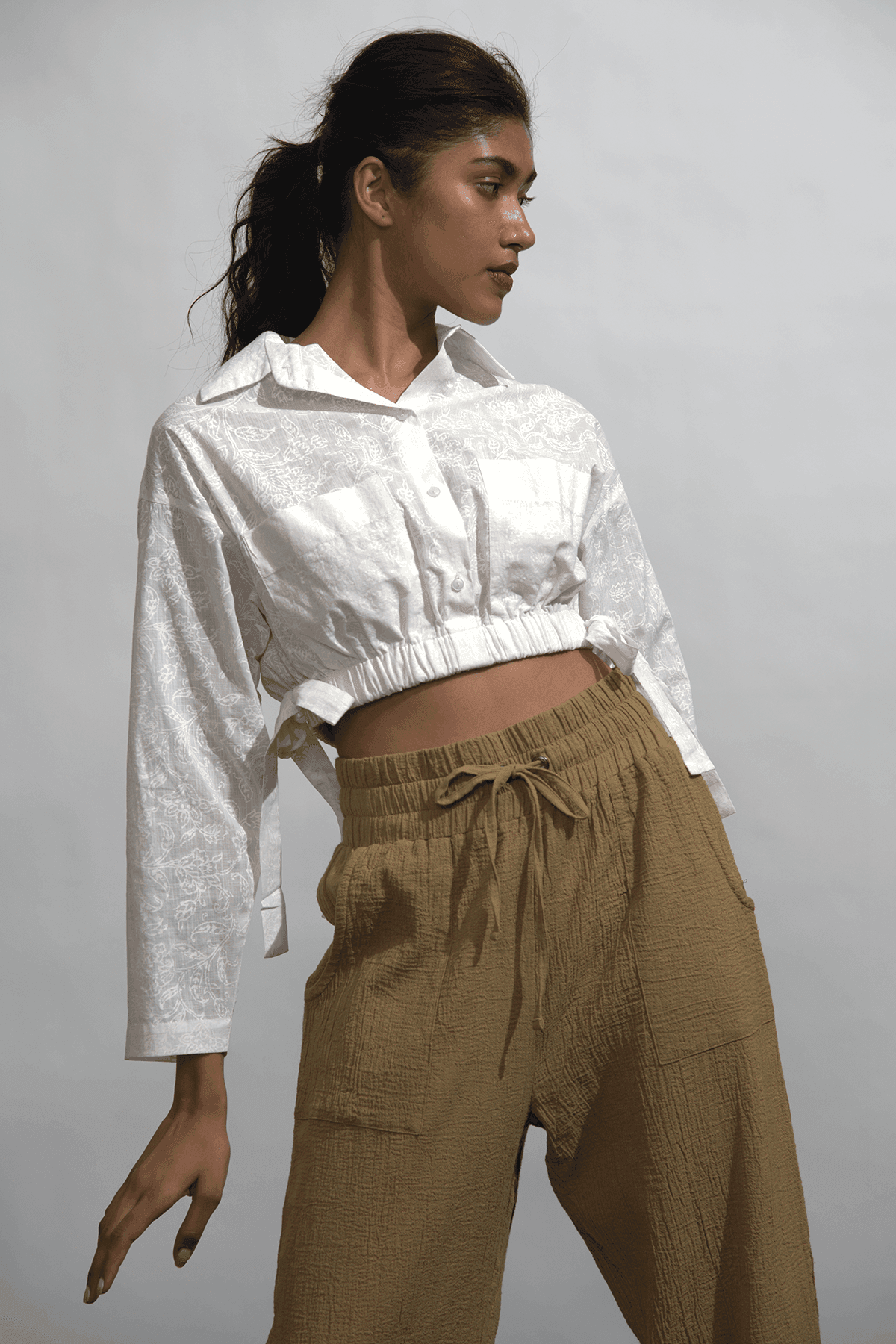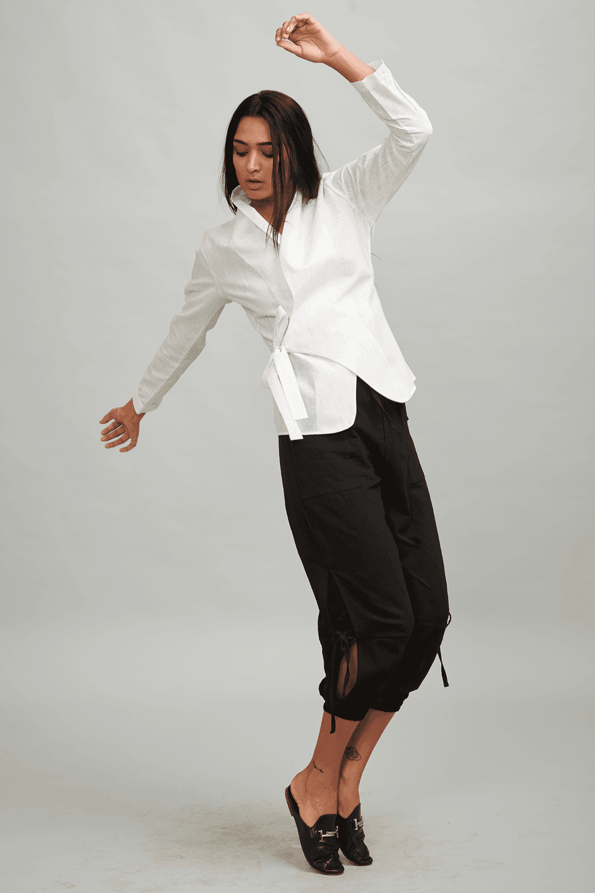 Woven cotton crinkle jogger with side slit up to the knee. Tie ups on the side. Elasticated waist and cuff.
