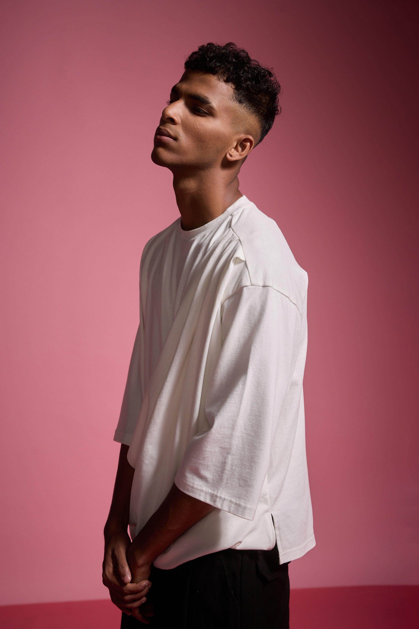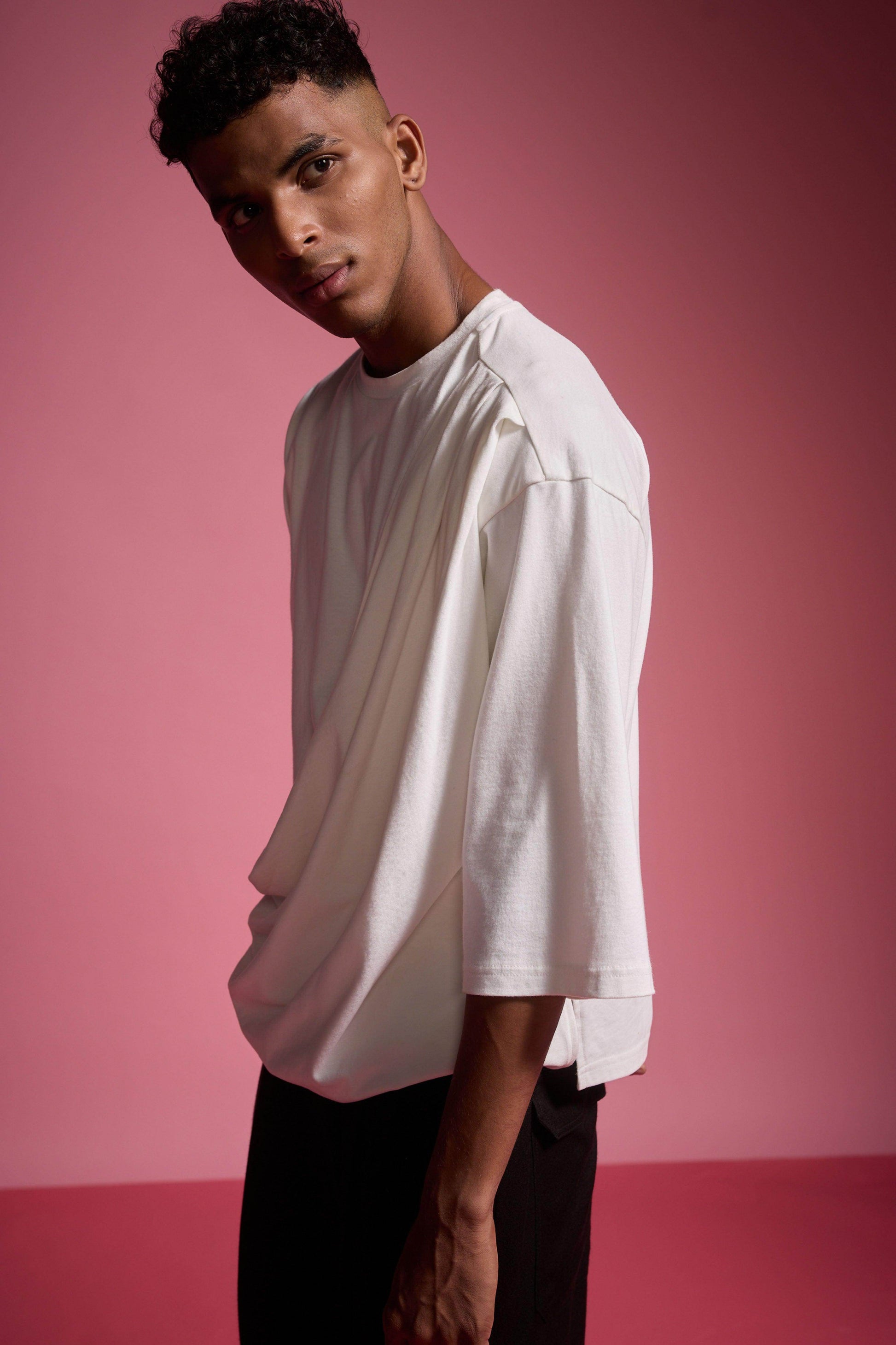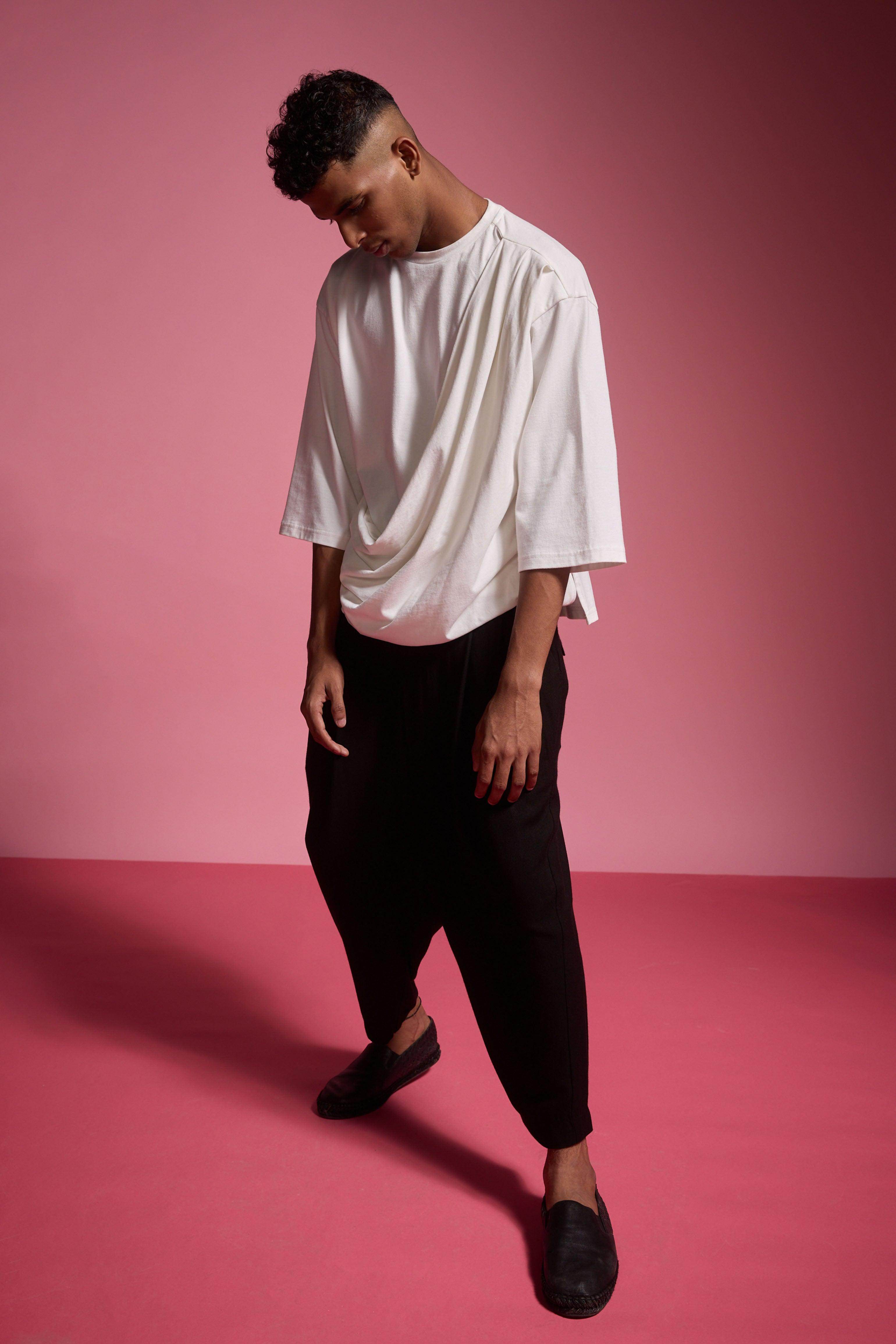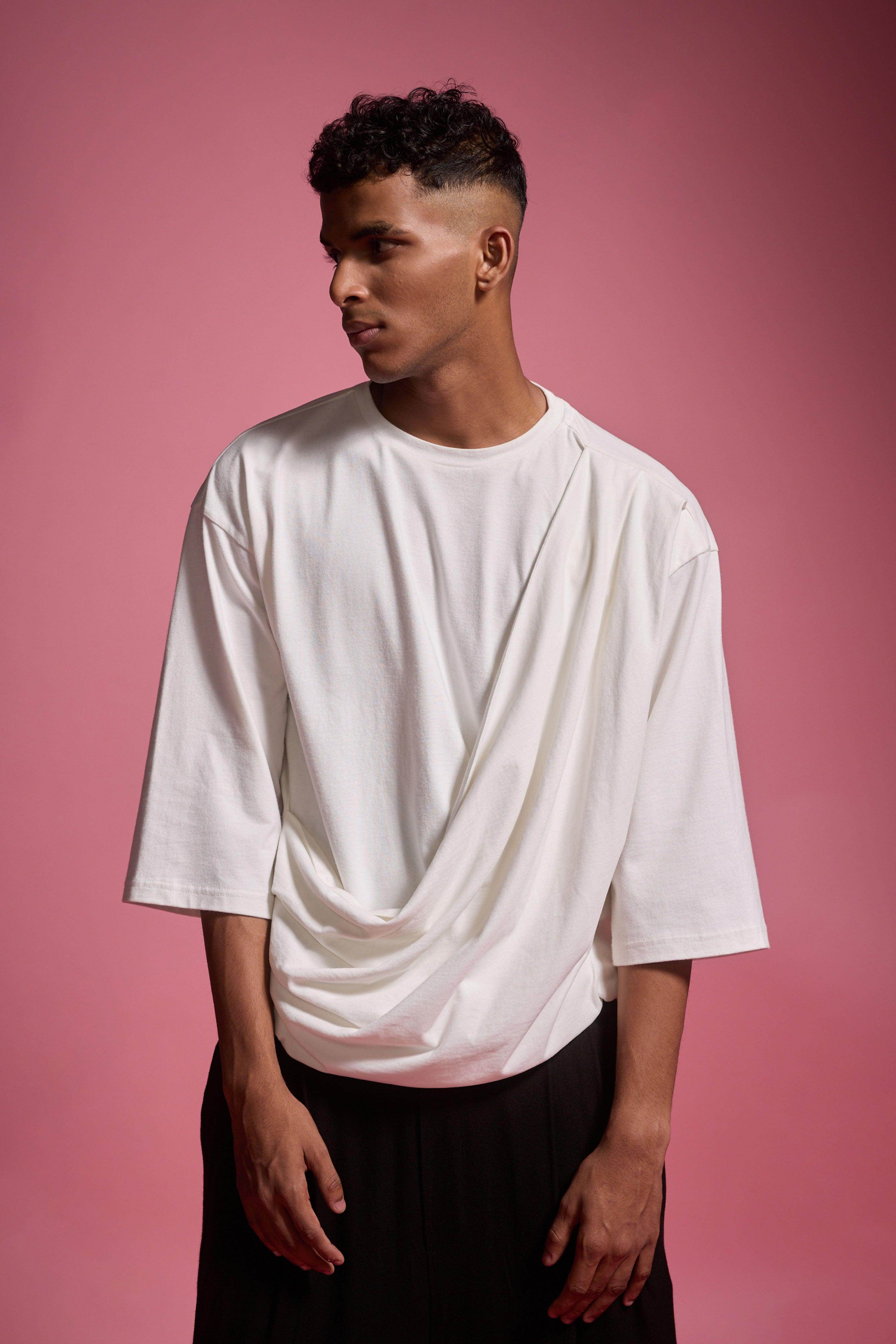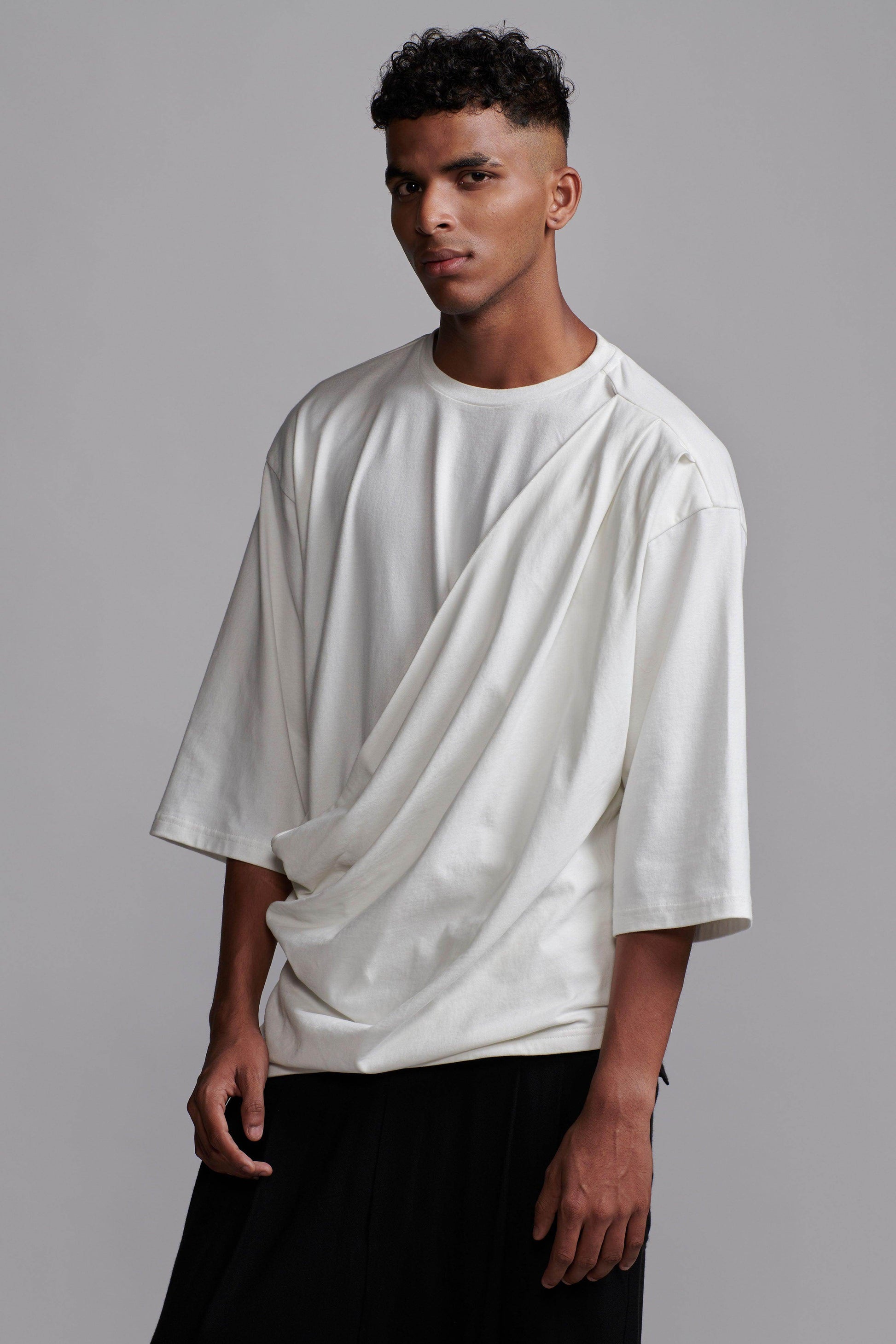 Organic cotton brushed jersey tee with a drape panel attached at the left shoulder, flowing down to the front right hem. Features a round neck, cropped sleeves, and an asymmetric hem.