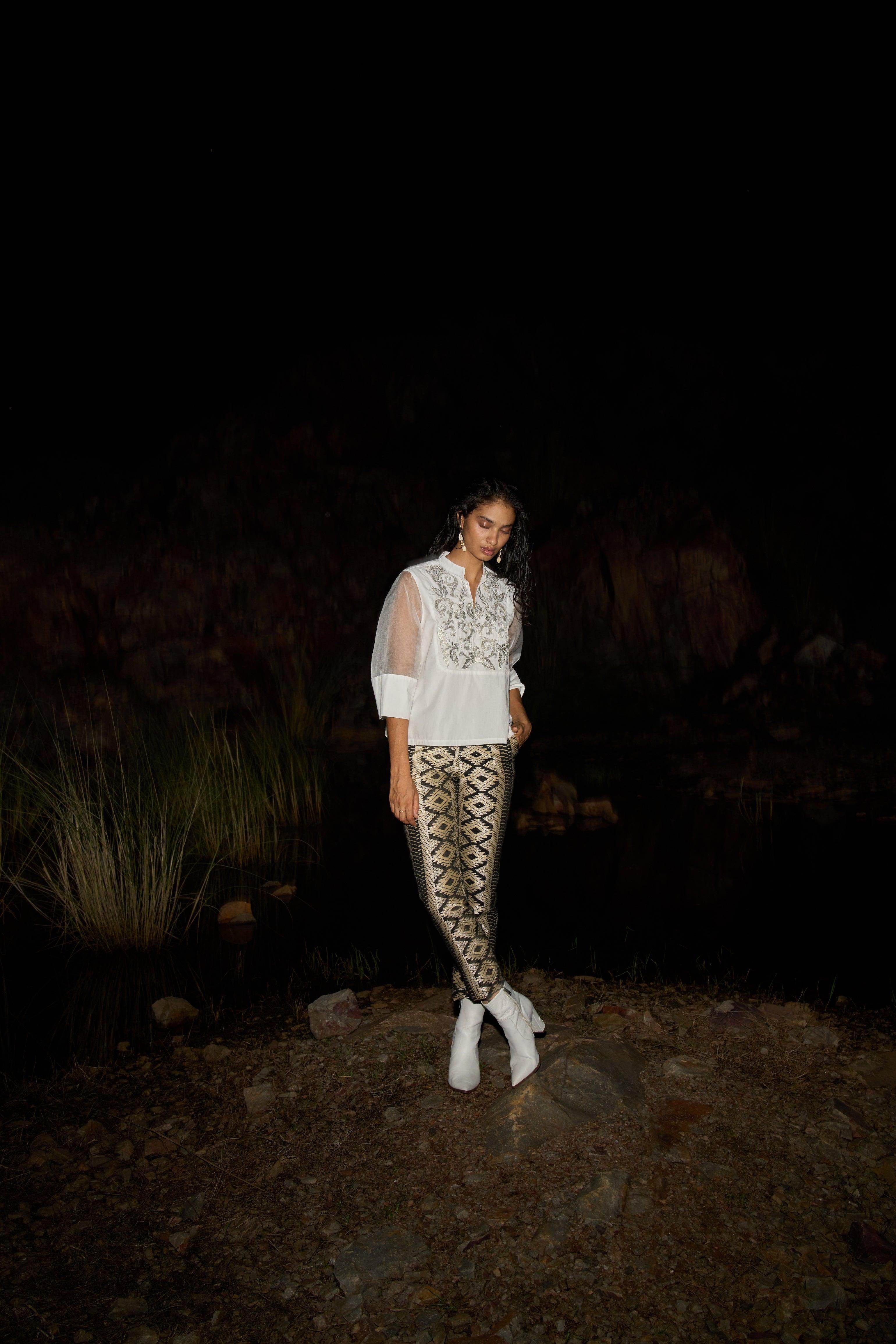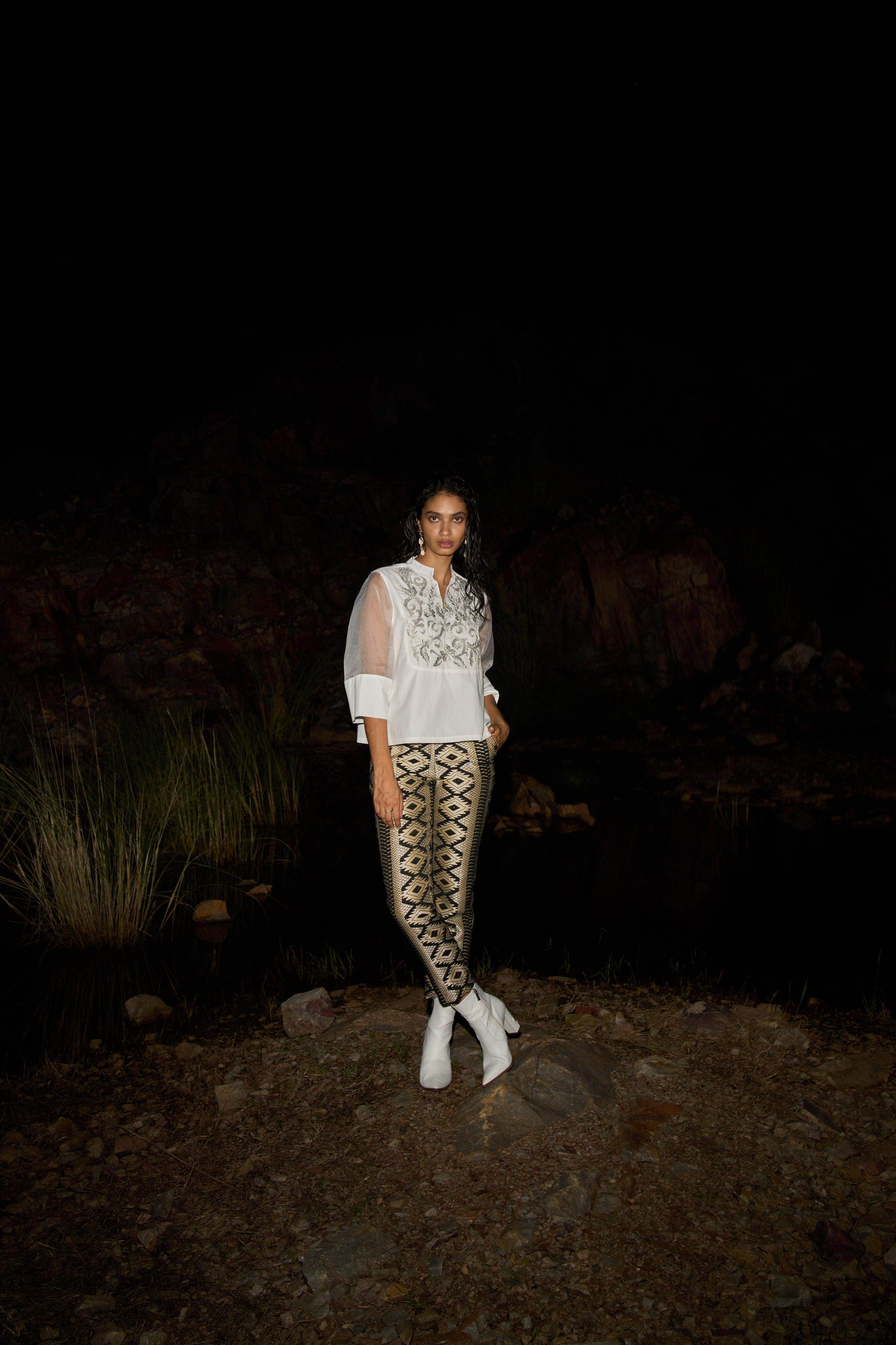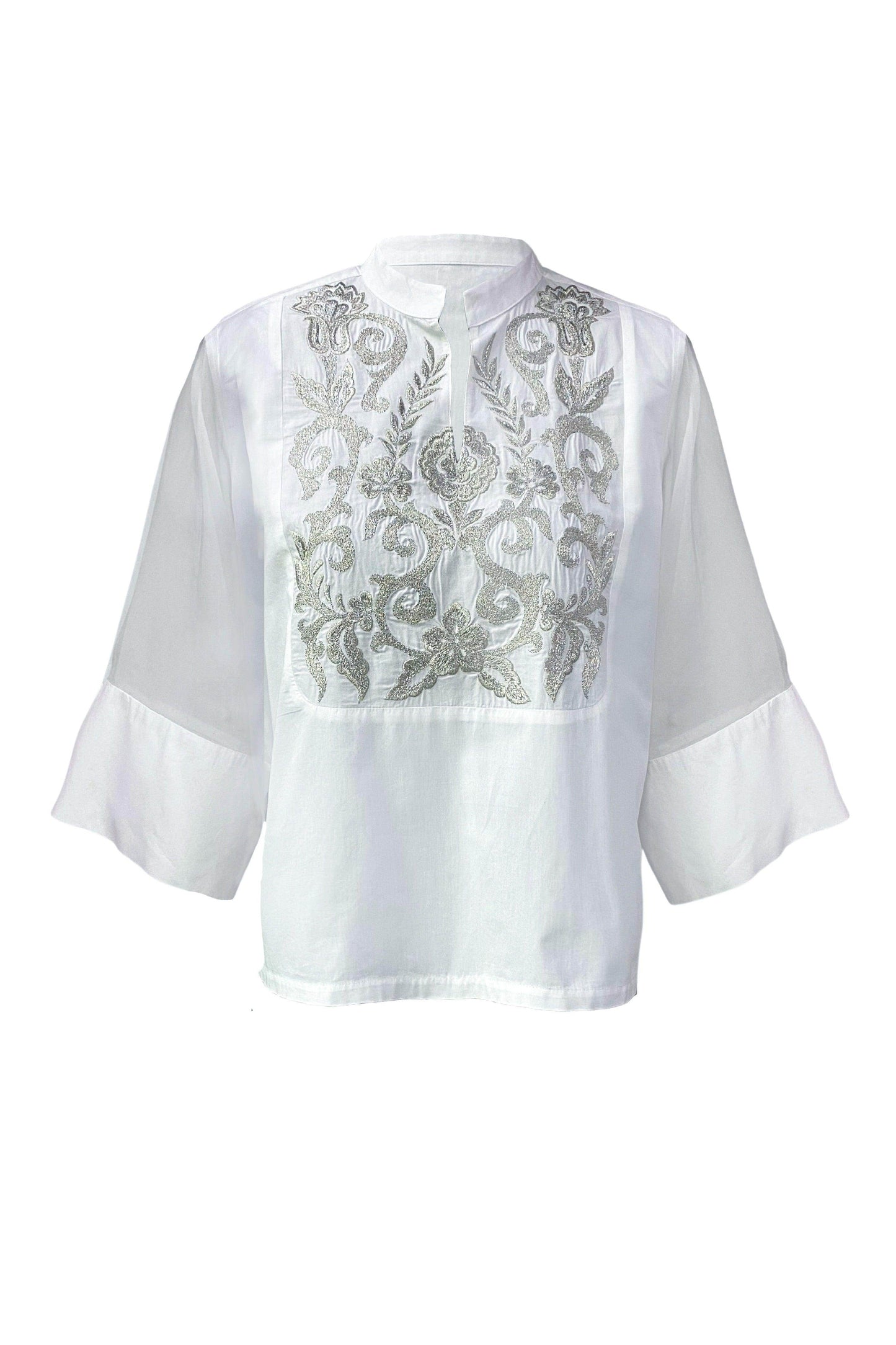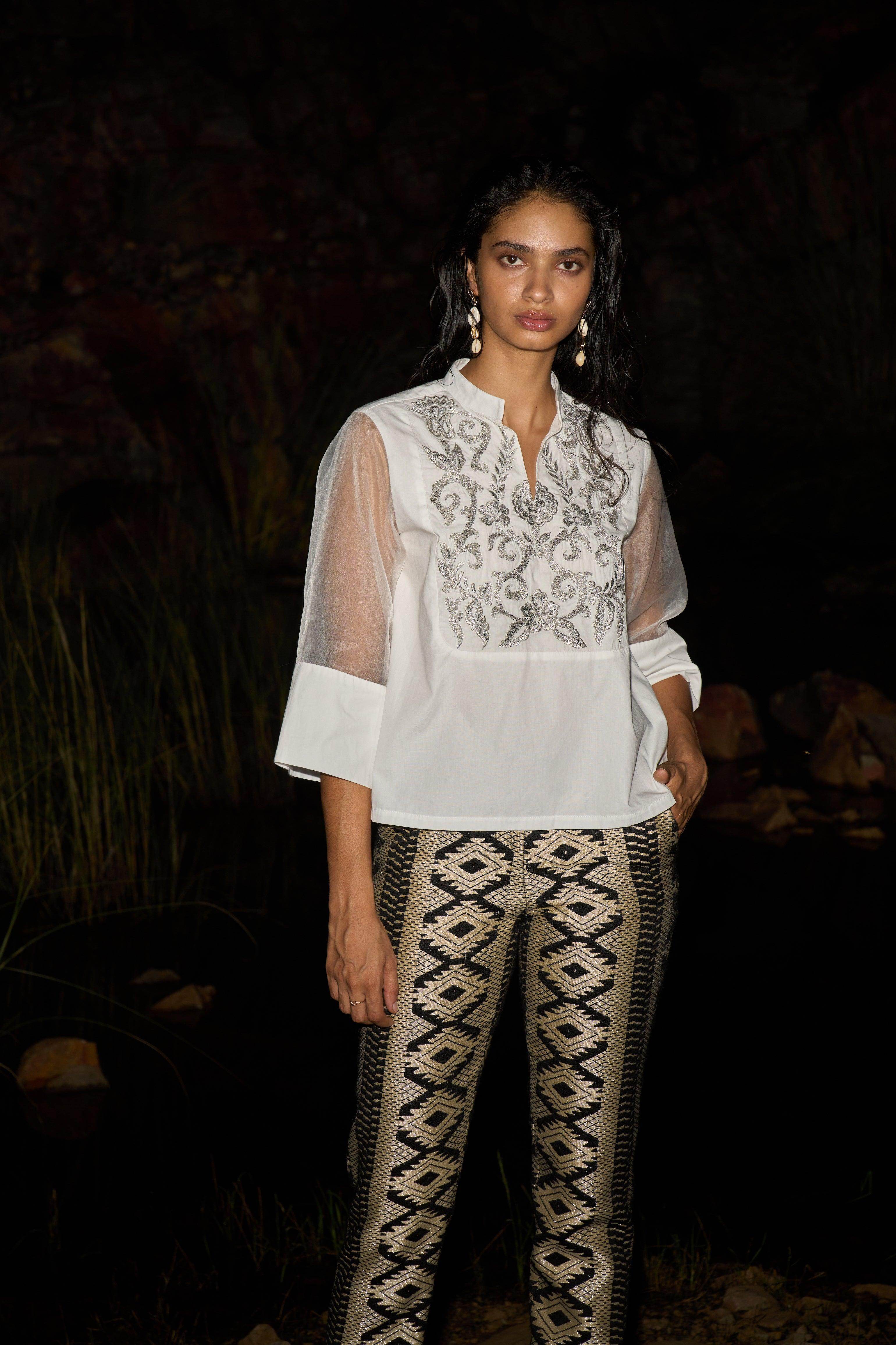 White relaxed fit top with metal thread motif embroidery at the bib. Round neck. Semi-sheer organza sleeves.