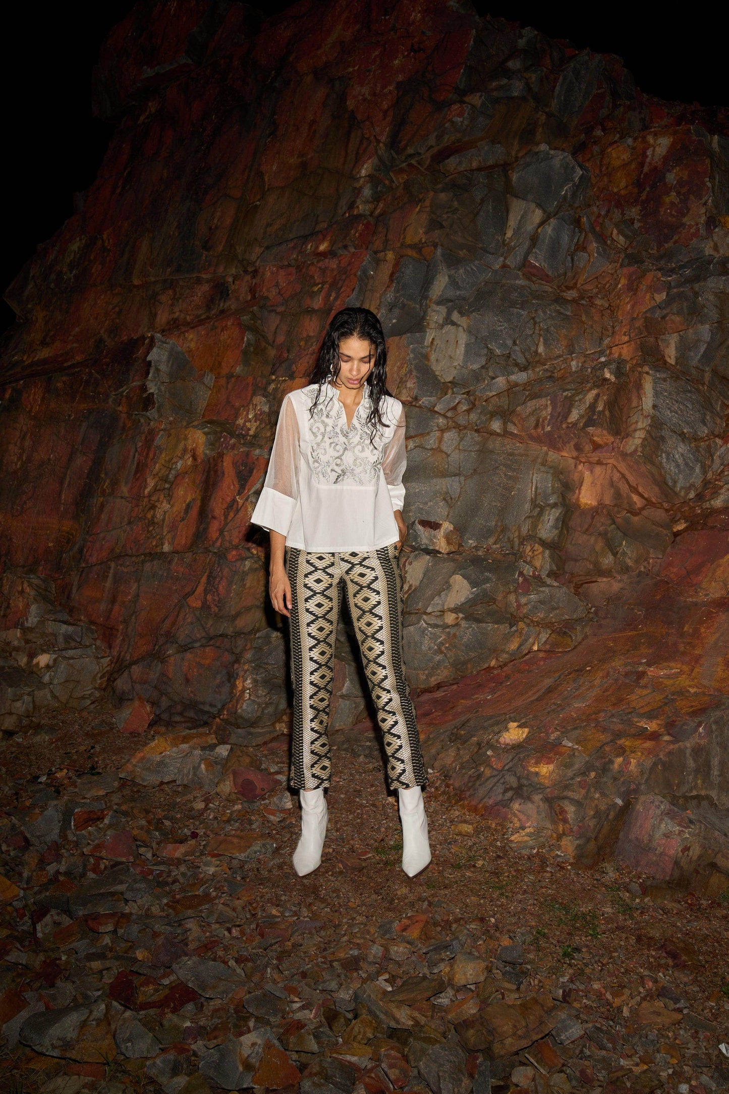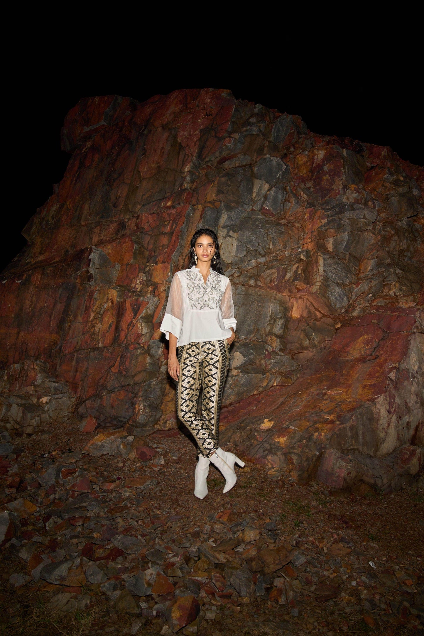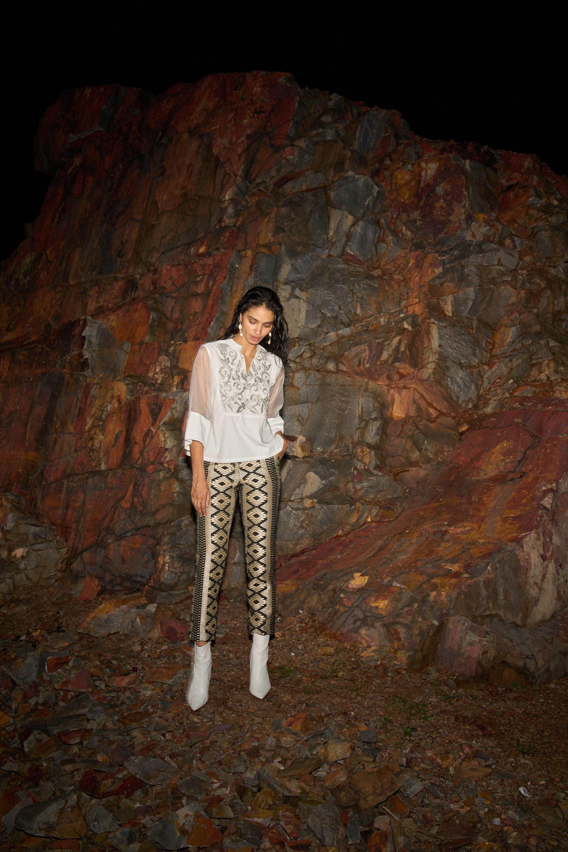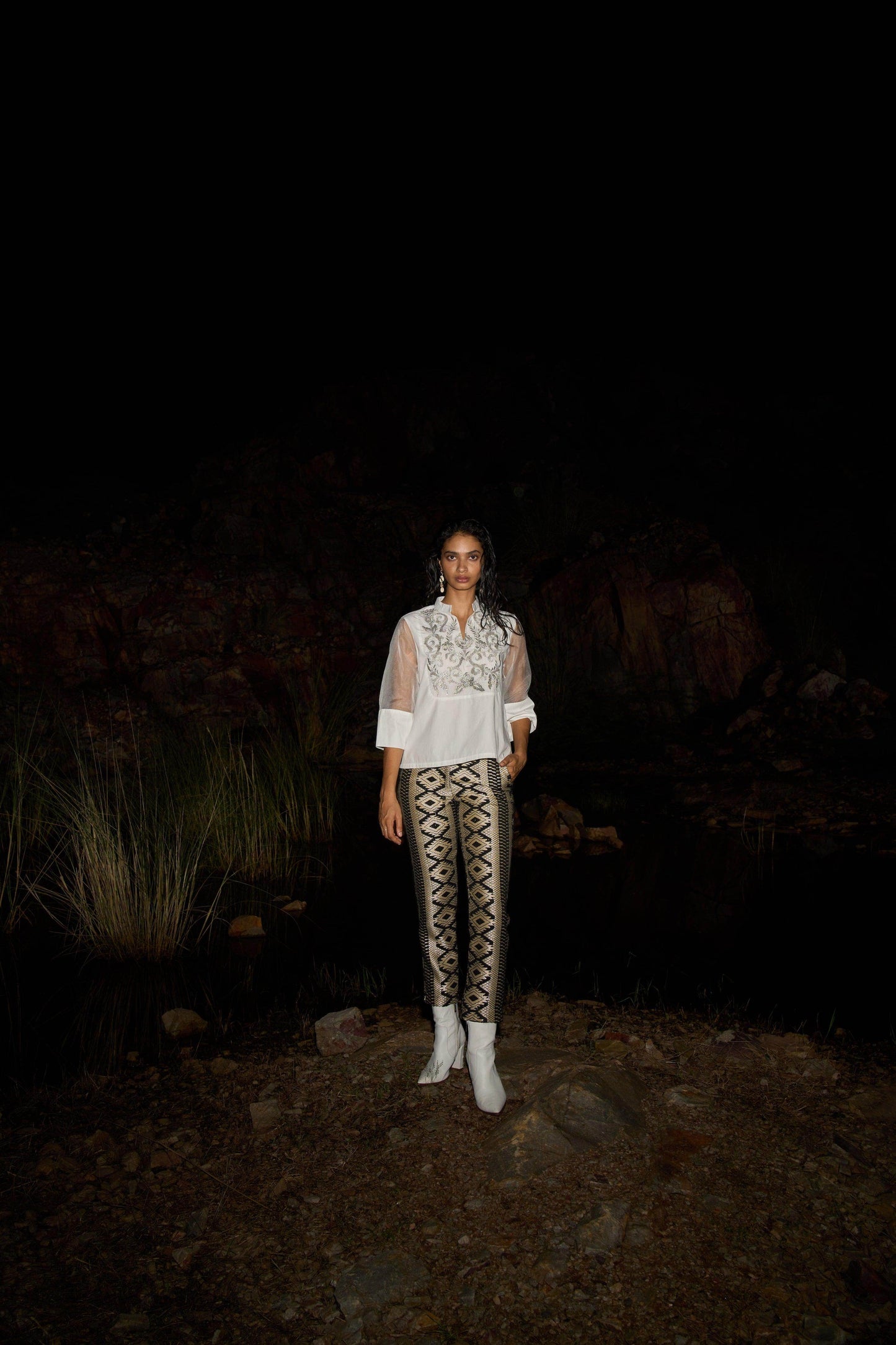 White relaxed fit top with metal thread motif embroidery at the bib. Round neck. Semi-sheer organza sleeves.