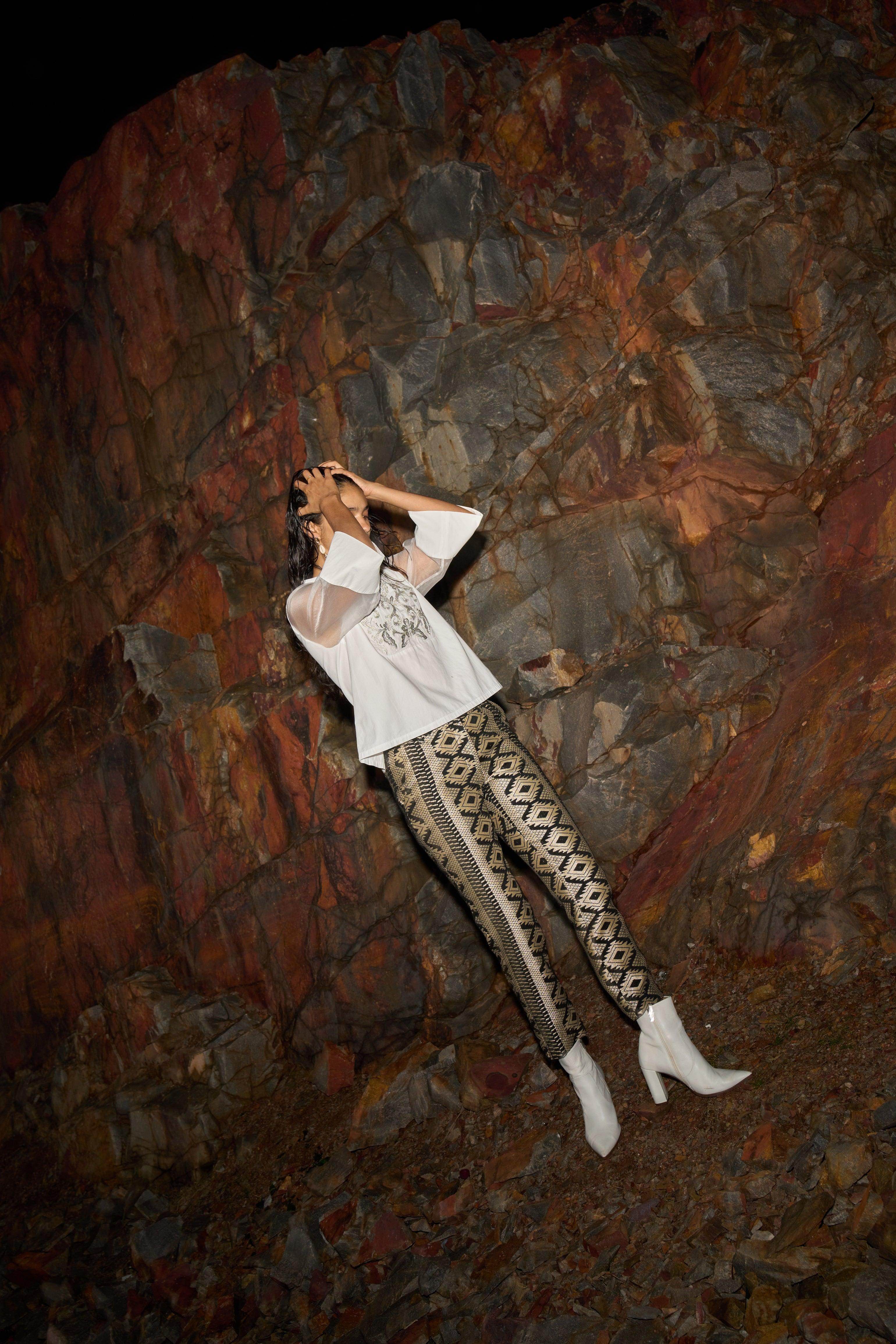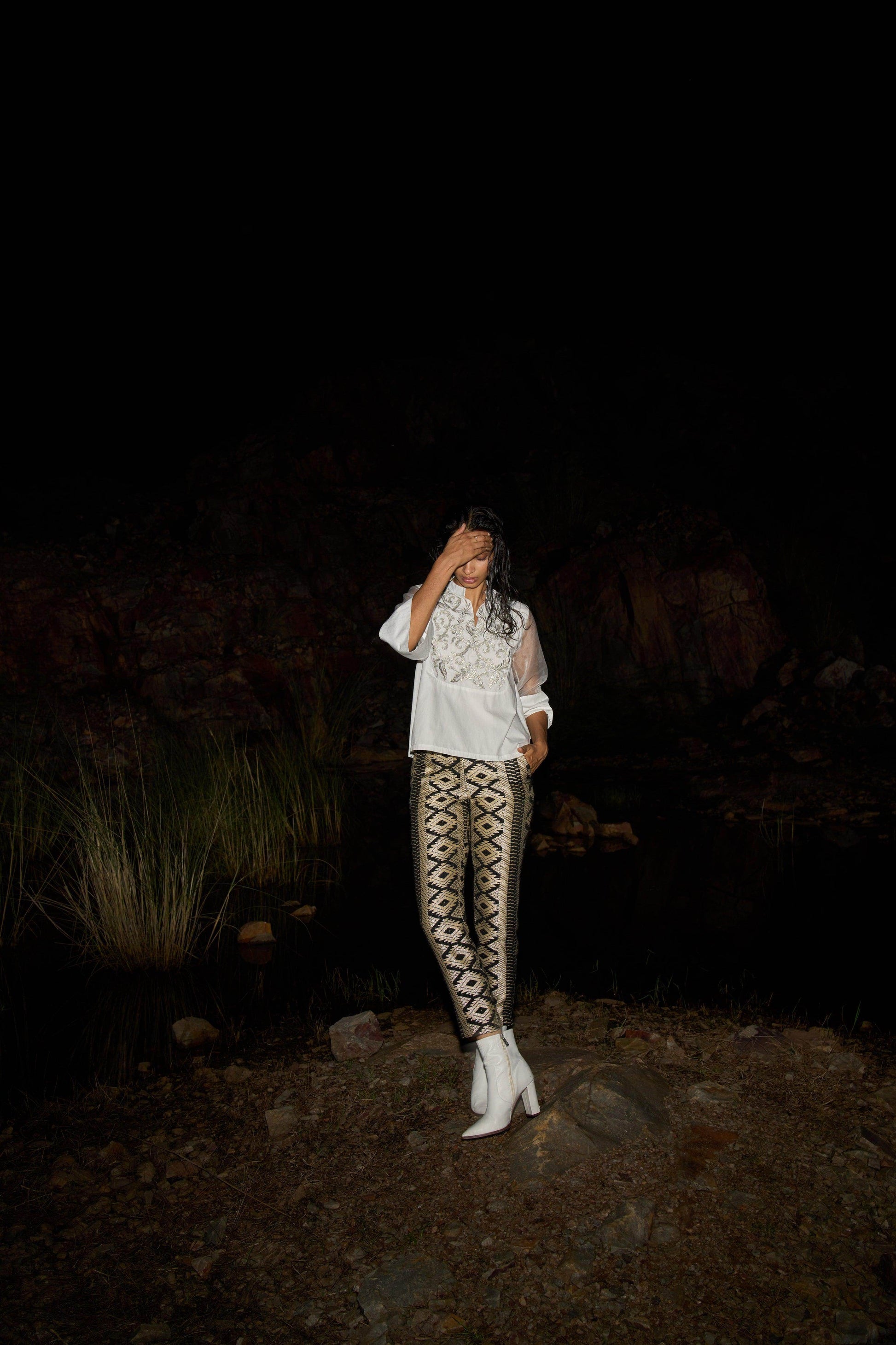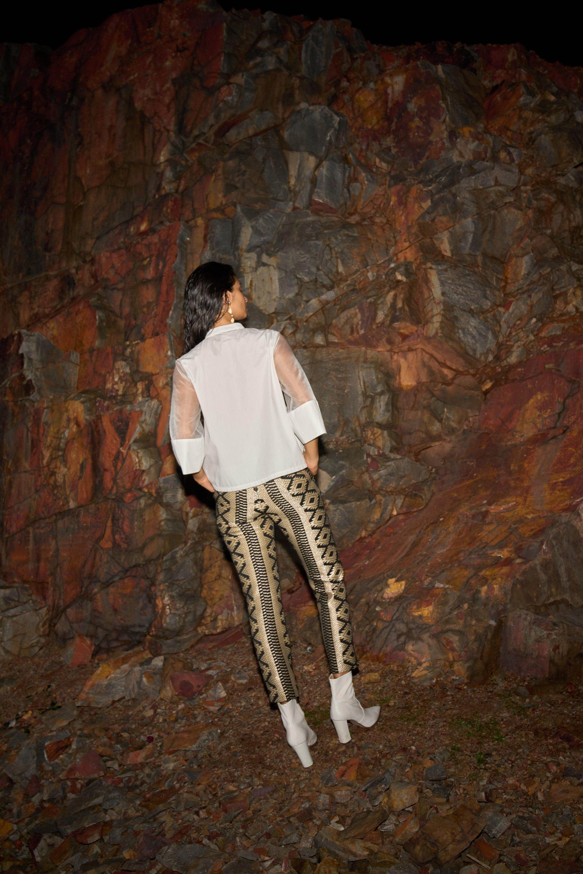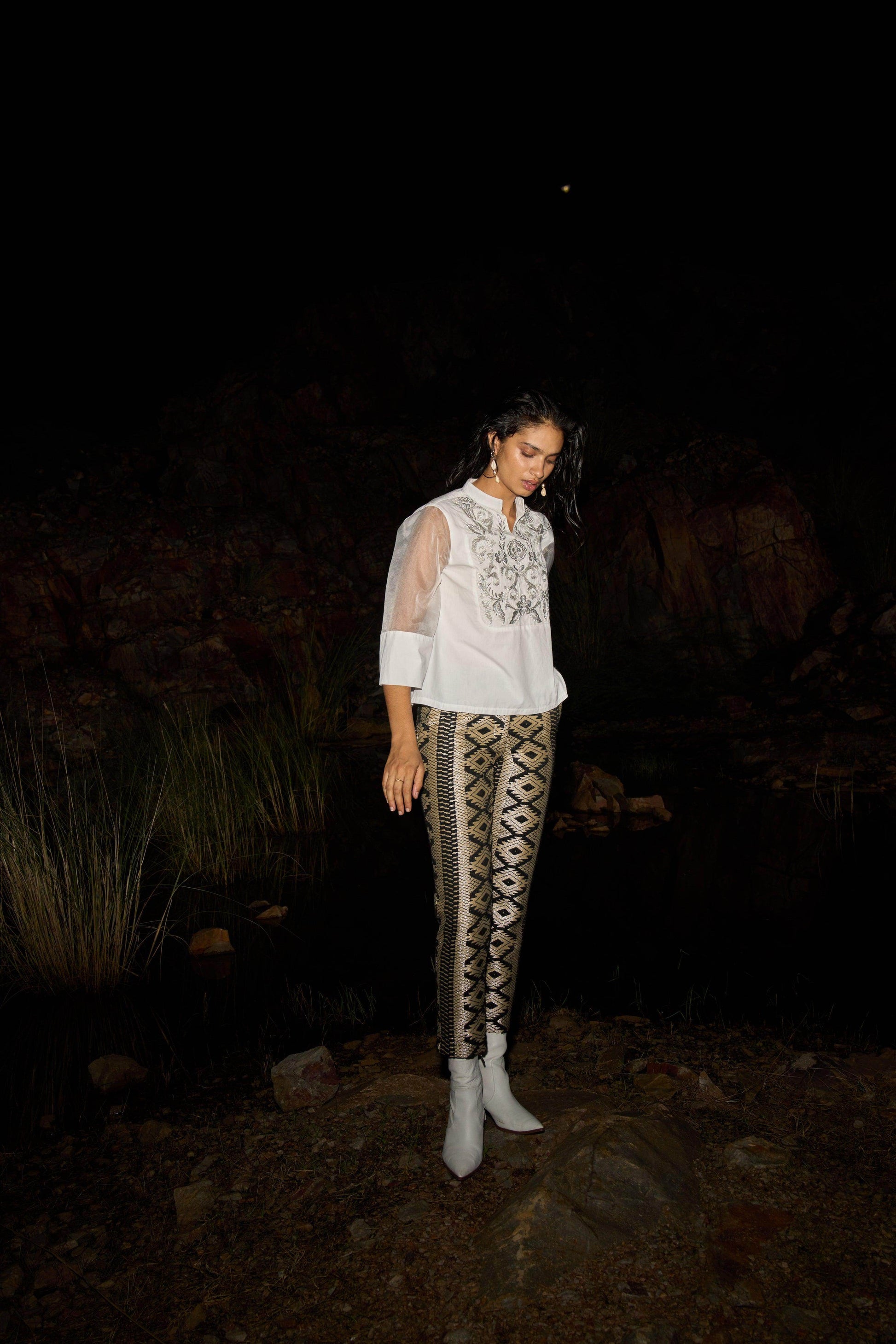 White relaxed fit top with metal thread motif embroidery at the bib. Round neck. Semi-sheer organza sleeves.