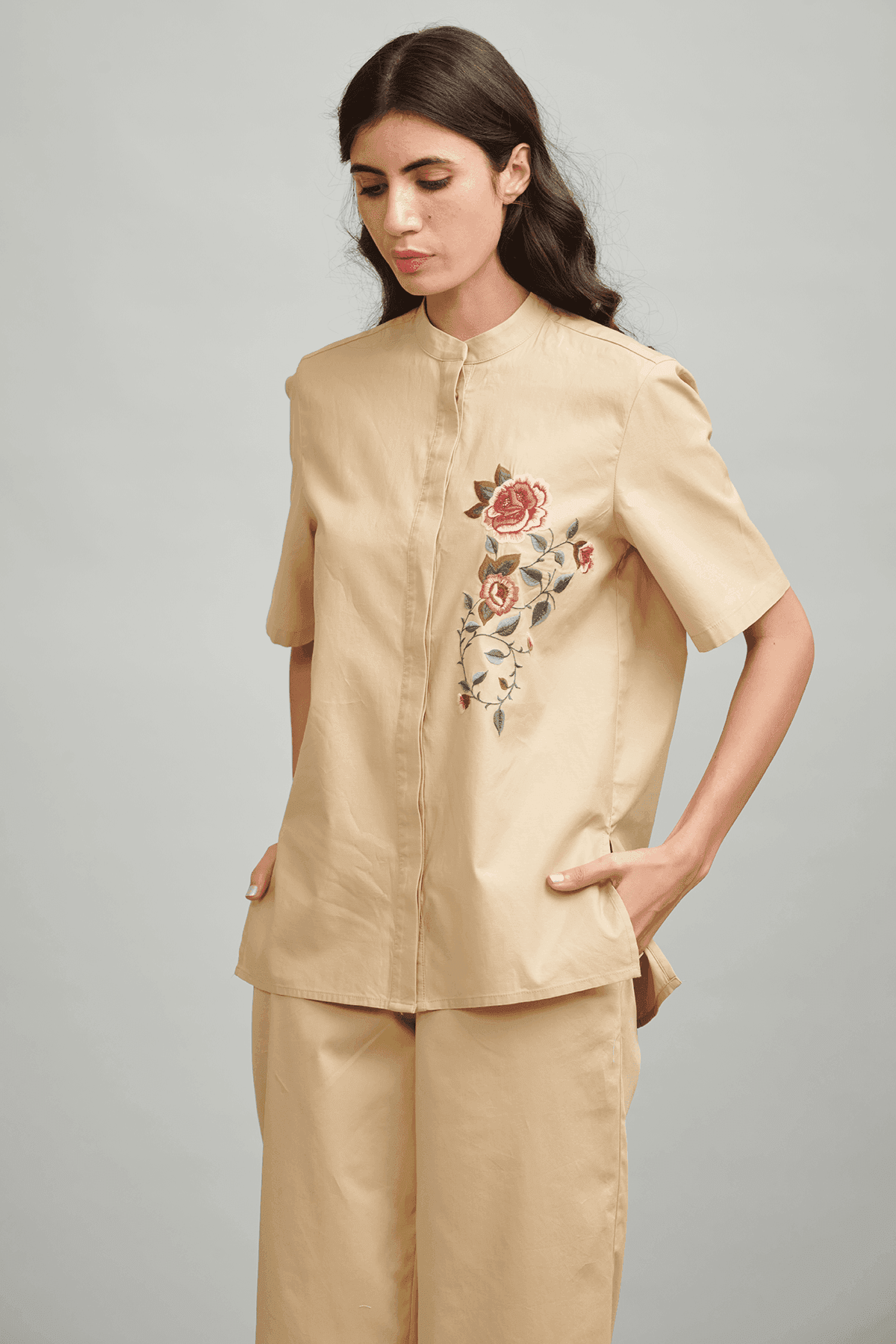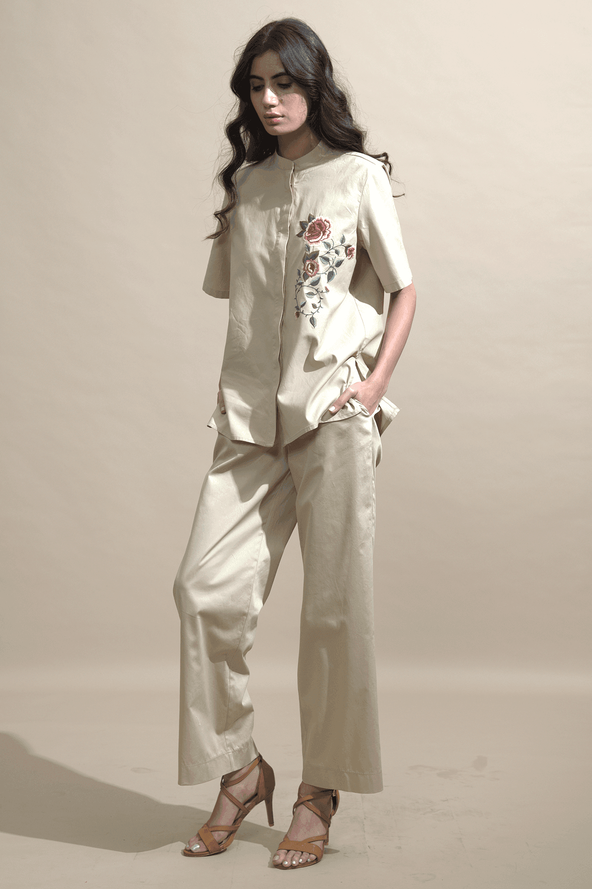 Cotton poplin concealed placket with a button-front shirt. Band collar and short sleeves. Placed floral multicolor embroidery. Paired with a matching pant with elasticated back.