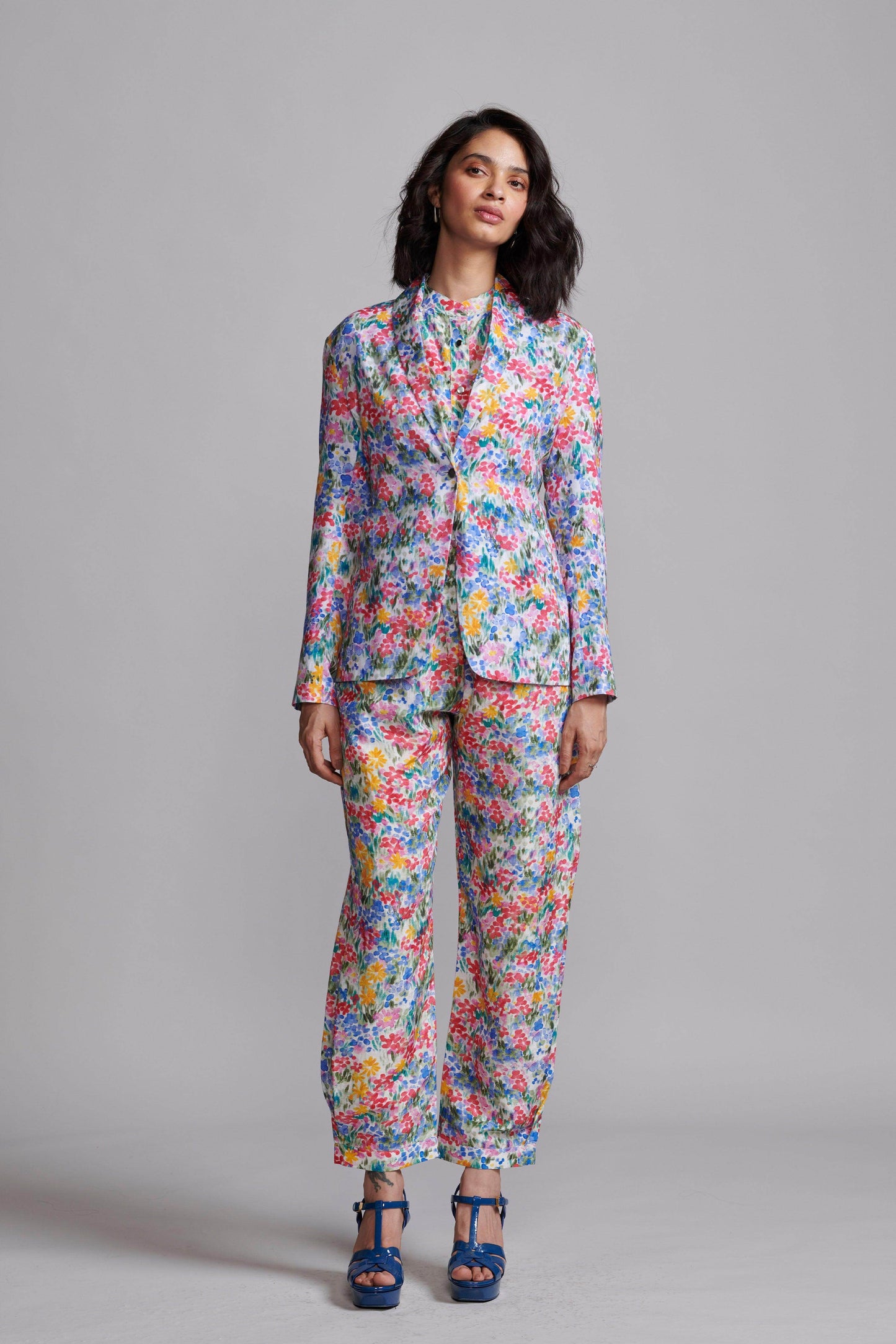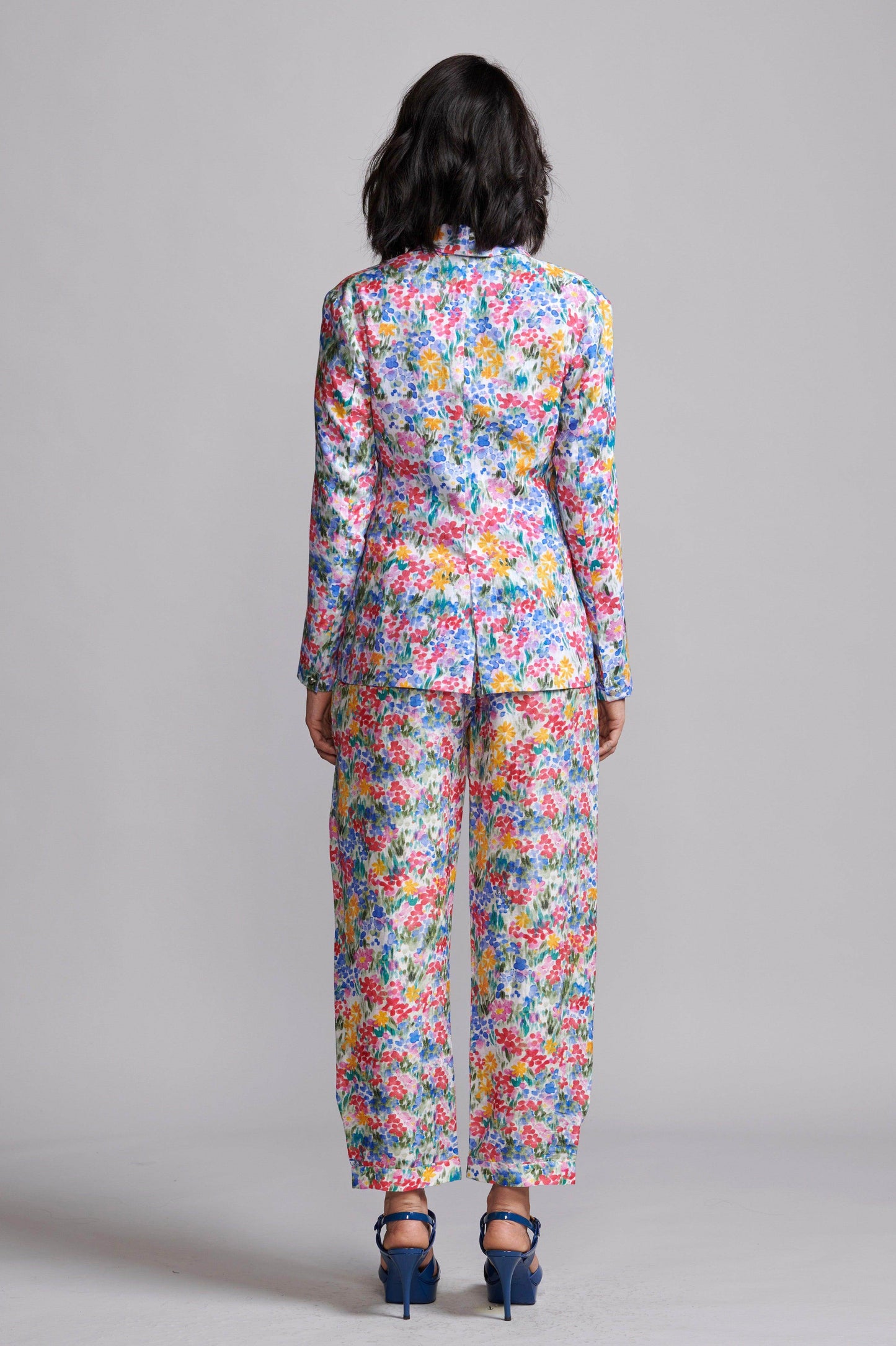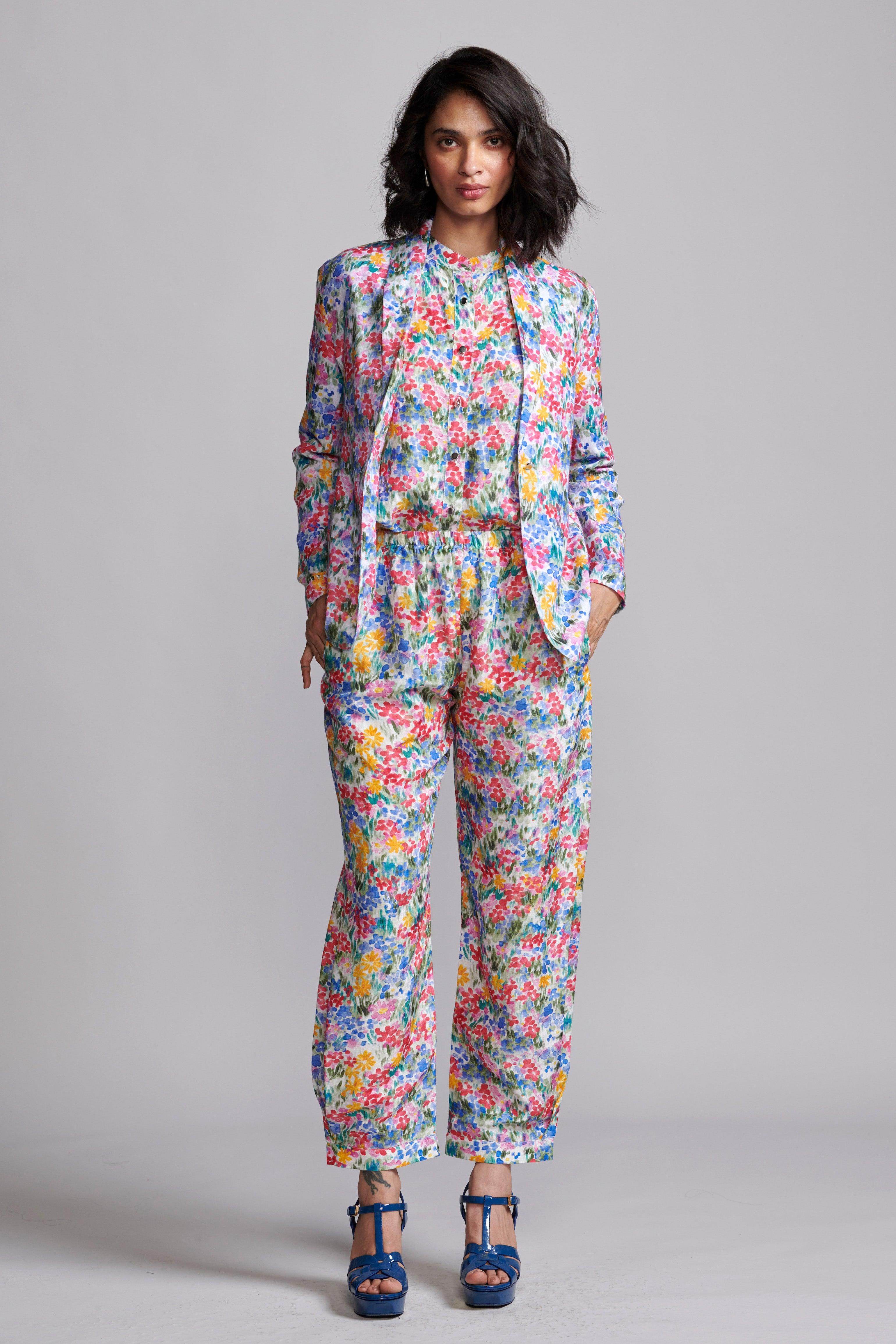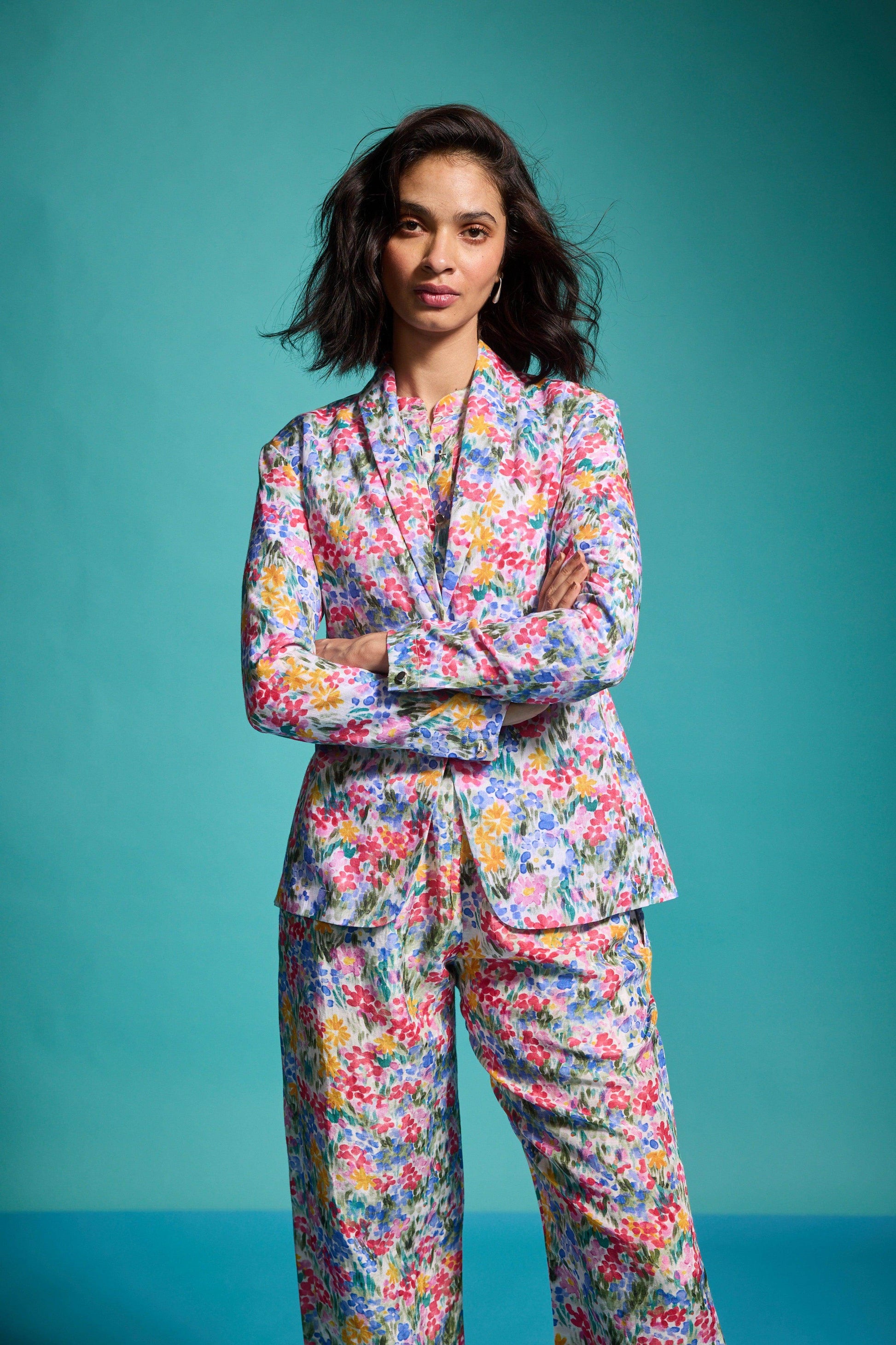 Hand-painted multicolour floral print blazer in a breathable natural linen blend. Features a shawl collar and single metallic button closure at the front and cuffs. Unstructured and unlined.