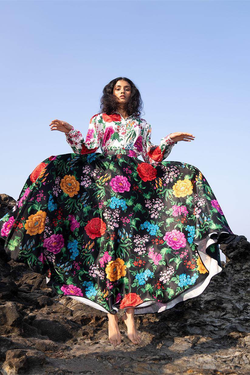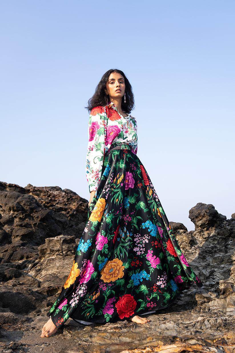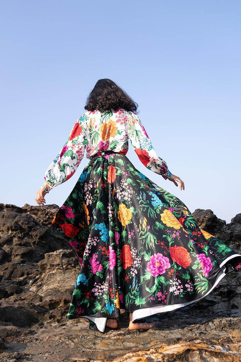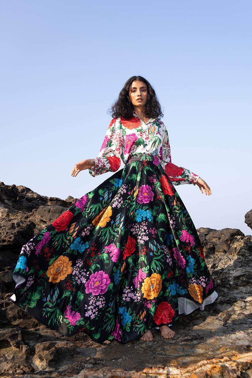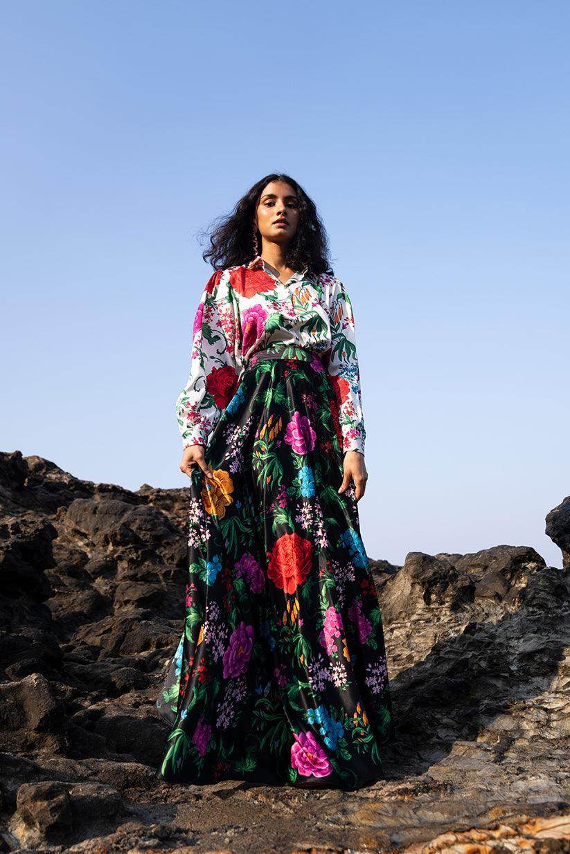 Allover multicolour floral print on a white base. Button down shirt with bishop sleeves and front button placket. Straight cut. Paired with an allover multicolour floral print on a black base maxi skirt in flowy satin with a zip closure on the side.